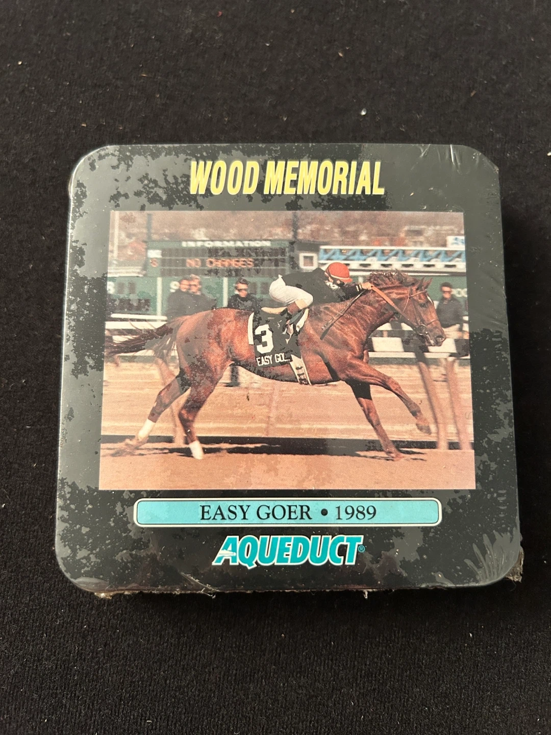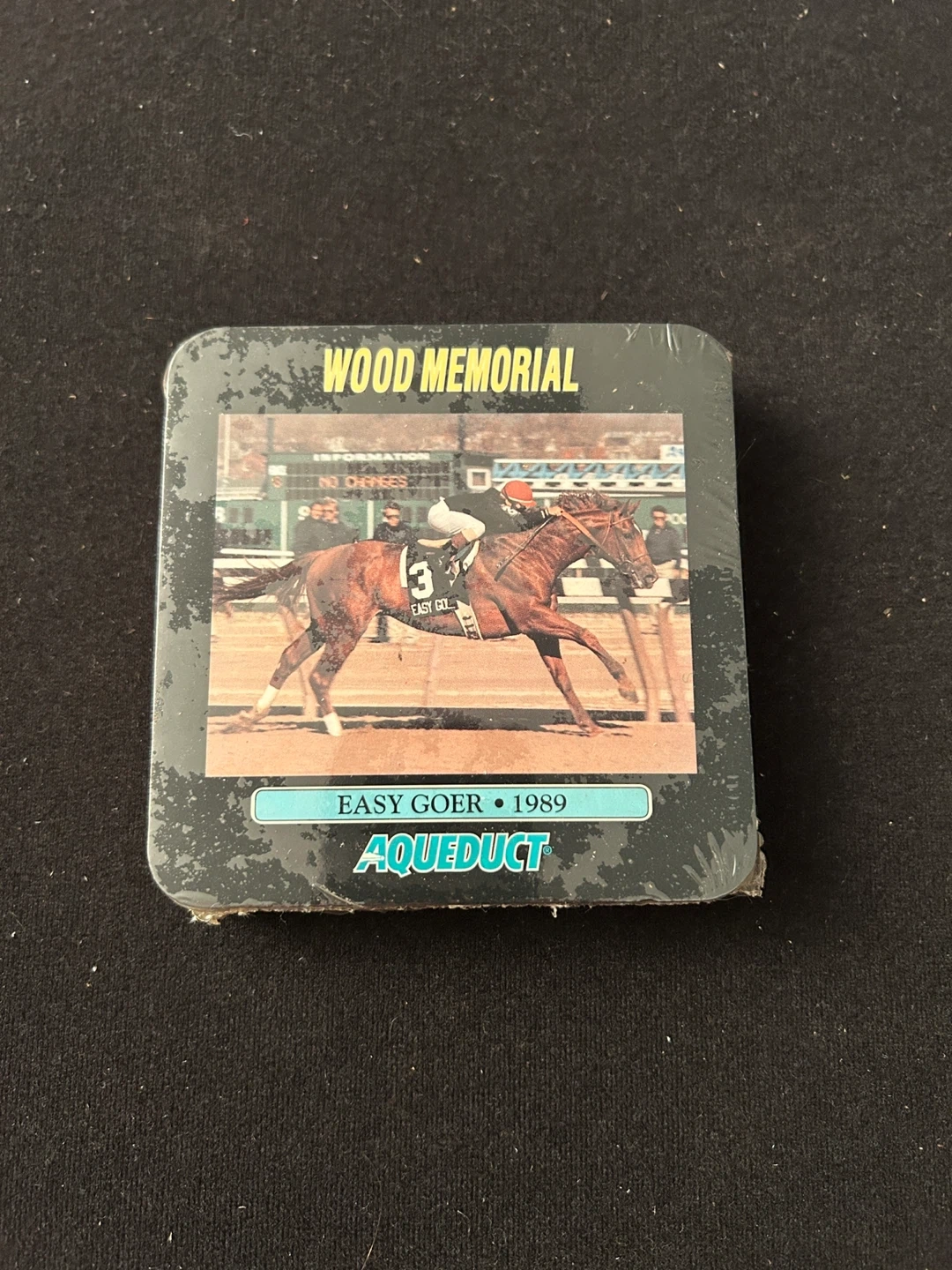Vintage, Set of (4) Four Coasters with the top coaster featuring a photo of the racehorse Easy Goer from the 1989 Wood Memorial at Aqueduct Racetrack. Brand New, Sealed Packaging. The other 3 Coasters may feature other horses and jockeys. * The coaster set is a collectible item. * Similar items have been sold on online marketplaces like e Bay for $25+ pre-used. Buy it here, Brand New and in a Sealed unopened package. Please be able to meet in Forest Hills, Queens, occasionally in Manhattan, and take a look at my other postings too