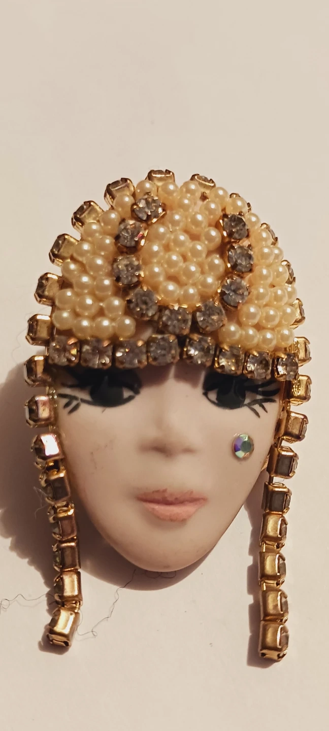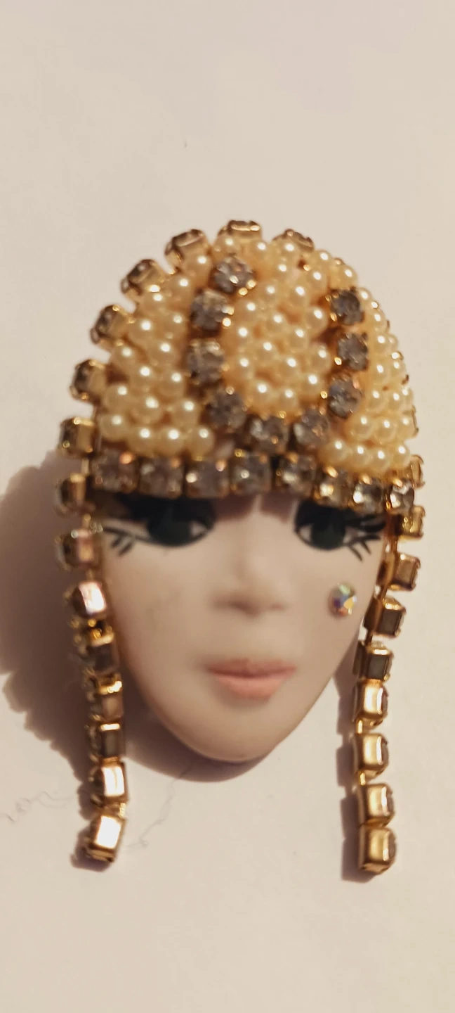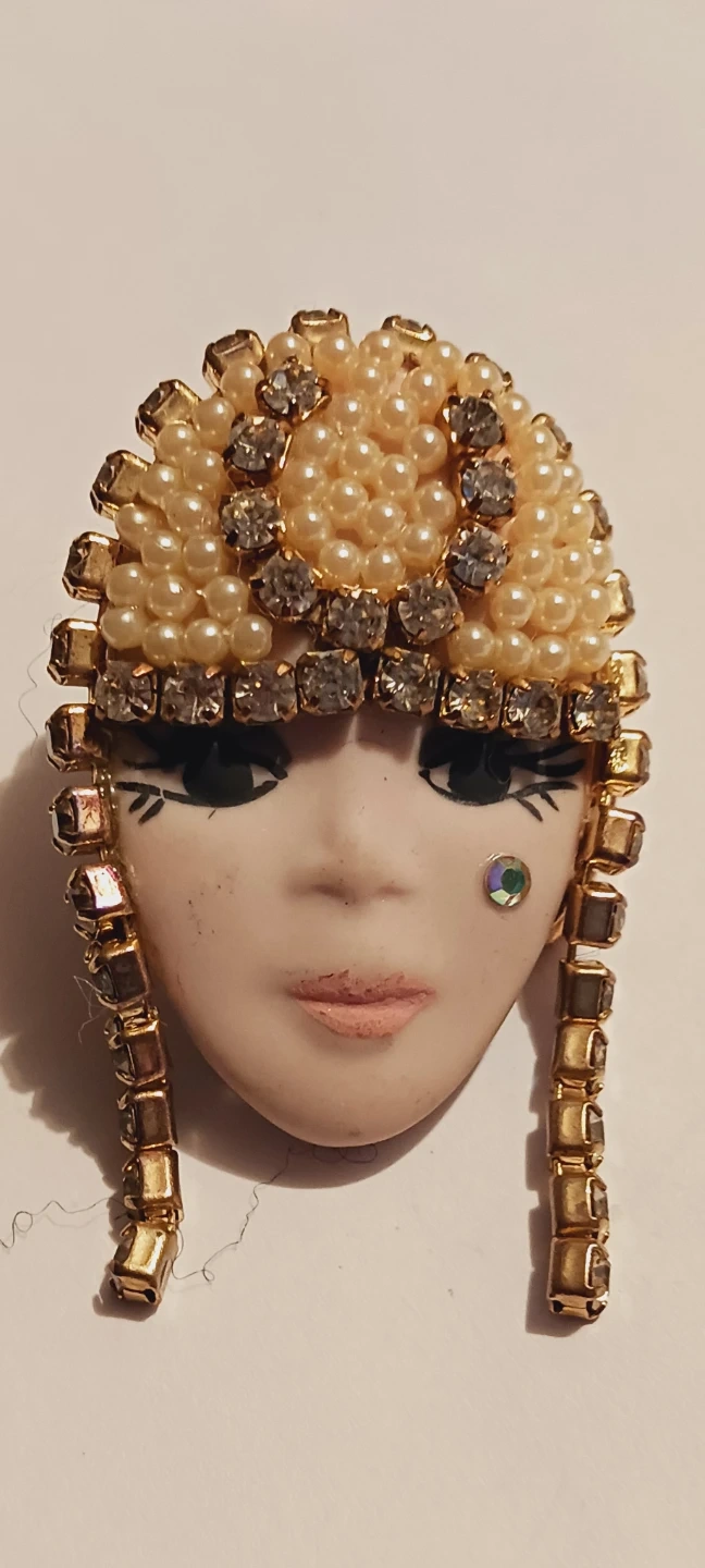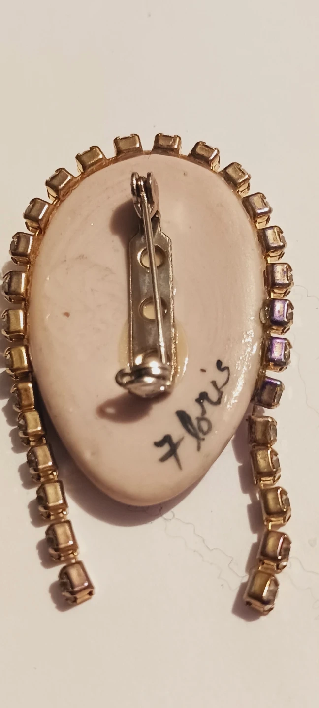 1000+ABSOLUTELY GORGEOUS VINTAGE PORCELAIN FACE BROOCH ADORNED WITH PEARLS AND STONES. This is a vintage brooch signed 'Floris' on the back. It features a face design with pearls and rhinestones. The brooch has a pin closure. 2"×1.5". Excellent condition. ALL MY PRICES ARE NEGOTIABLE !!