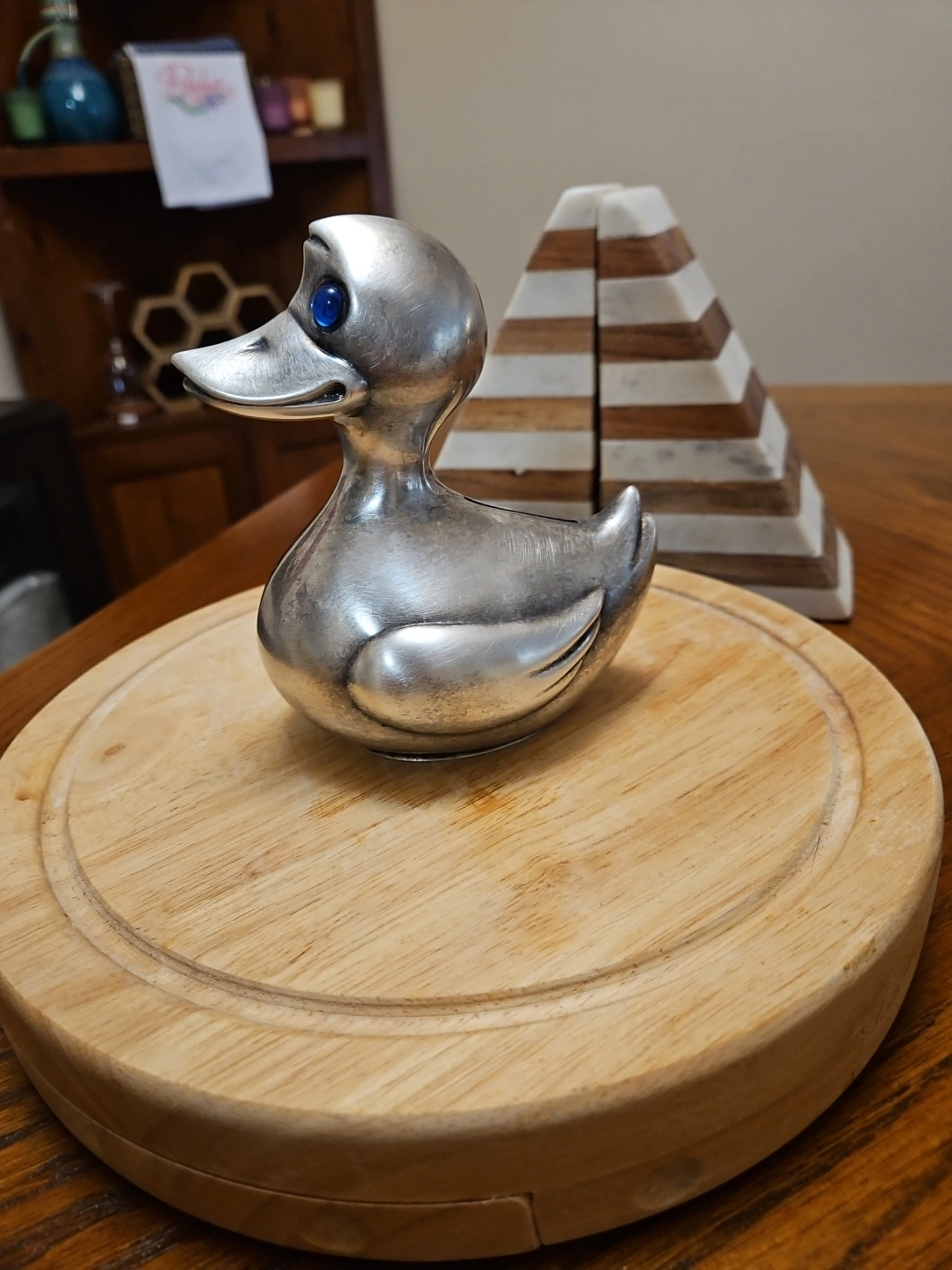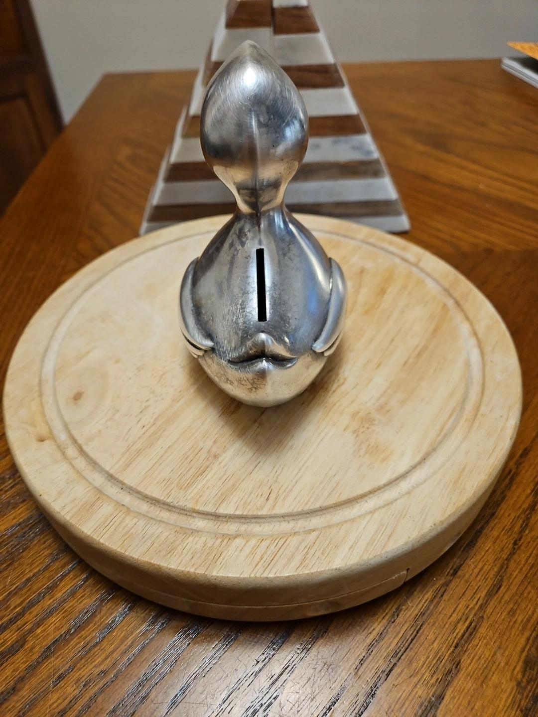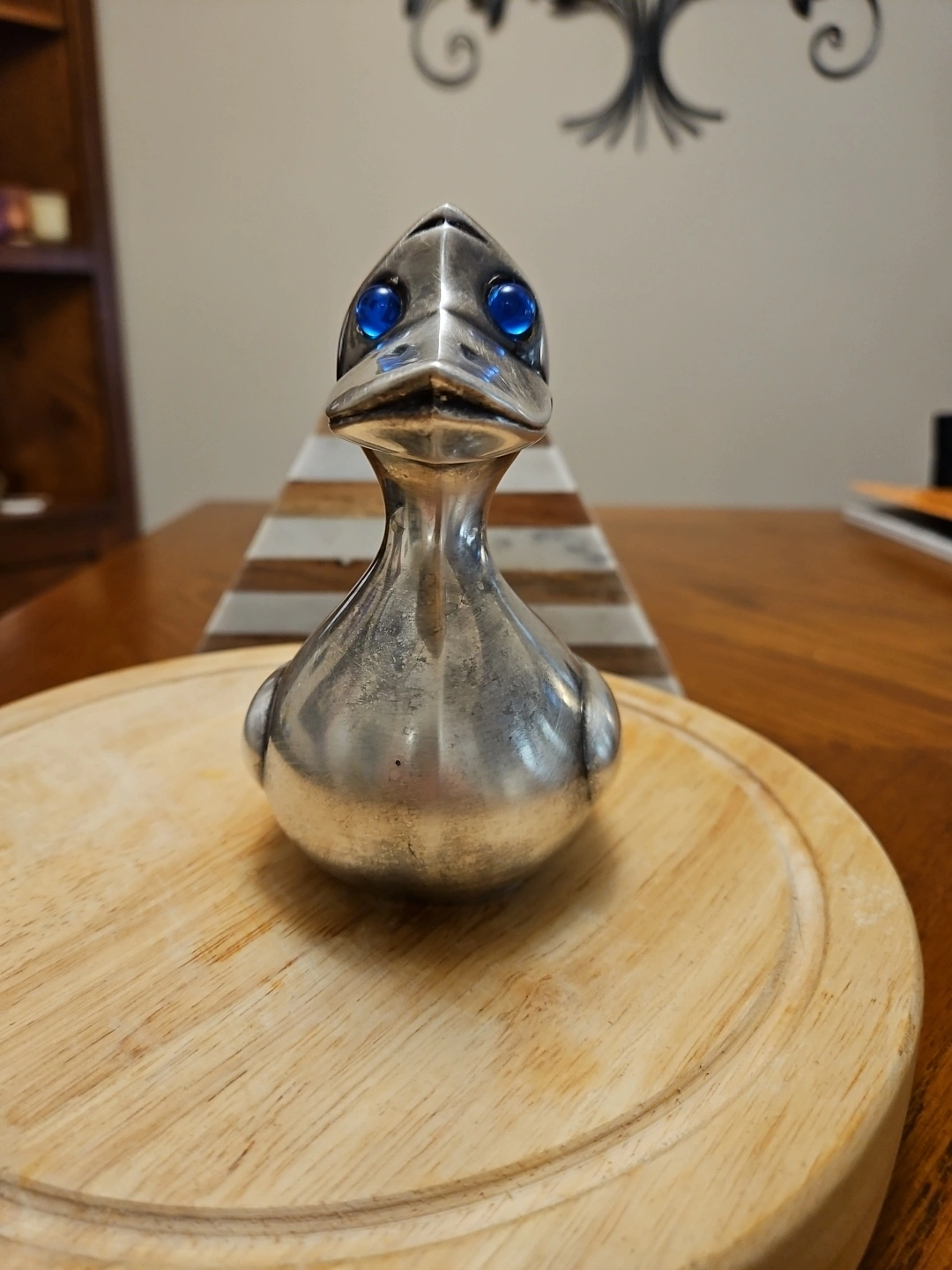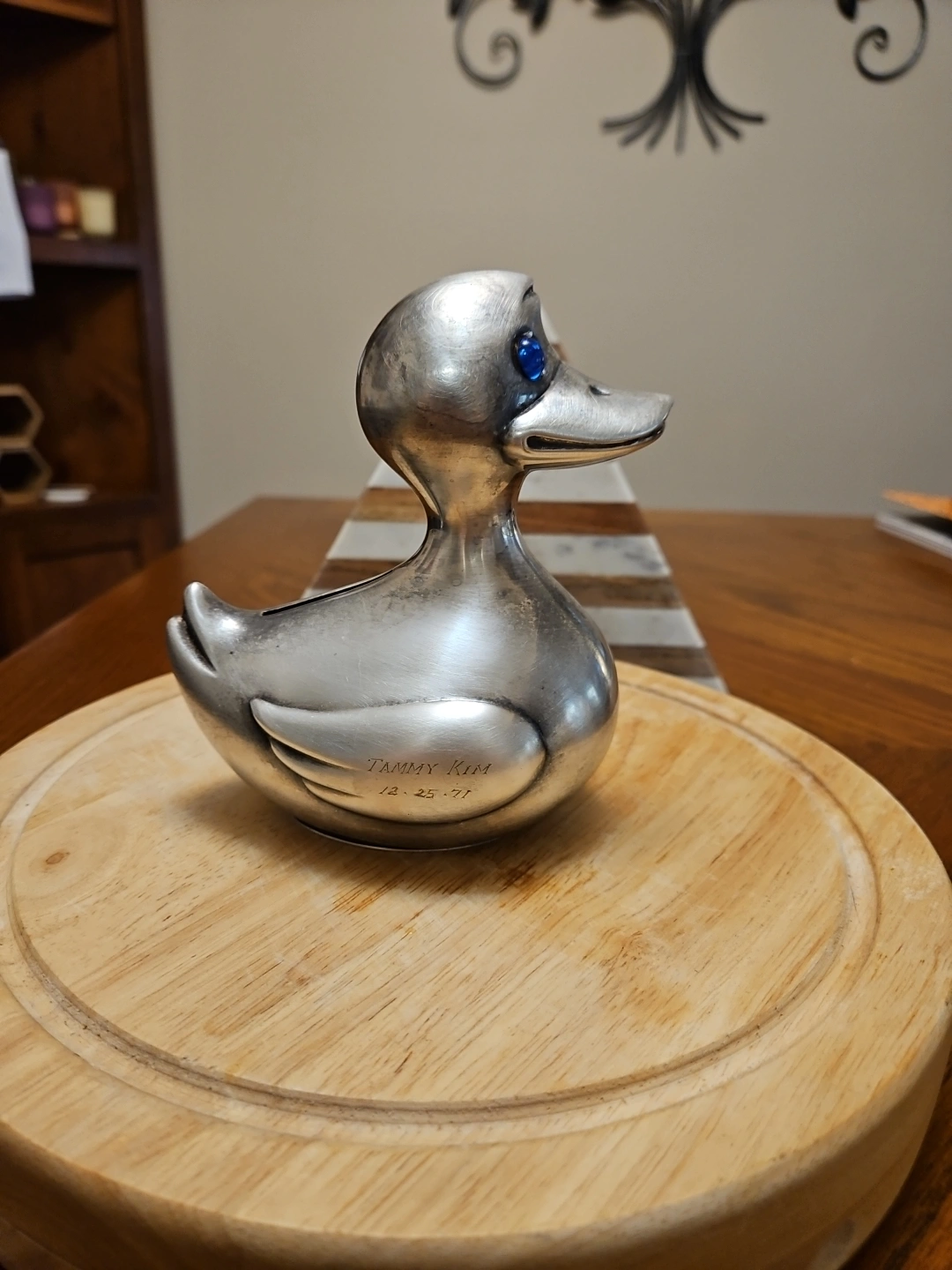 Selling a vintage silver duck coin bank. It has blue eyes and a slot in the back of its head for coins. There is an inscription on the side that says 'Tammy Kim 12-25-77'.