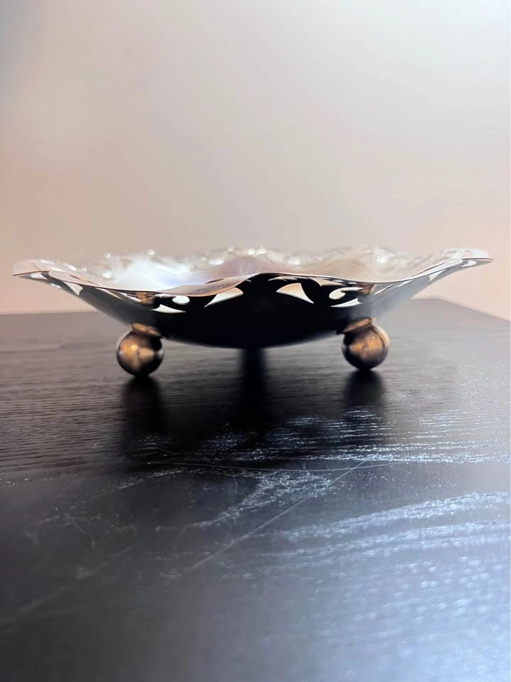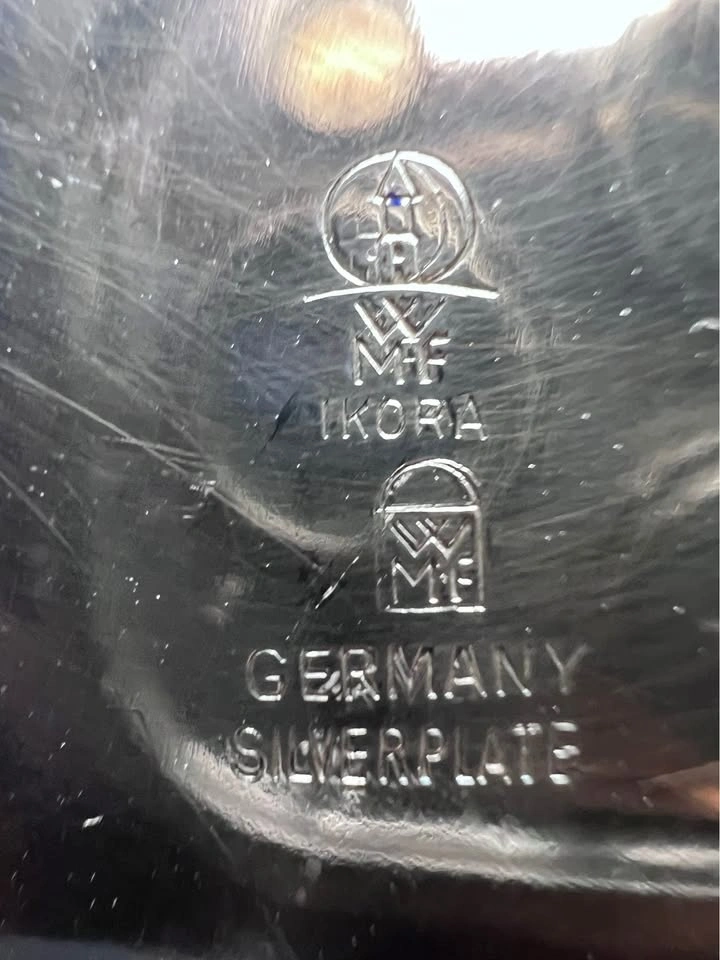 98This vintage WMF Ikora dish is a beautiful addition to any collection. The piece features a scalloped edge and footed base, adding to its elegant appearance. Made in Germany, this mid-century modern style bowl is perfect for displaying candy or nuts. Measures 9.5” in diameter