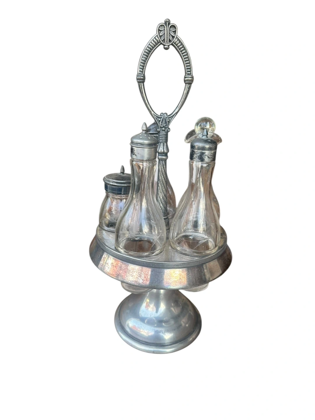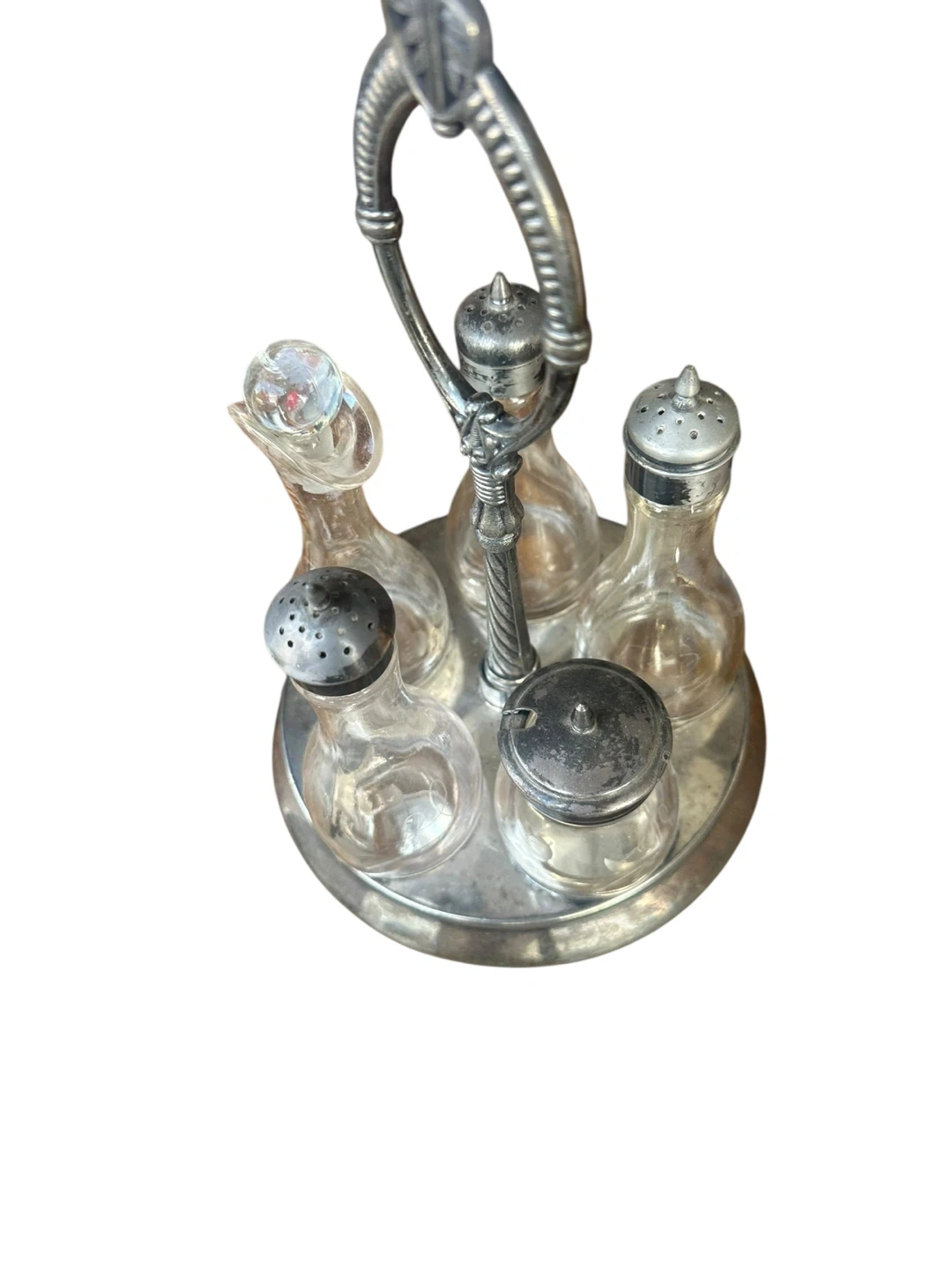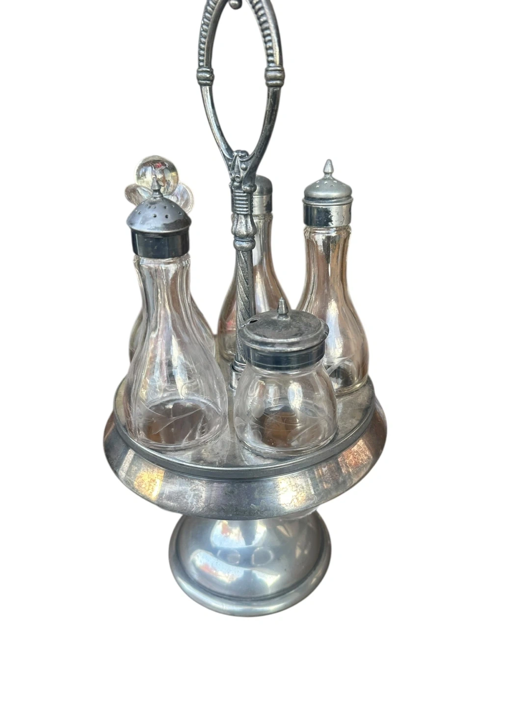 15Selling a vintage silver plated condiment set. It includes multiple glass bottles and a central handle for easy carrying. Perfect for adding a touch of elegance to your dining table!