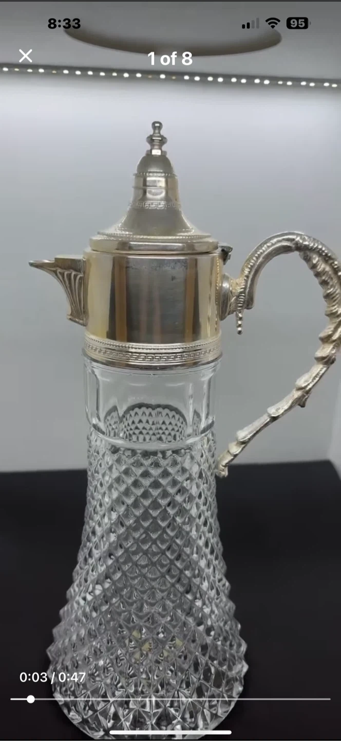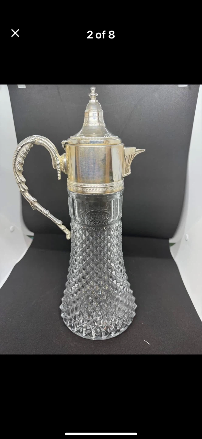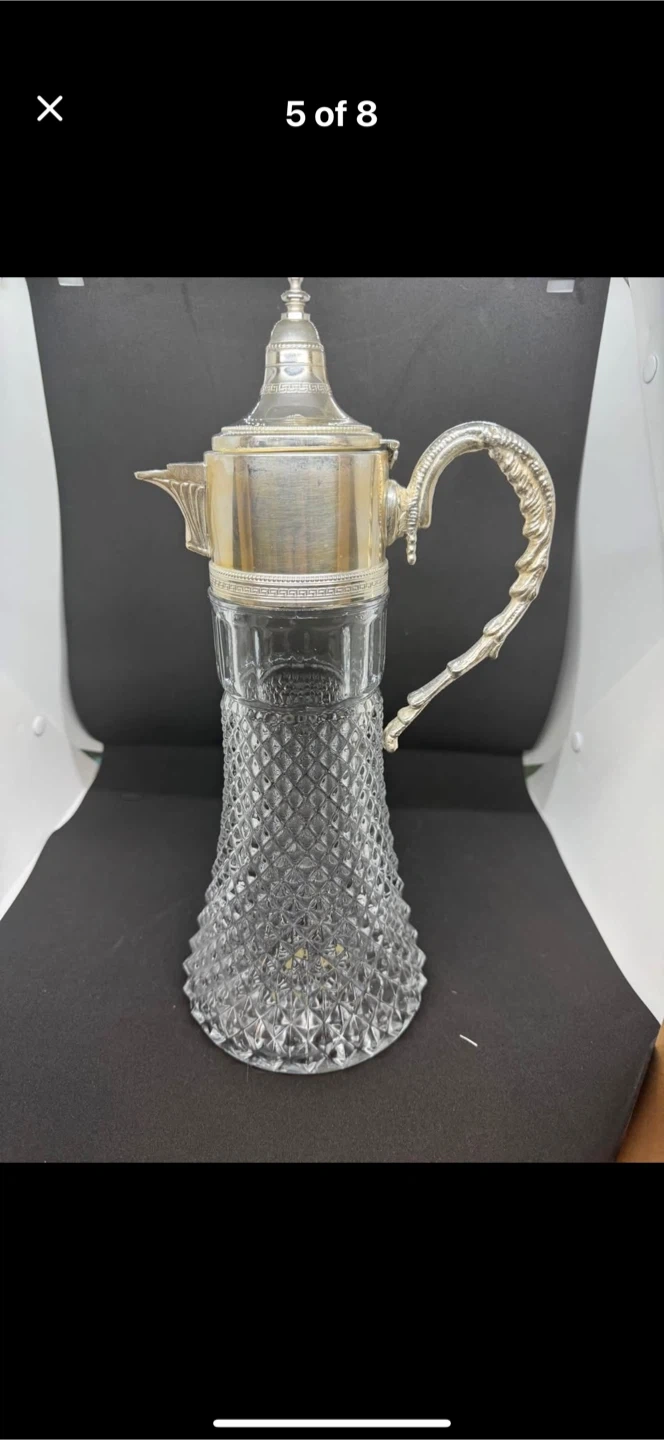 Selling a beautiful vintage pitcher with a silver-plated top and handle and a clear glass base. It has a unique textured pattern on the glass. Perfect for serving water, juice, or cocktails at your next gathering! This antique crystal silverplated Italian Art Deco dating back to 30's -40's. This wine or water claret features heavy high quality Diamond point waffle crystal cut. And stylish Silverplated. Handle and unremoveable flip. Lid top. I include the best pictures with some wear to the silver plating Size is 15" to top of lid Bottom with is about 6 1/2" wide. This antique glass is strictly hand wash only This cafe is very heavy well crafted piece of Italian history Pickup in Batavia $50 cash only please