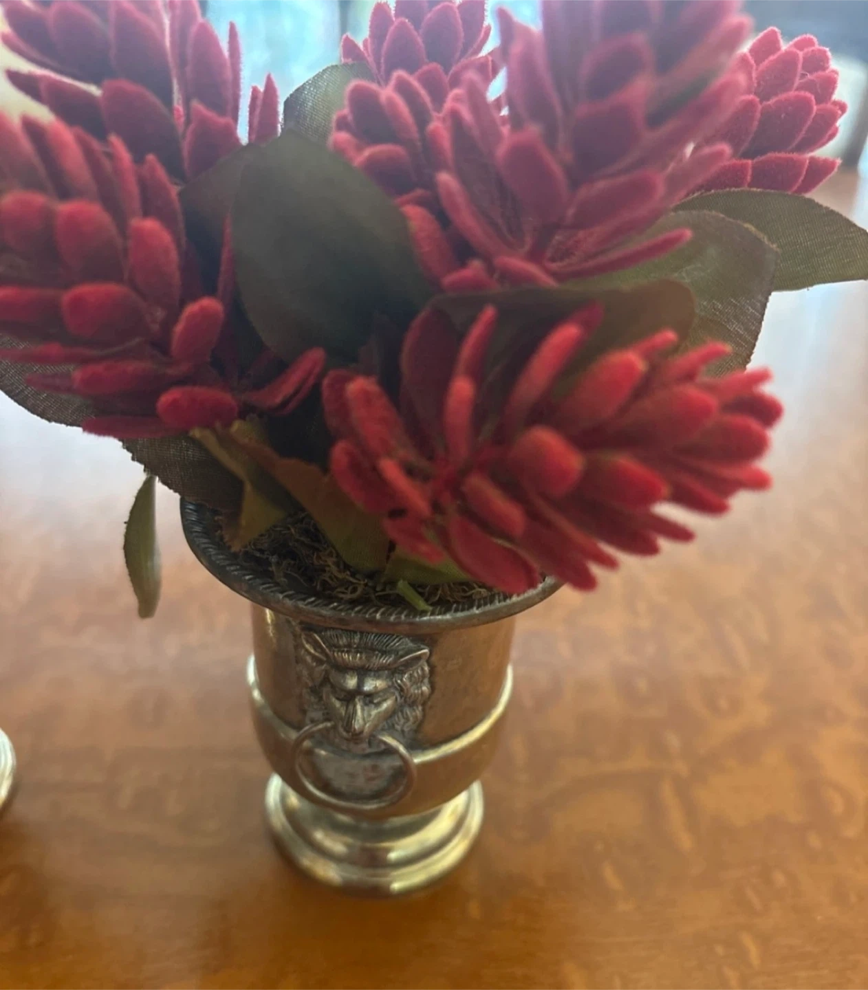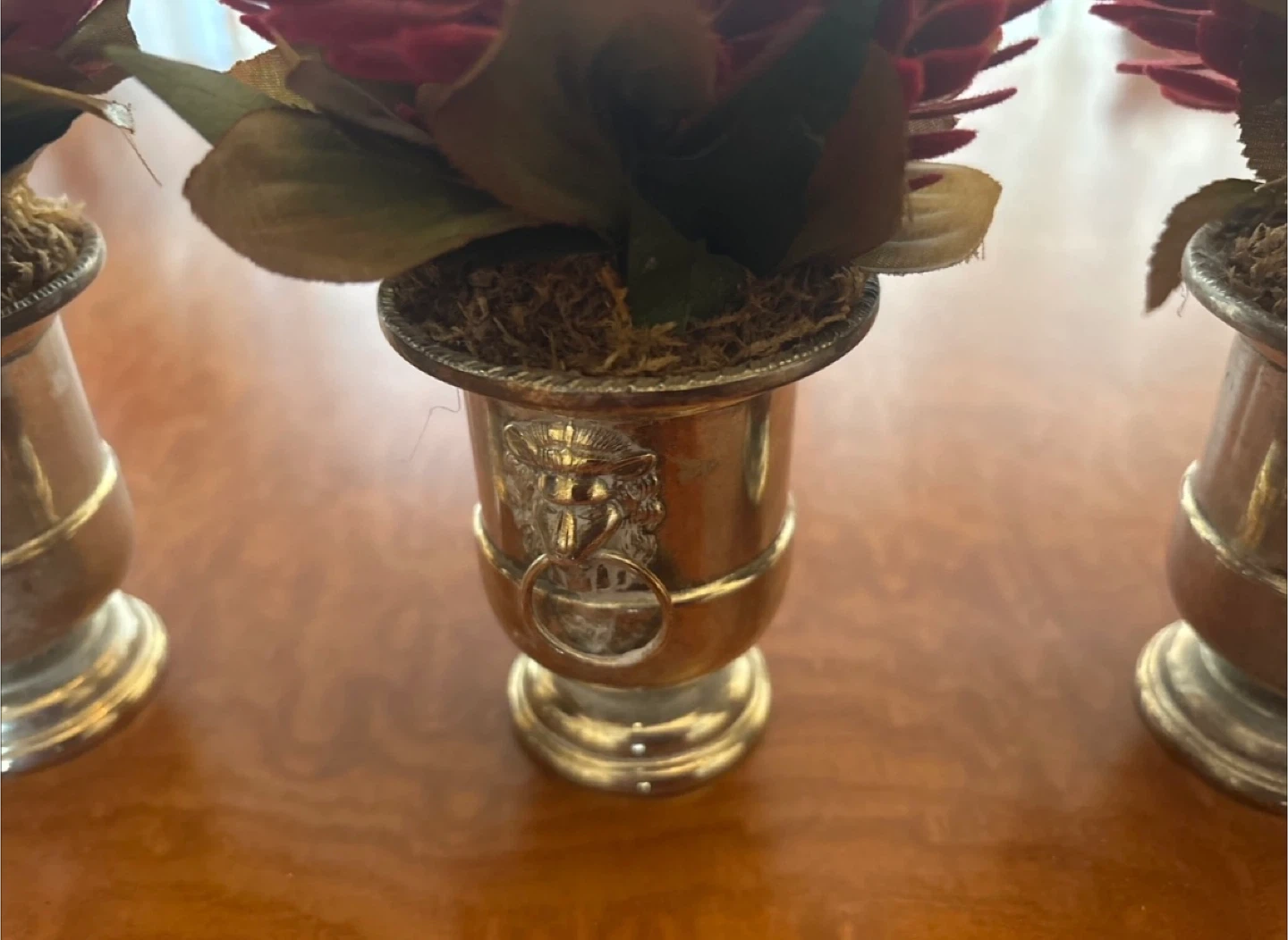 Vintage Silver Plated Mini Urns with Red Floral Arrangement