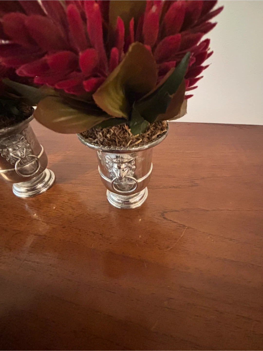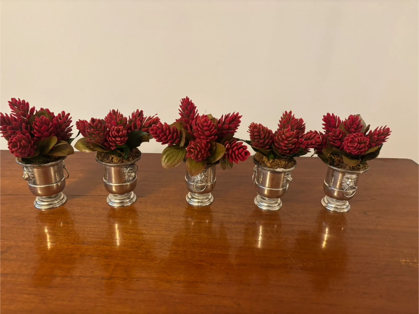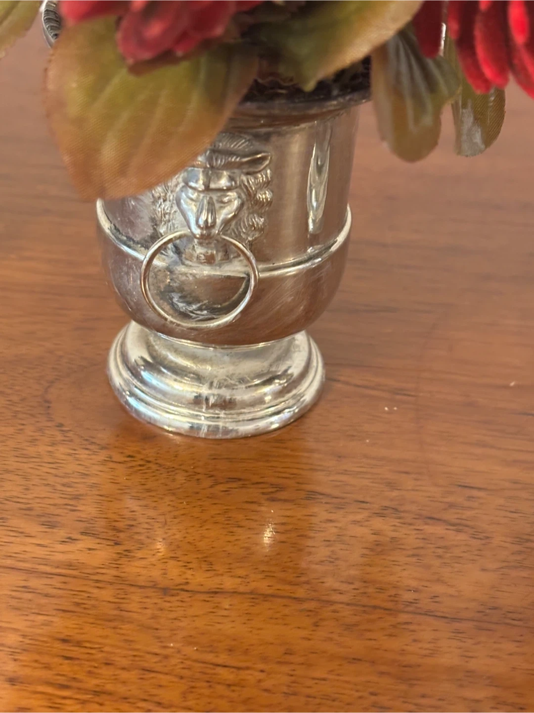 419Five miniature silver plated urns. Each urn features 2 lion heads and rings and red floral arrangement in each urn. Perfect centerpiece or table decor. Height of urn alone 3 inches with flowers 6 inches approximately