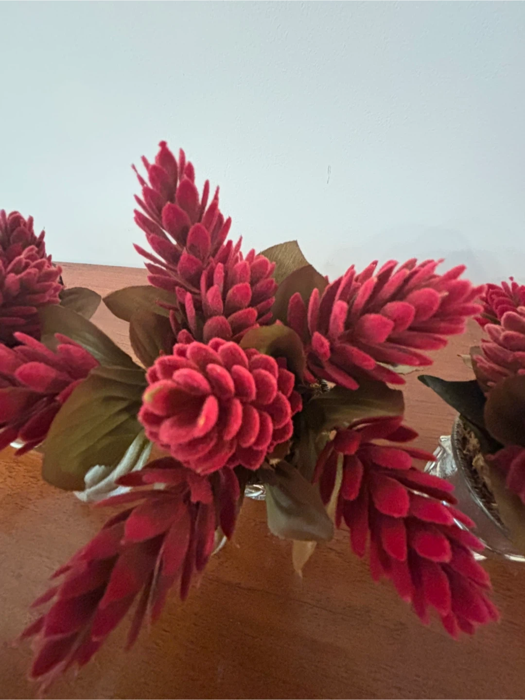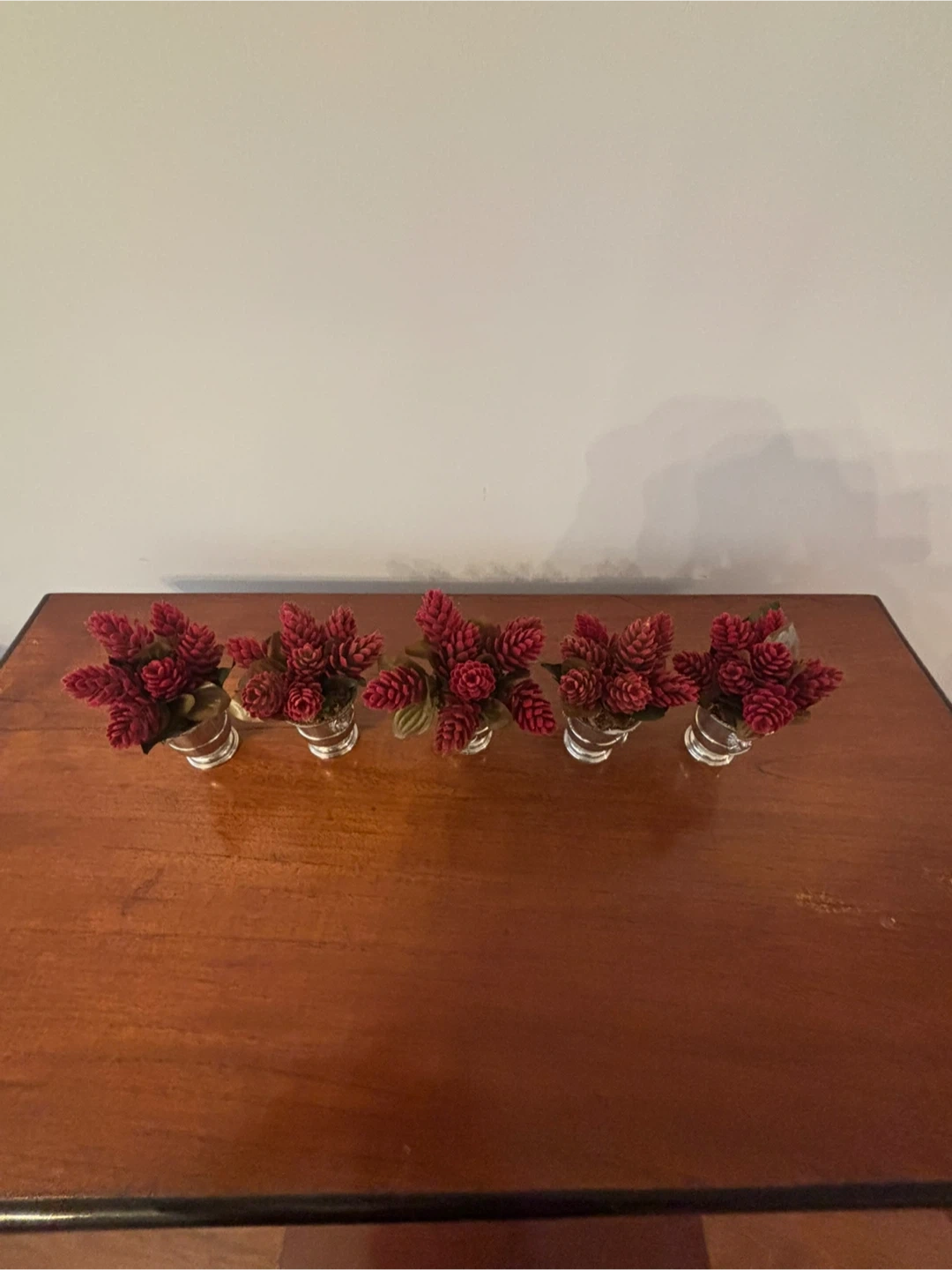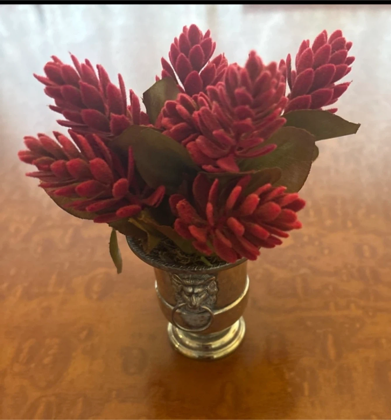 419Five miniature silver plated urns. Each urn features 2 lion heads and rings and red floral arrangement in each urn. Perfect centerpiece or table decor. Height of urn alone 3 inches with flowers 6 inches approximately