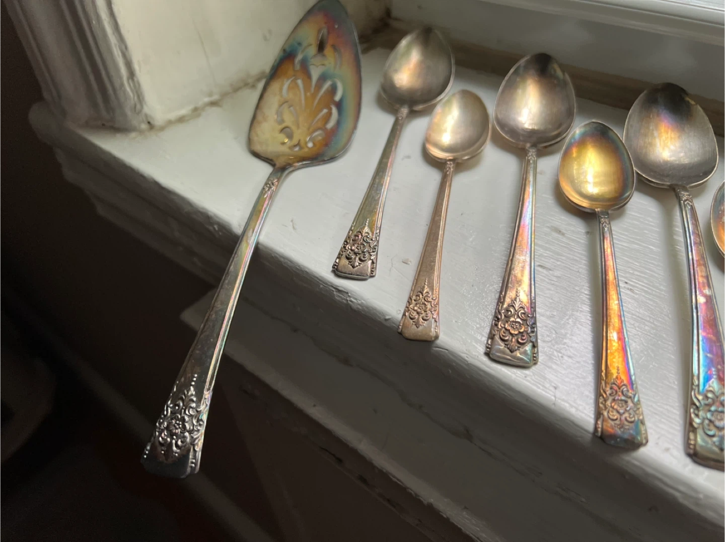 15Selling a vintage silverware set that includes spoons, forks, knives, and a serving utensil. The pieces have a decorative floral pattern on the handles. They show some signs of wear and use, but are in overall good condition for their age…WM Rogers Silver plated 6 Piece Flatware Set with Pie/Cake Server (all need to be polished) 25 pieces total…For pick up in Flushing only…at 7-eleven store 146-26 Northern blvd…cash only!