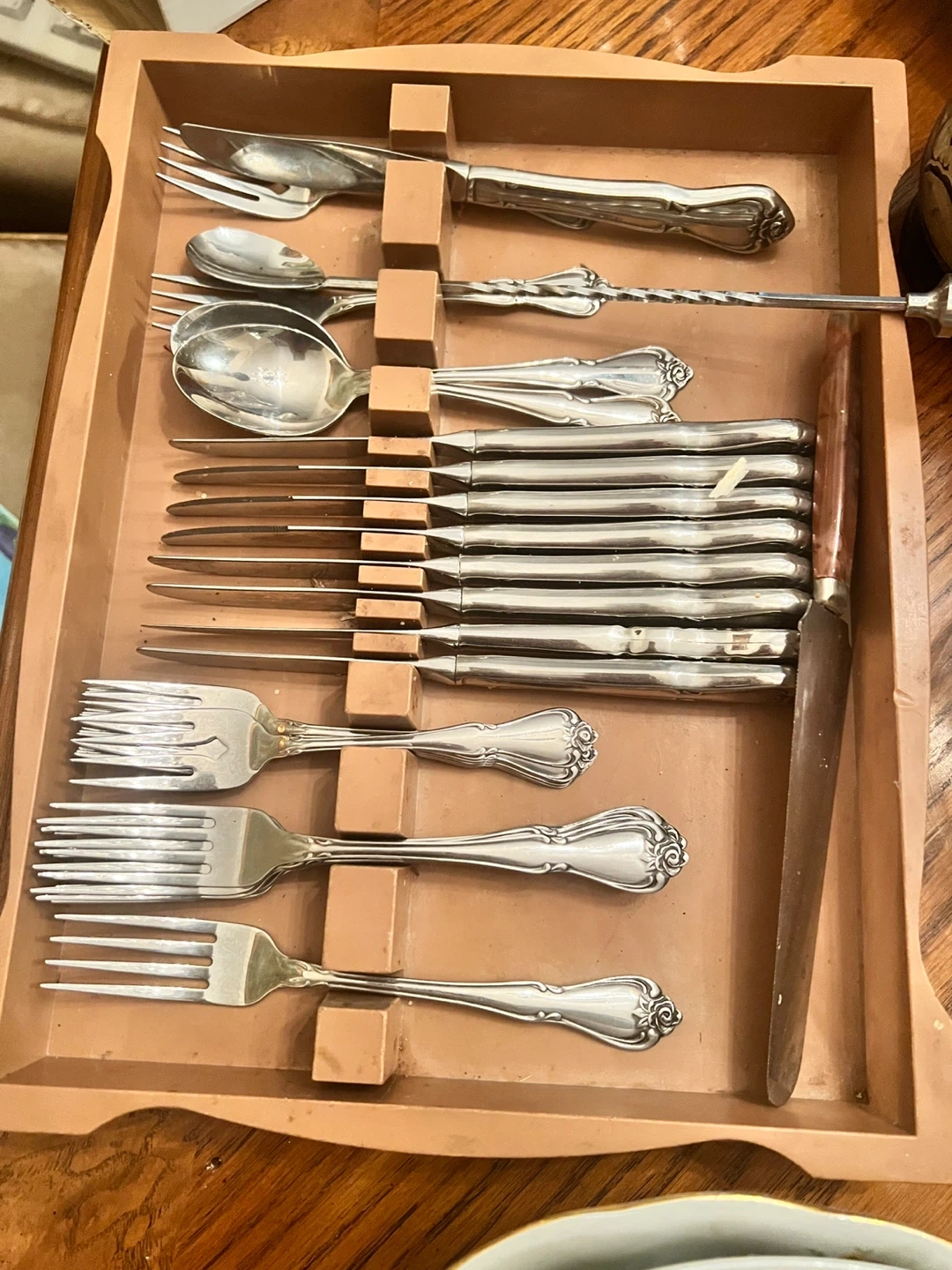103Selling a vintage silverware set that comes neatly arranged in a wooden box. The set includes forks, spoons, knives, and other utensils. Great for adding a touch of elegance to your dining experience!