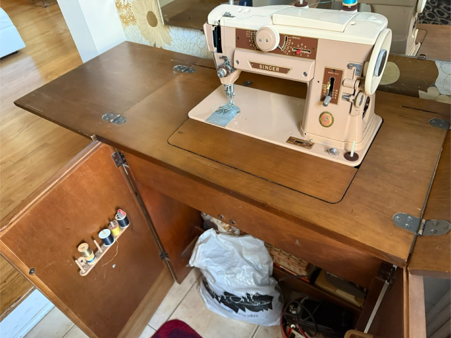 Selling a vintage Singer 401A sewing machine! It's a classic model known for its reliability and smooth operation. Perfect for sewing enthusiasts or collectors Manufactured in the late 1950s or early 1960s, it was the company's flagship model. It features a "slant needle" design and 18 built-in stitches. The machine uses a rotating cam mechanism and separate "pattern disks" for additional decorative stitches. It has an all-metal frame construction, making it a durable "workhorse" machine.