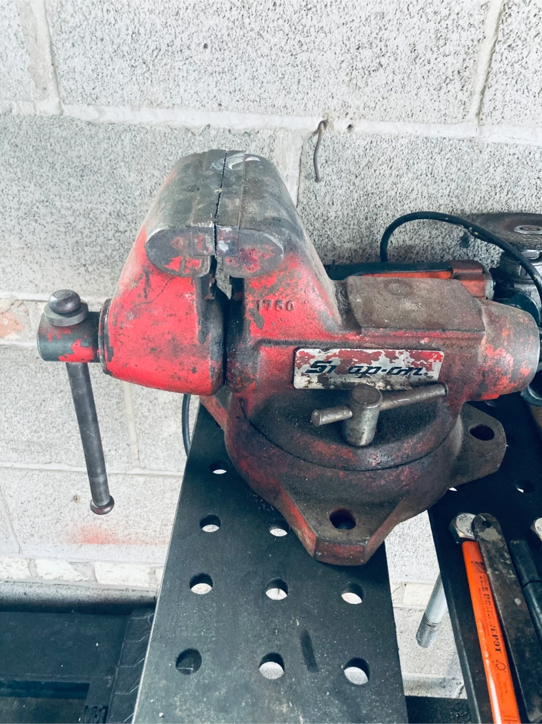Selling a vintage Snap-On bench vise. It shows signs of use and wear, as seen in the photos. It's red and appears to be a sturdy, functional tool.