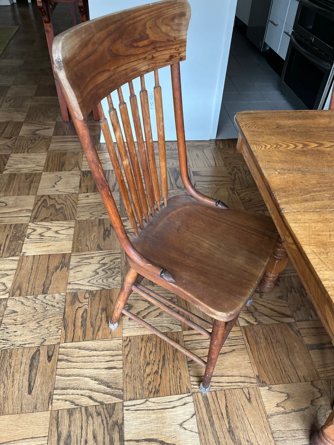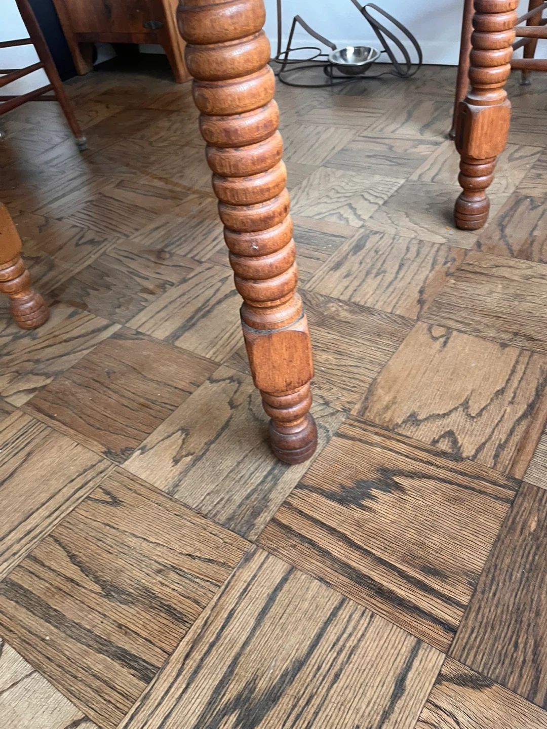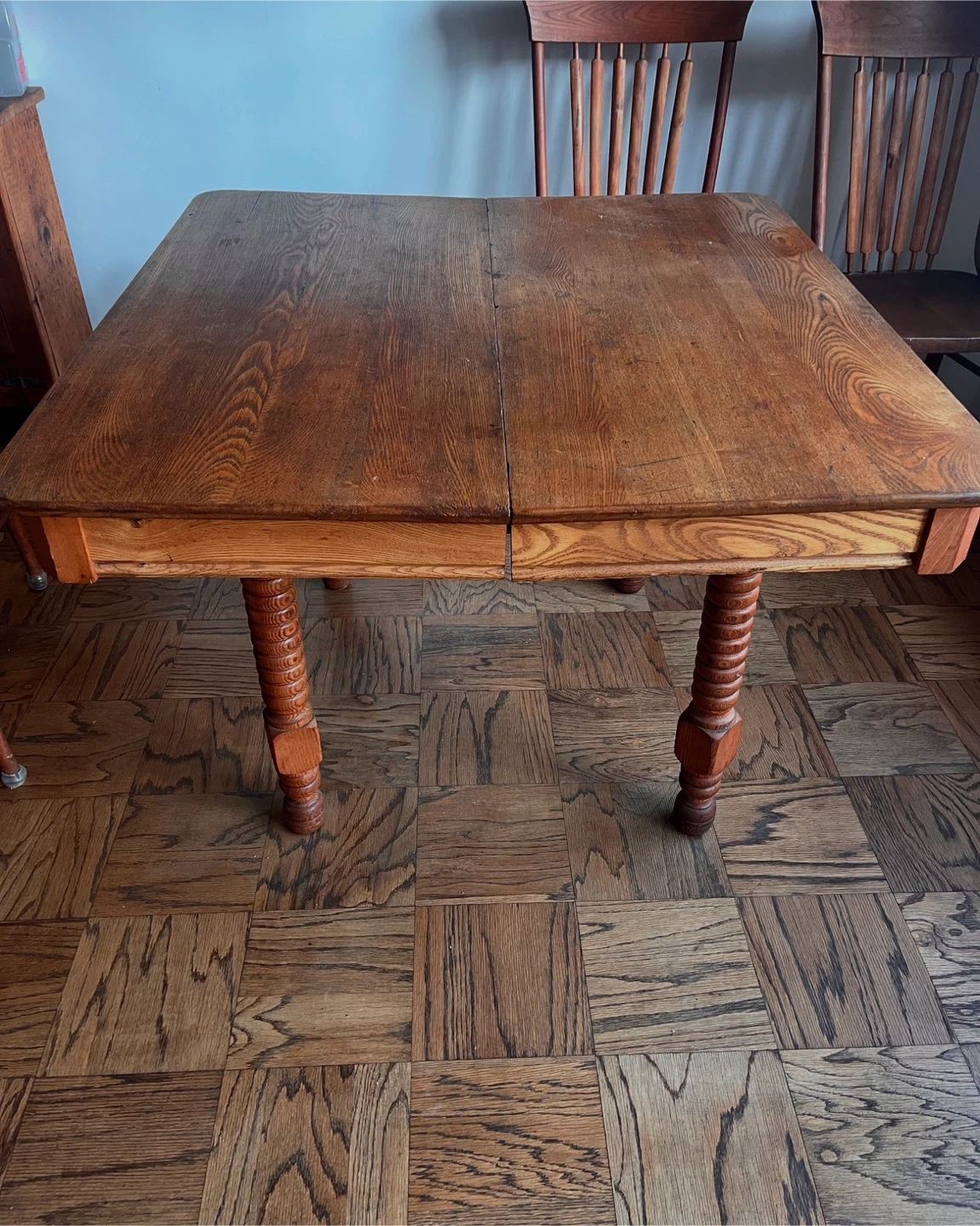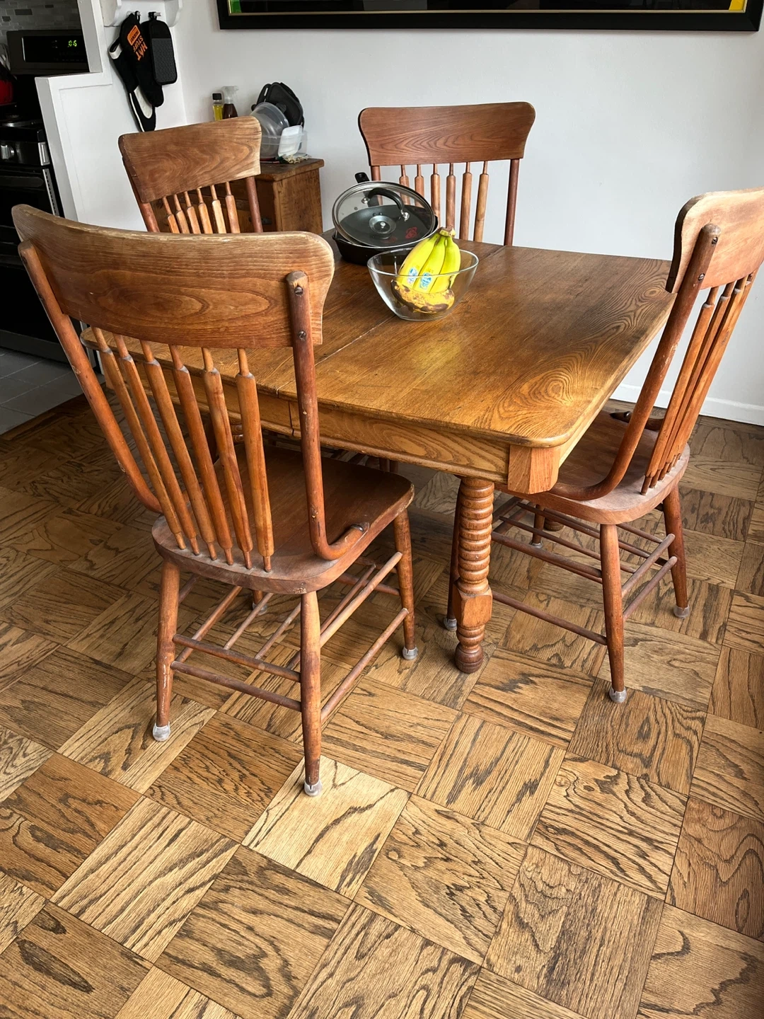 Selling a solid wood dining table with four chairs. The set has a vintage look and feel, perfect for a cozy dining space. The table features unique, turned legs, and the chairs have a classic spindle back design. There are some signs of wear consistent with age, but overall the set is sturdy and ready for a new home