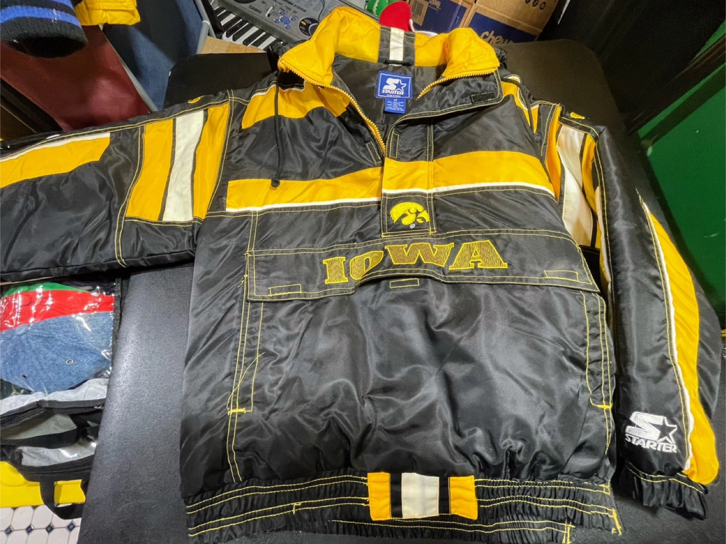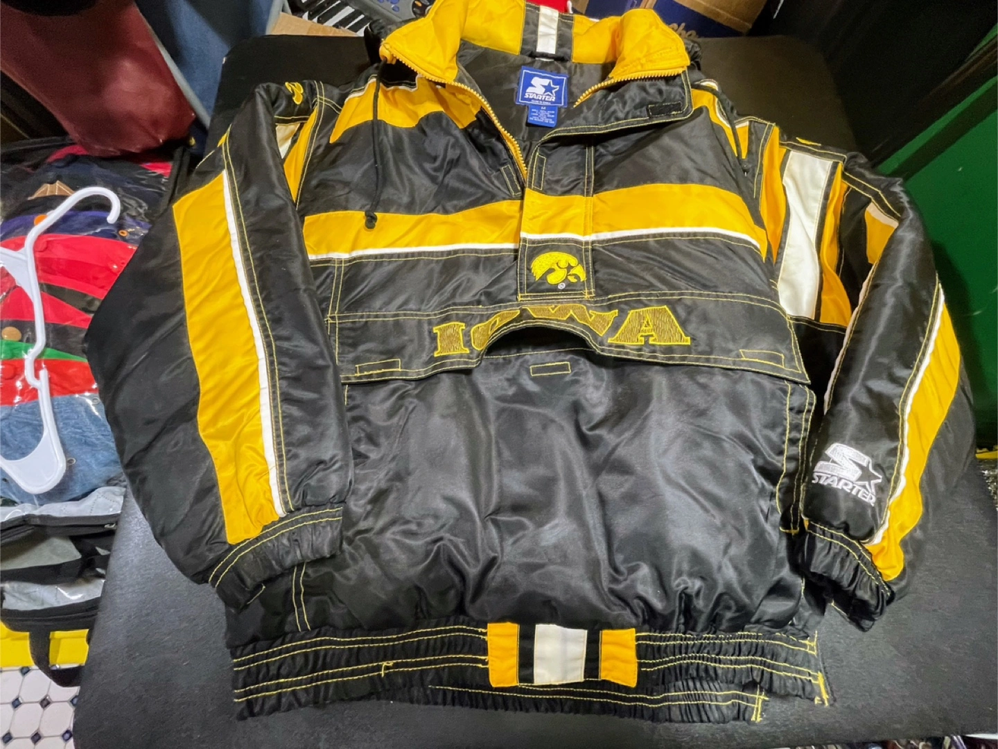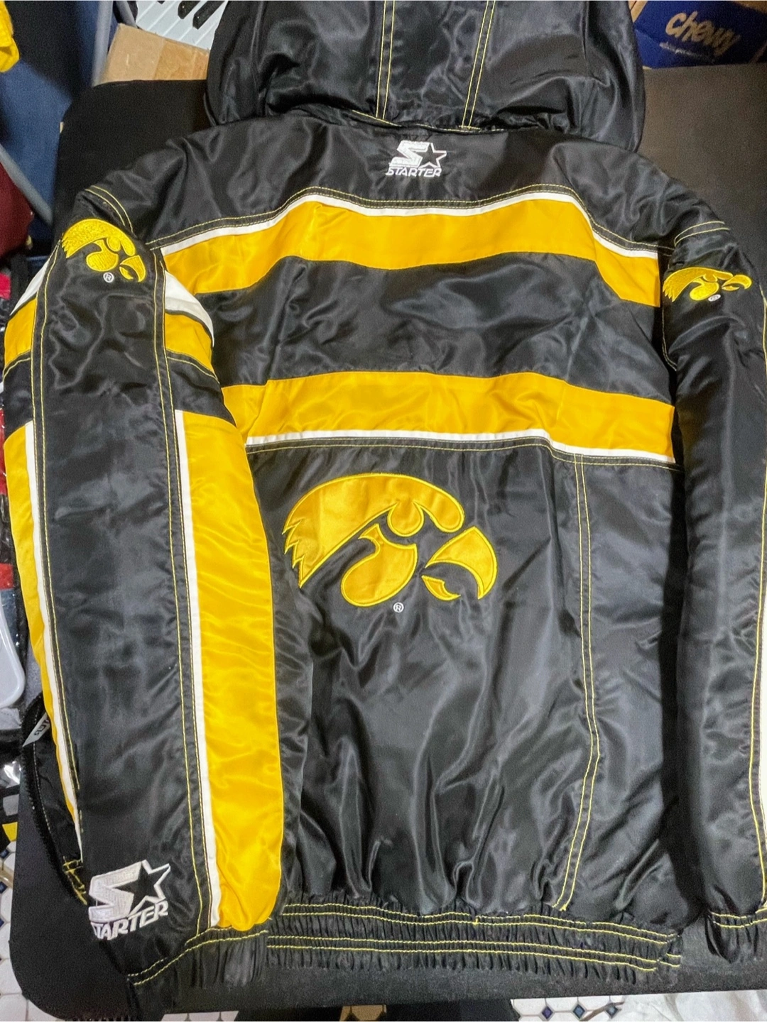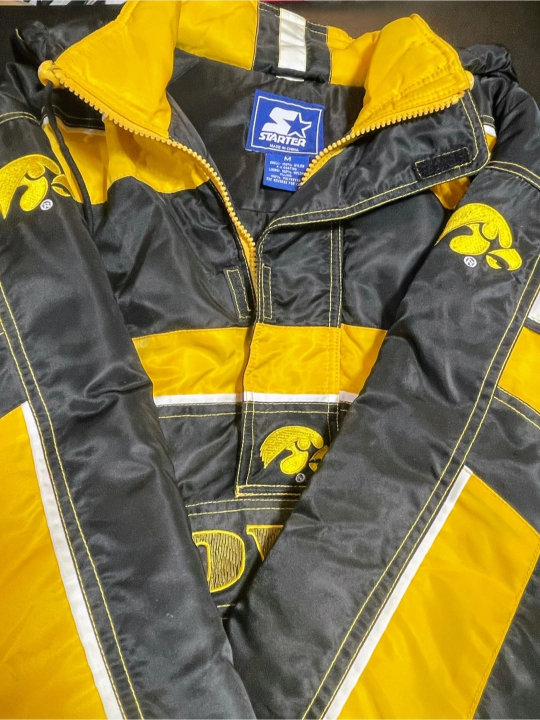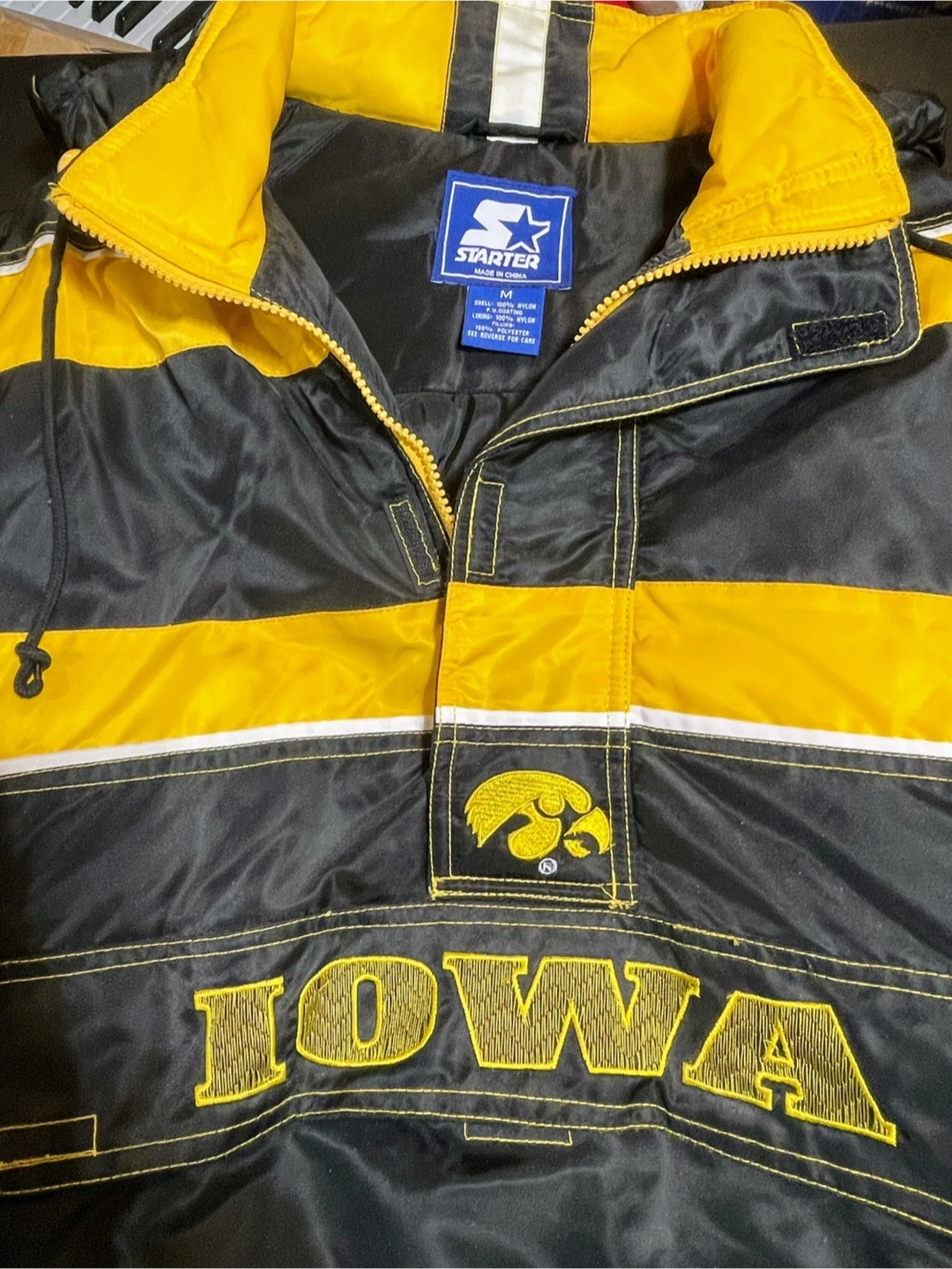 20Men's size medium Starter jacket. Black with yellow and white stripes. Embroidered Iowa Hawkeyes logo. Features a half-zip closure and a hood. Great for game days or casual wear.