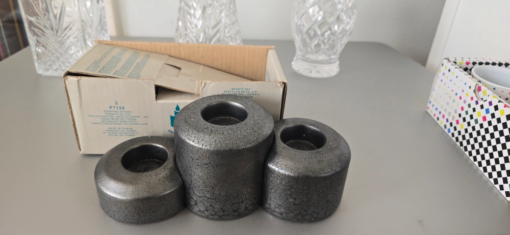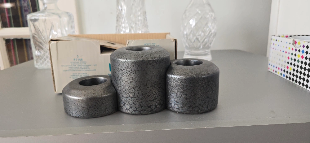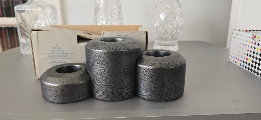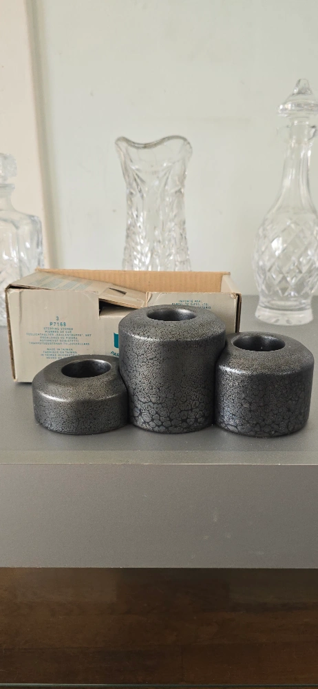 Selling a set of three vintage Stiffel candlestick holders! They have a unique crackled silver finish and come with the original box