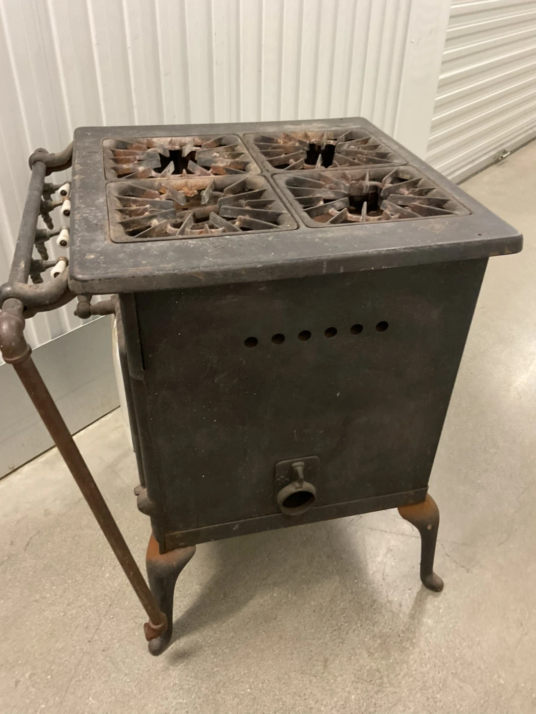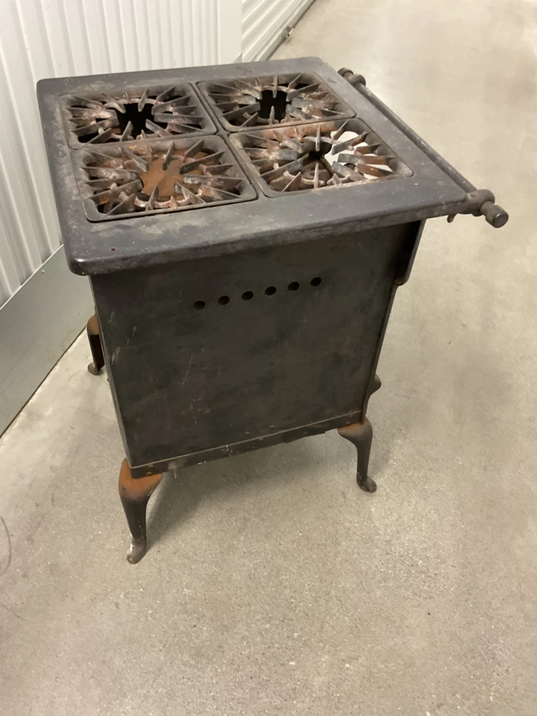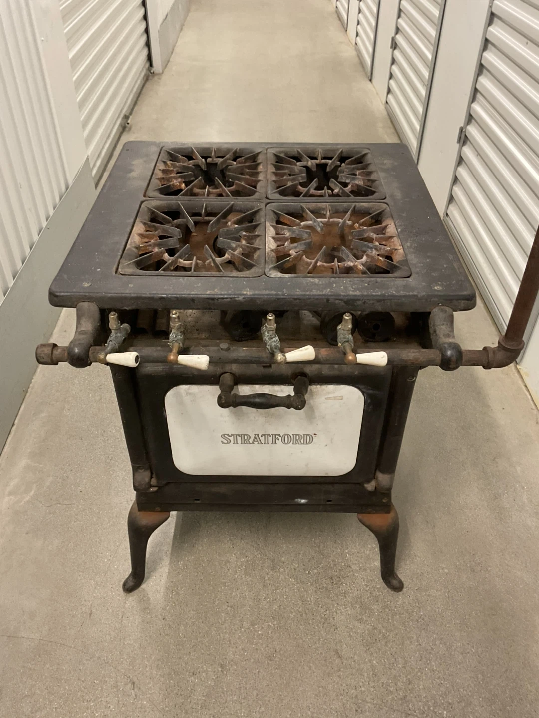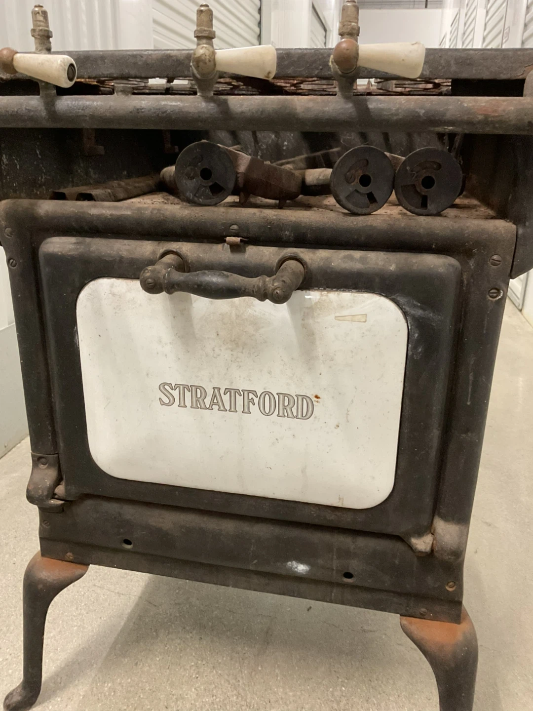 73Selling a vintage Stratford stove. It appears to be in used condition with some rust and wear. It features a four-burner stovetop and an oven. The oven door has the 'STRATFORD' logo on it. Perfect for a restoration project or as a unique decorative piece!