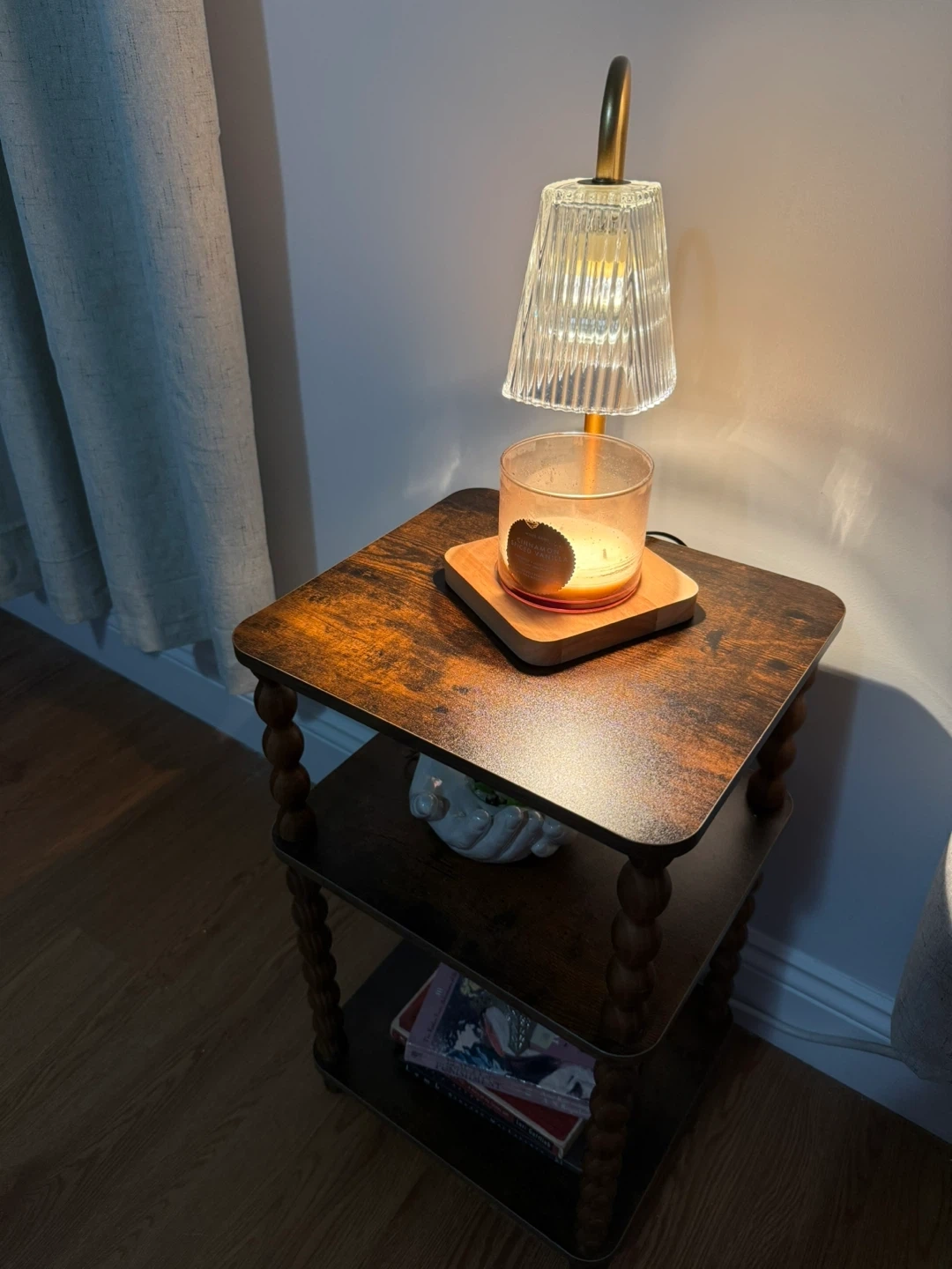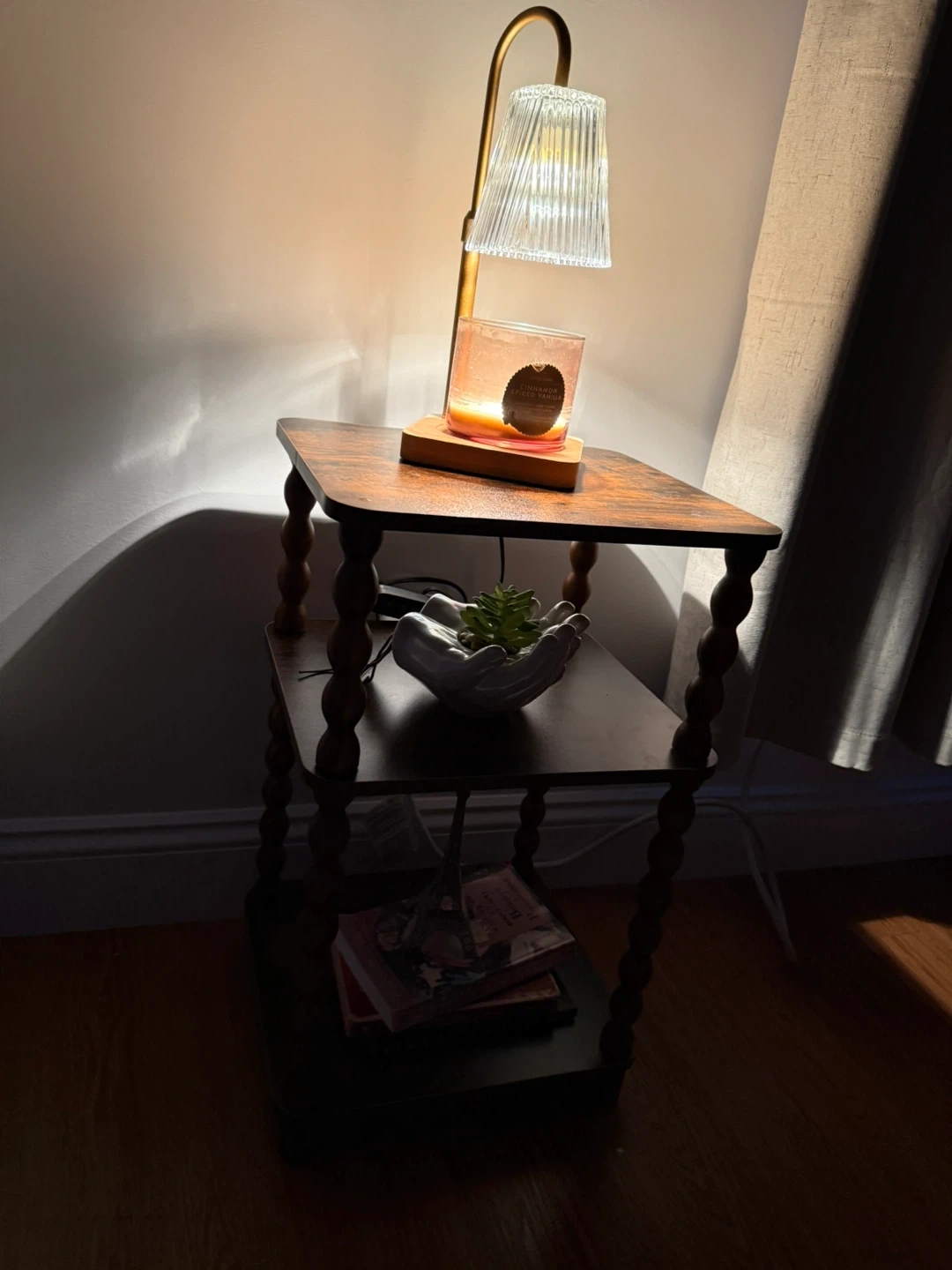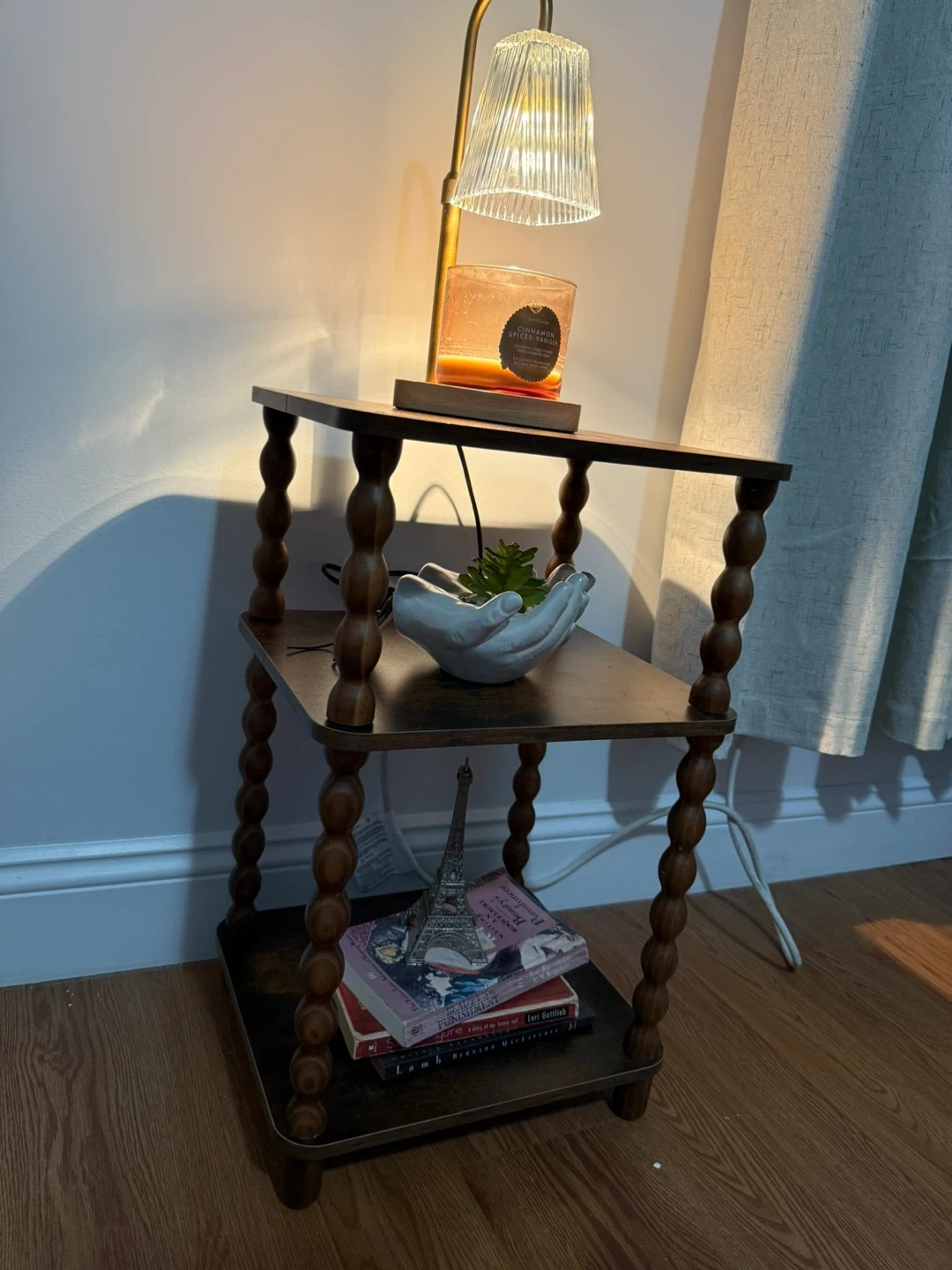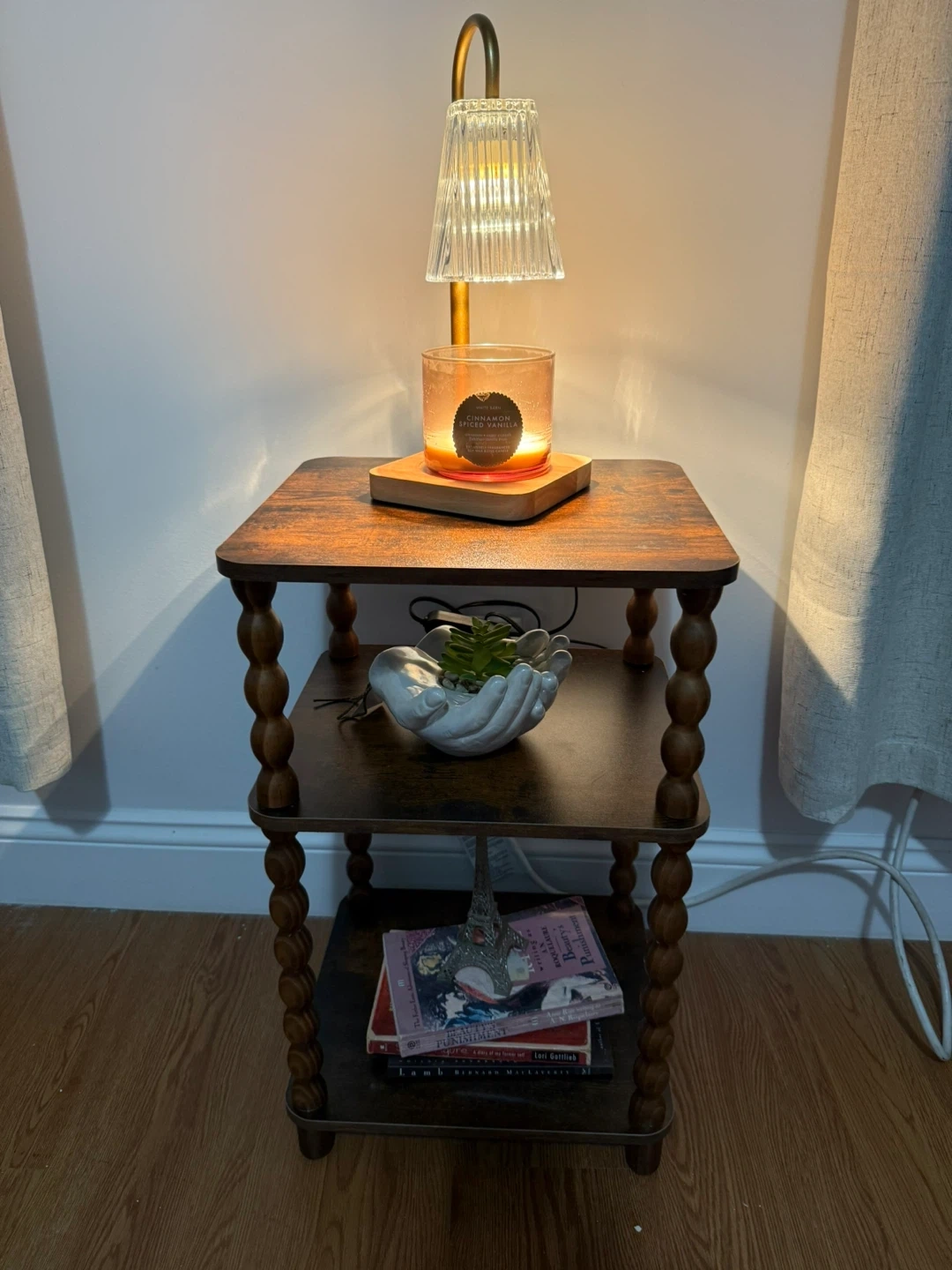 15Selling a charming vintage-style side table with three tiers. It's perfect for adding a touch of classic elegance to any room. The table features a unique design with turned legs and a warm, dark wood finish. It's in great condition and ready to be a stylish addition to your home!