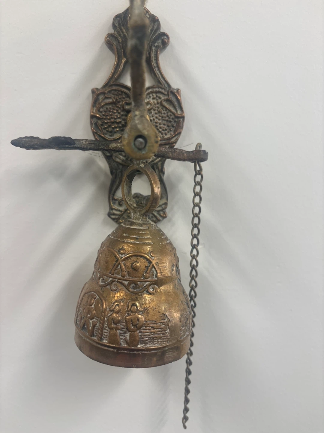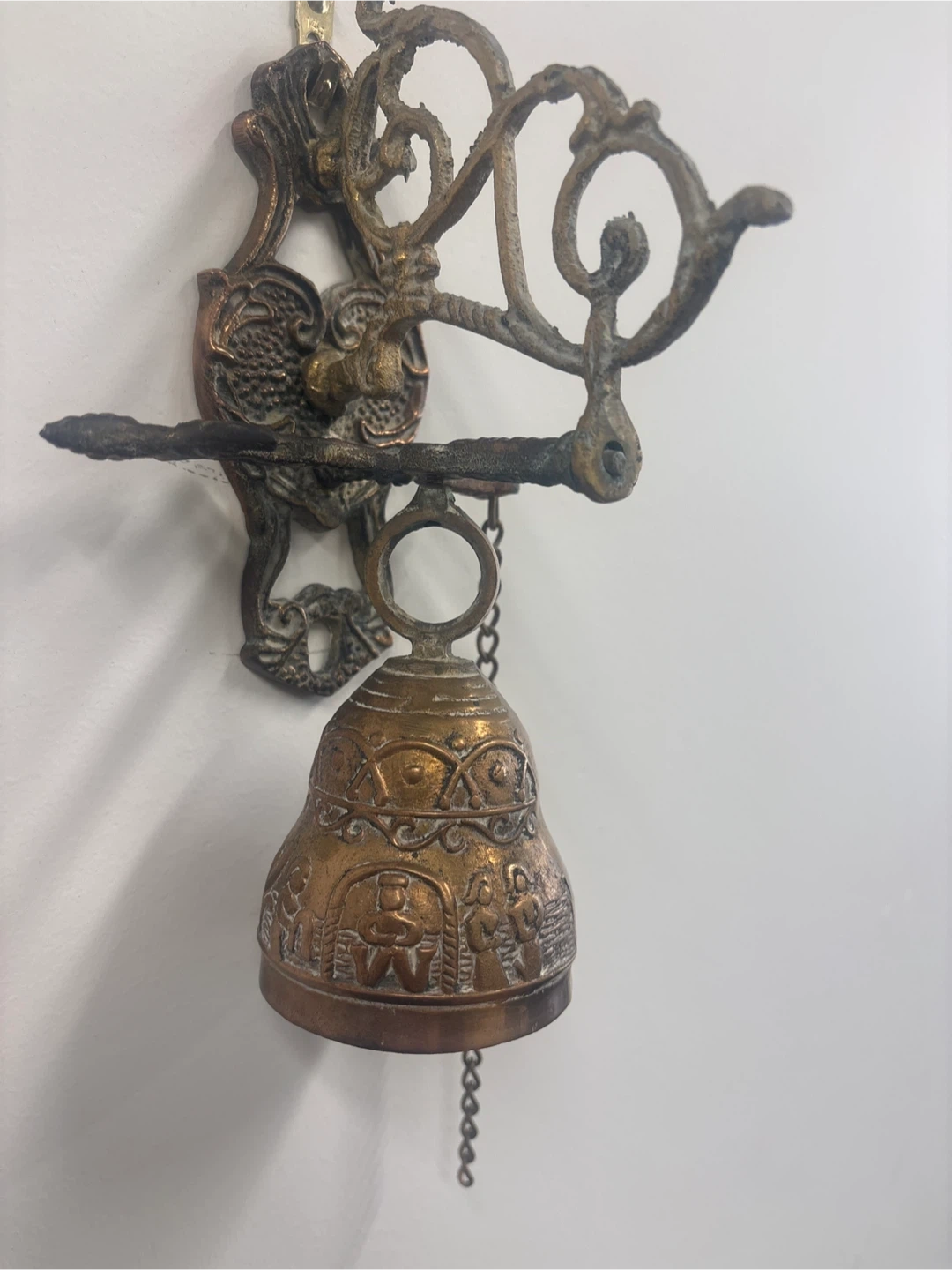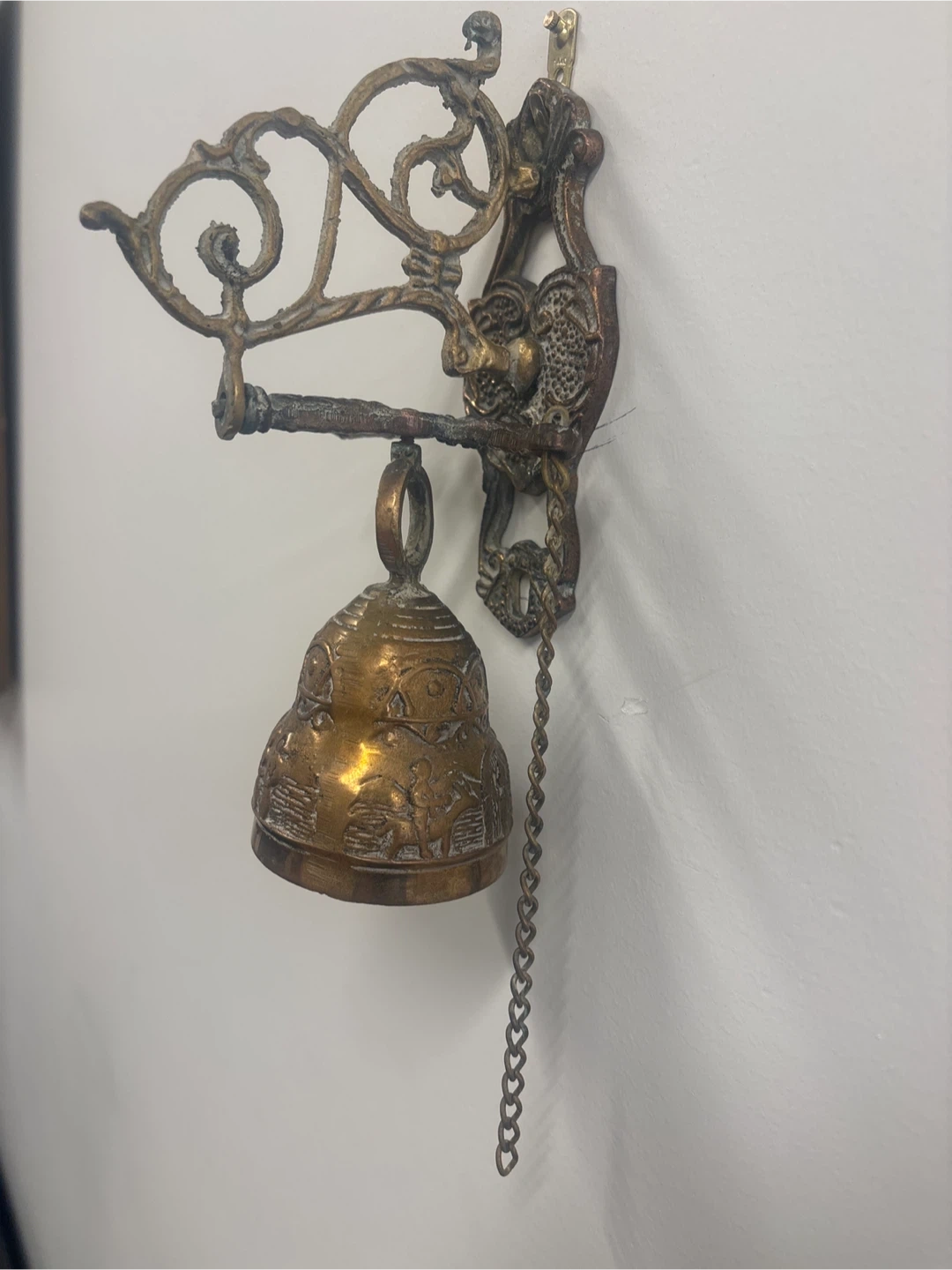 Selling a vintage-style brass wall-mounted bell. It has a beautiful, ornate design and a chain. It would make a great addition to any home!