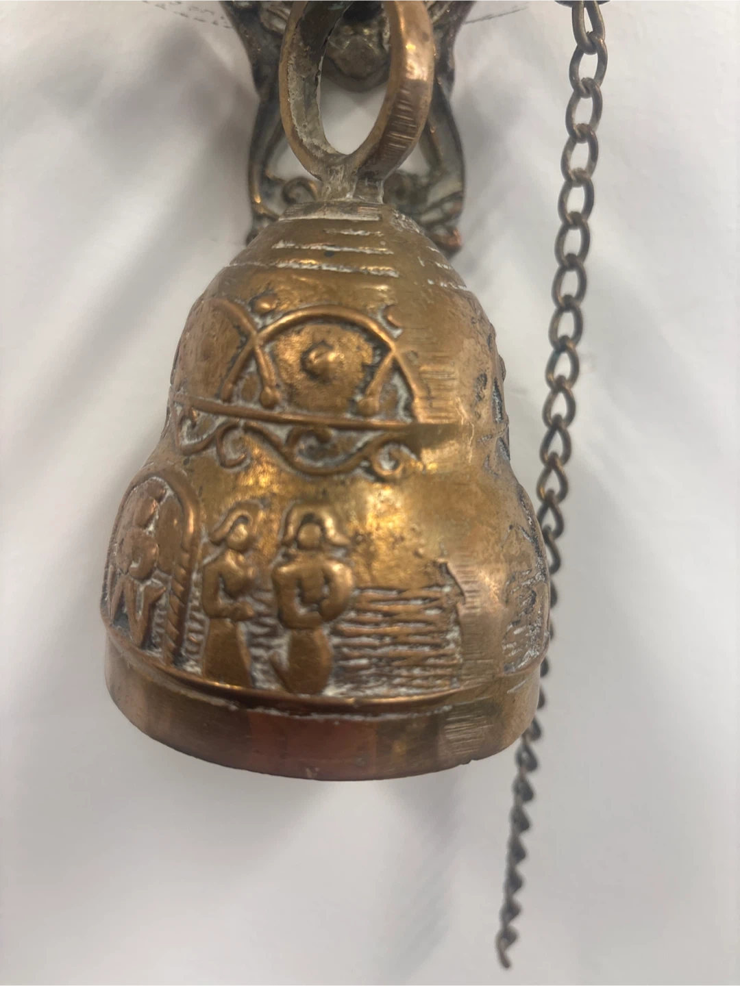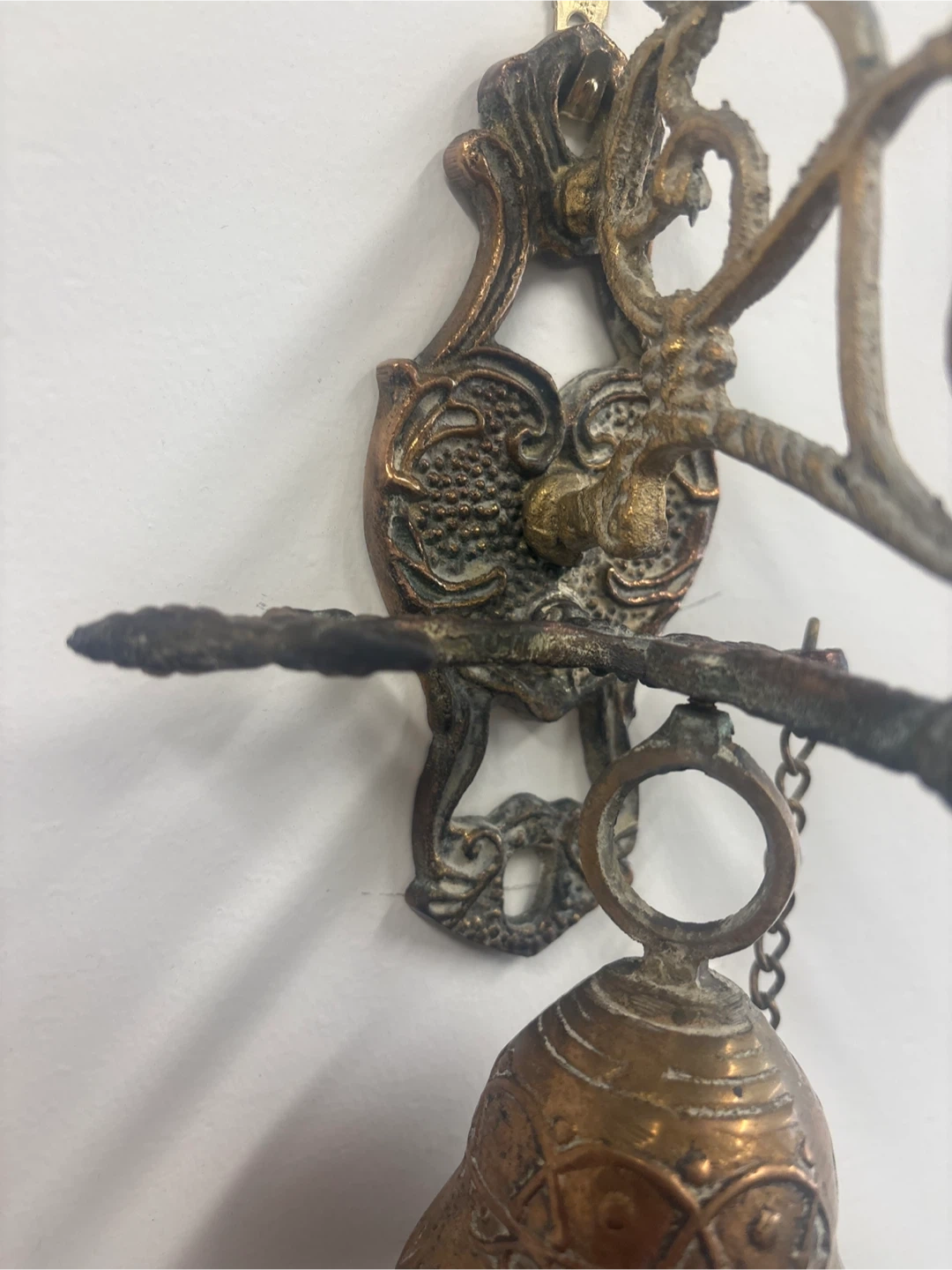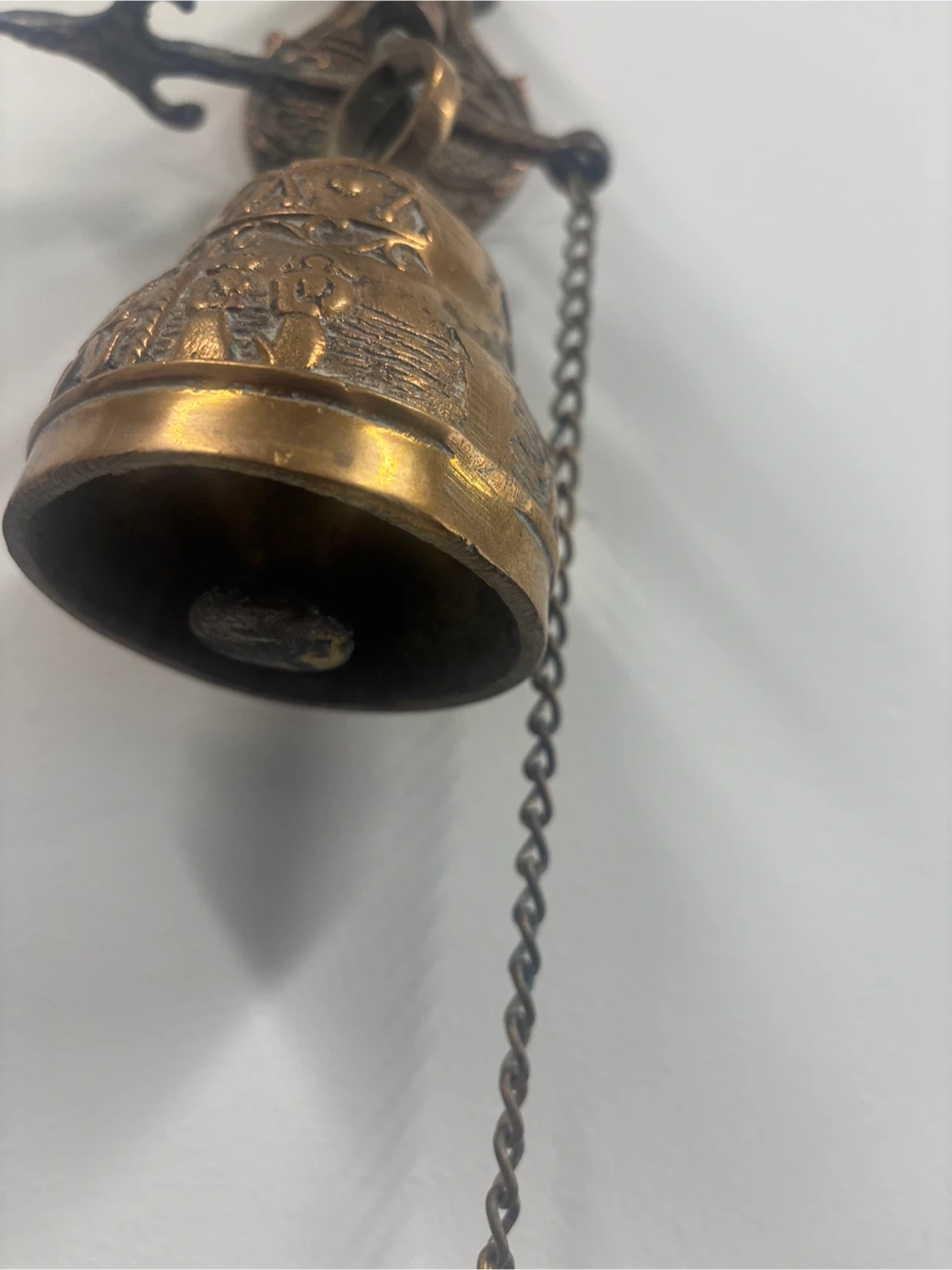 Selling a vintage-style brass wall-mounted bell. It has a beautiful, ornate design and a chain. It would make a great addition to any home!
