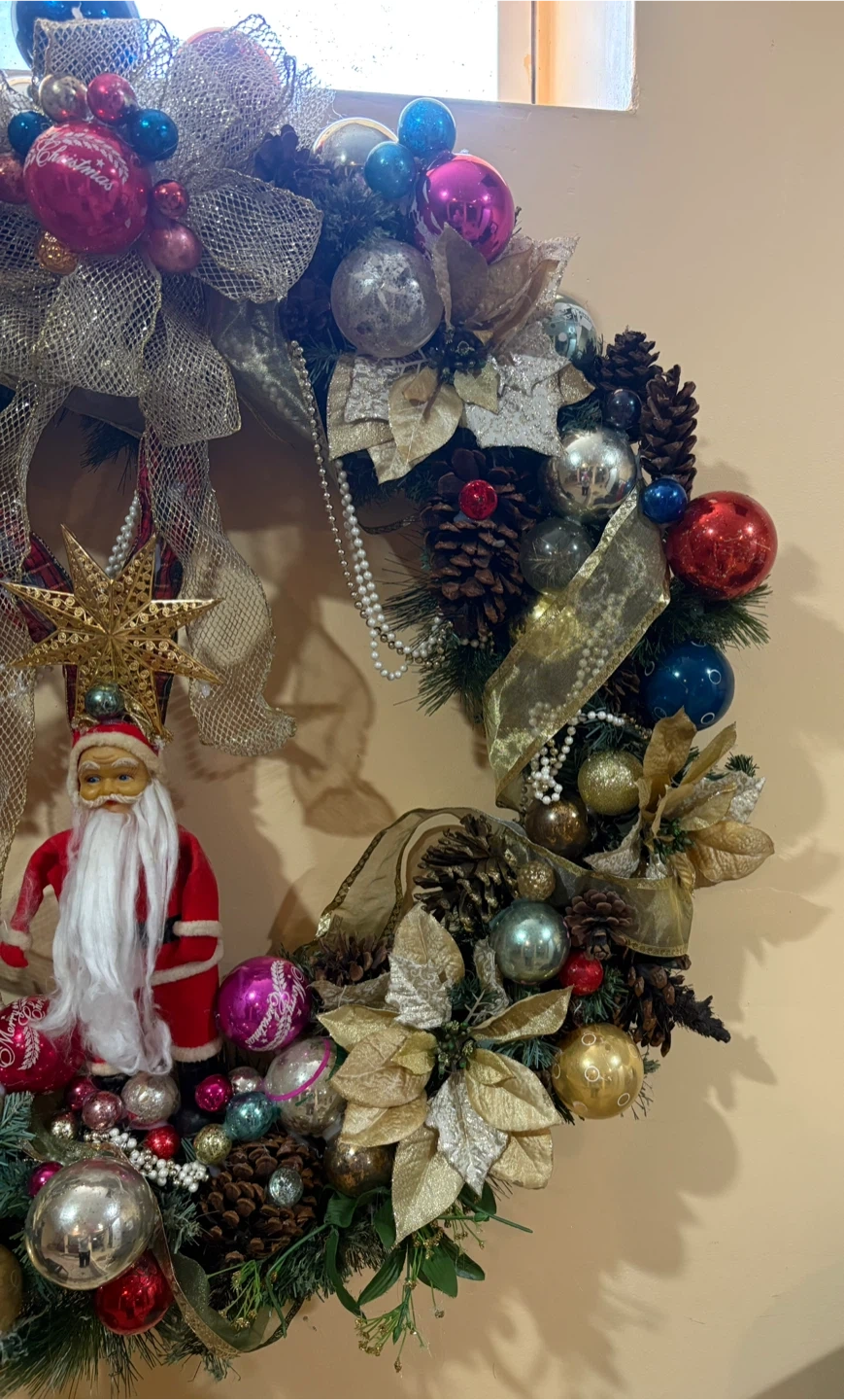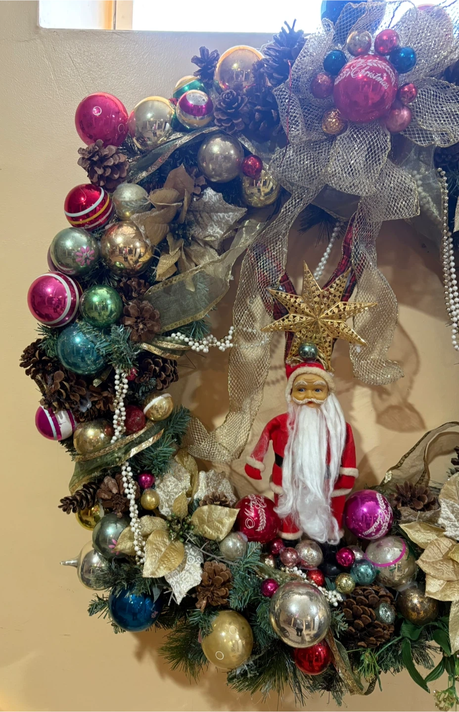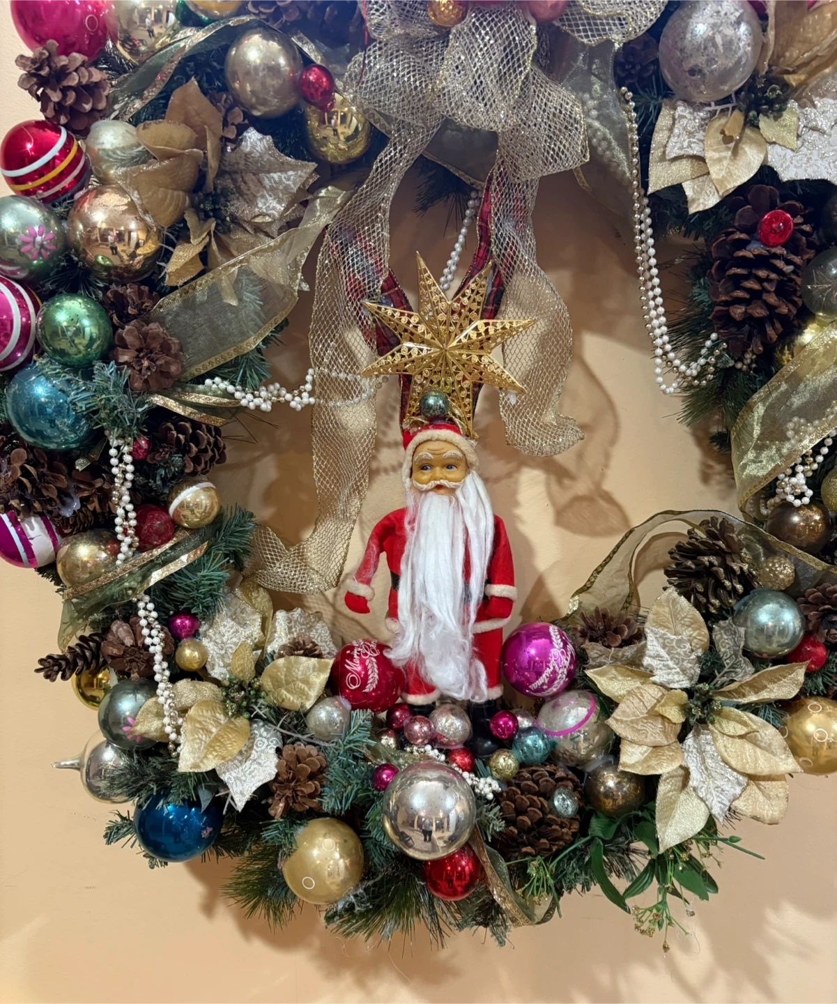 Vintage Style Christmas Wreath Festive Christmas wreath featuring a Santa figure, ornaments, pine cones, and ribbons. Perfect for adding holiday cheer to your home!
