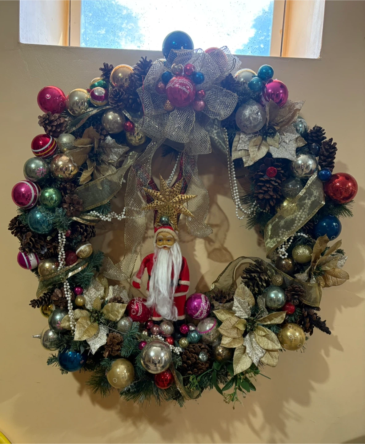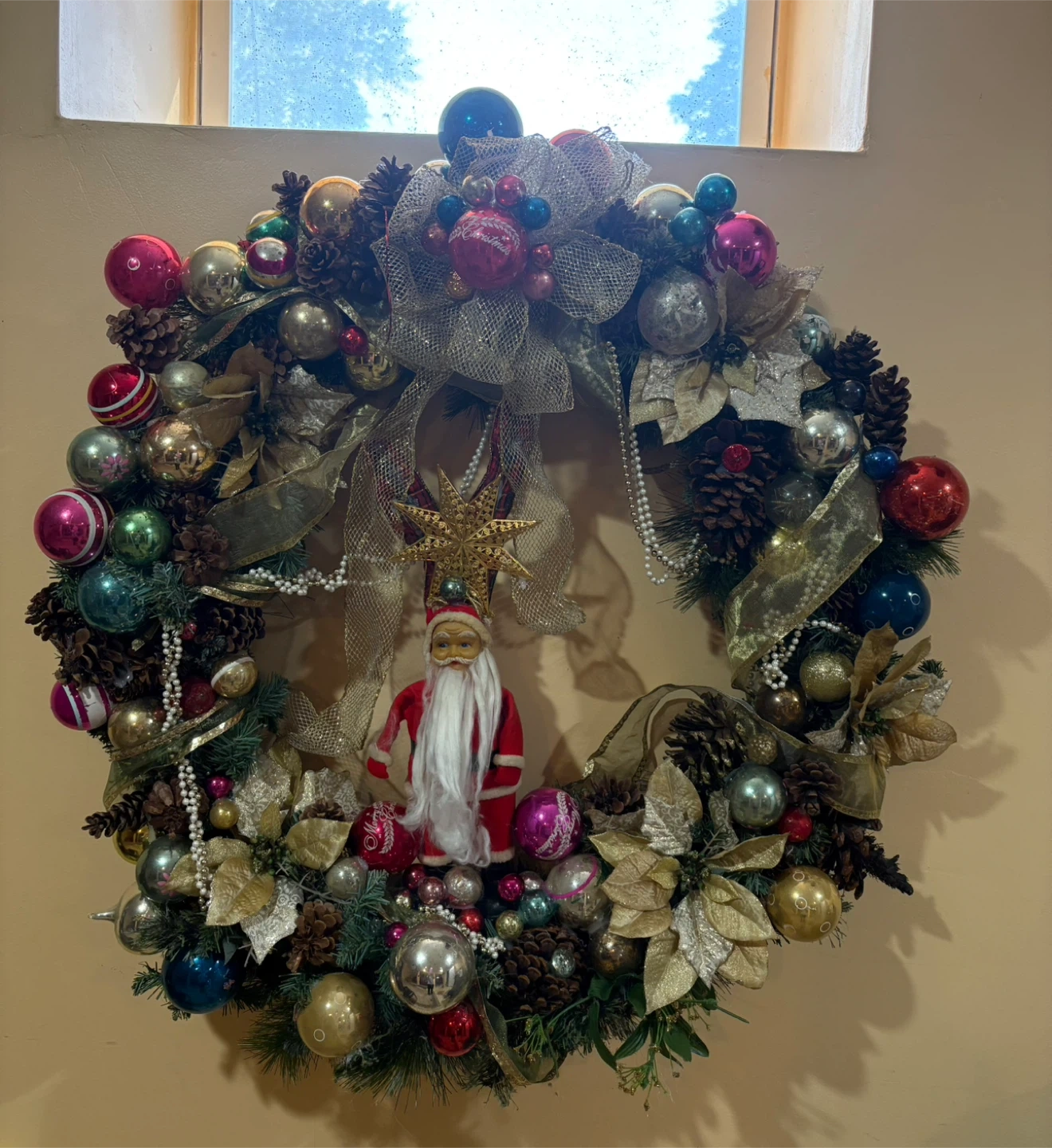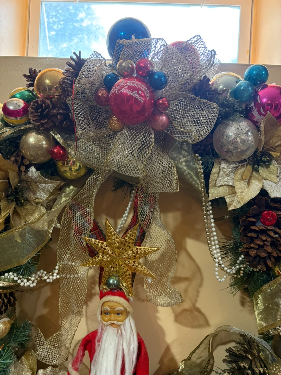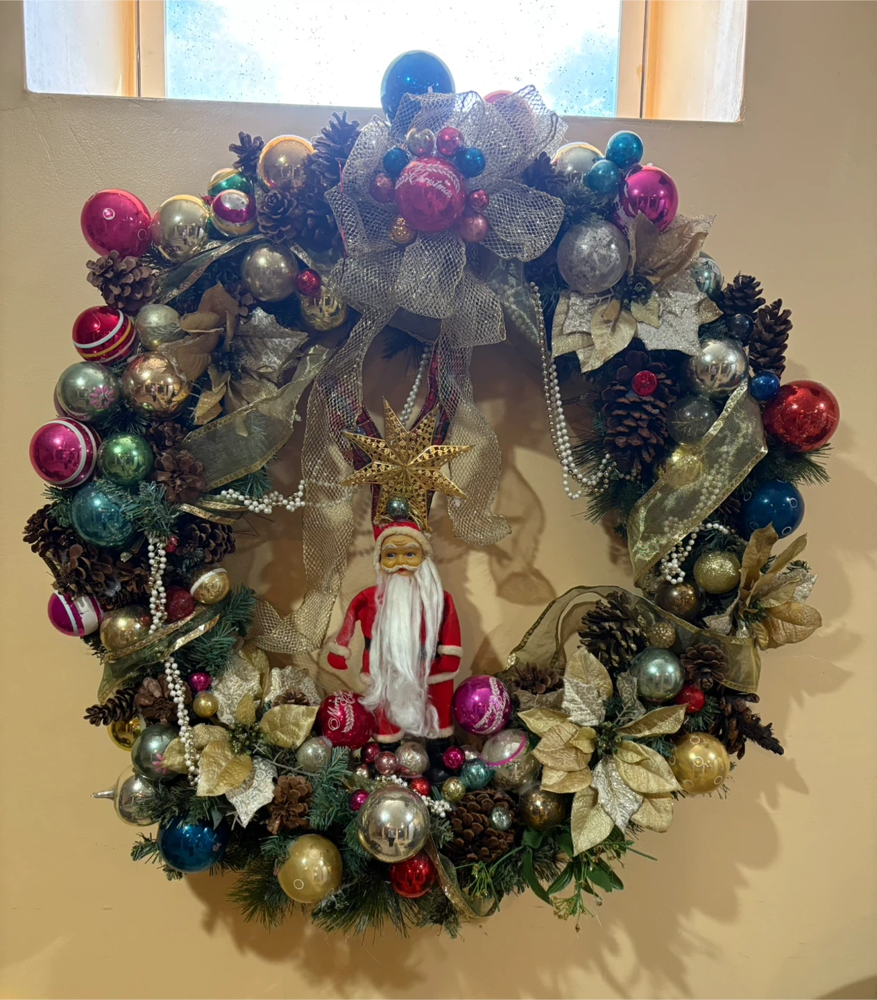 Vintage Style Christmas Wreath Festive Christmas wreath featuring a Santa figure, ornaments, pine cones, and ribbons. Perfect for adding holiday cheer to your home!