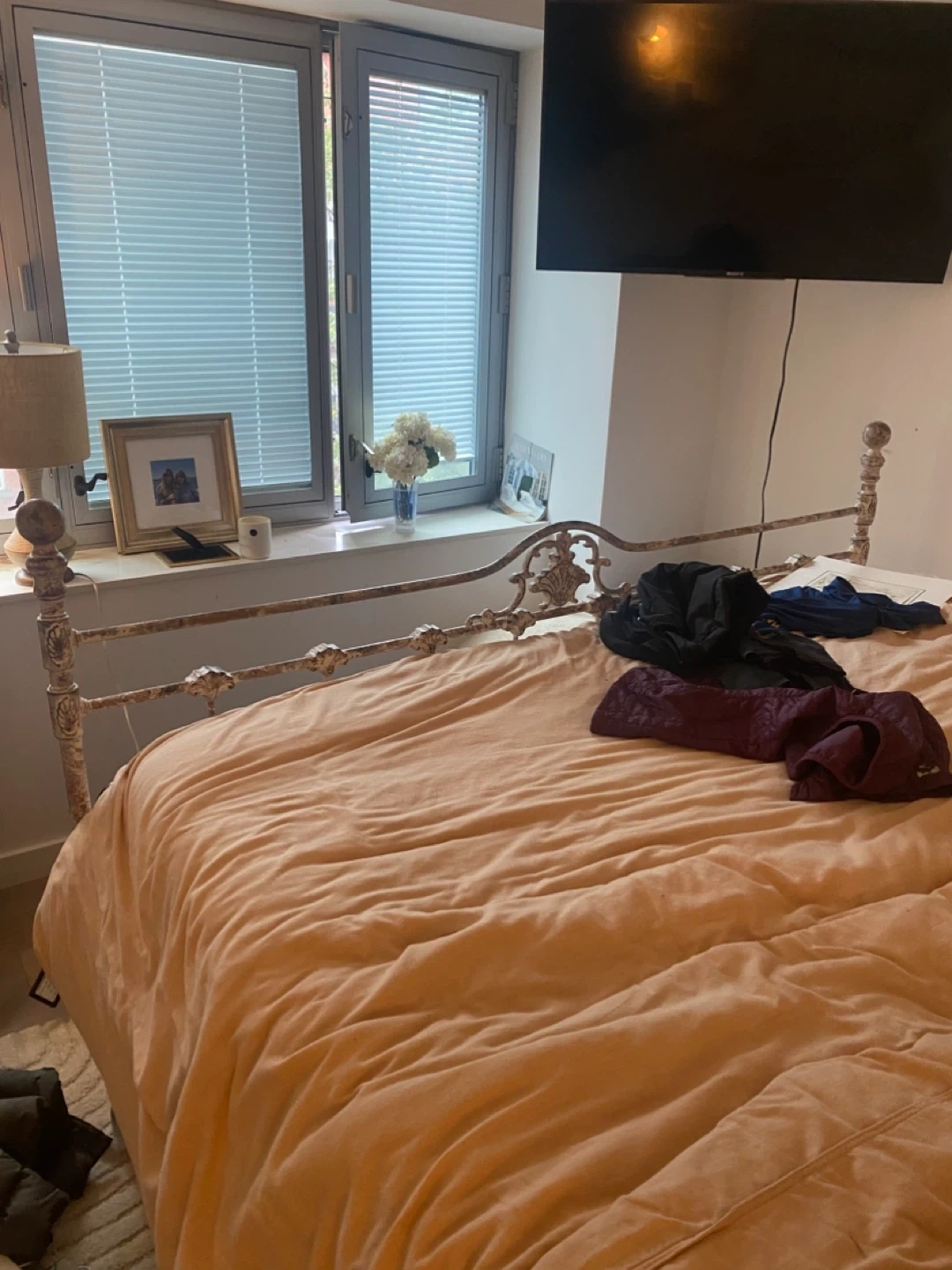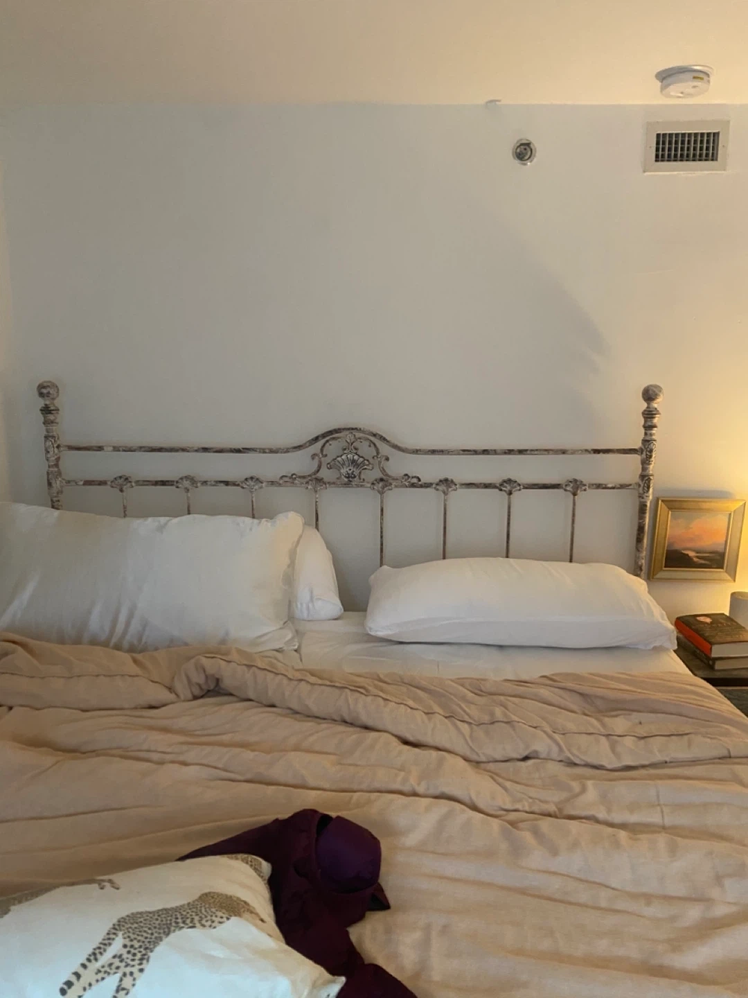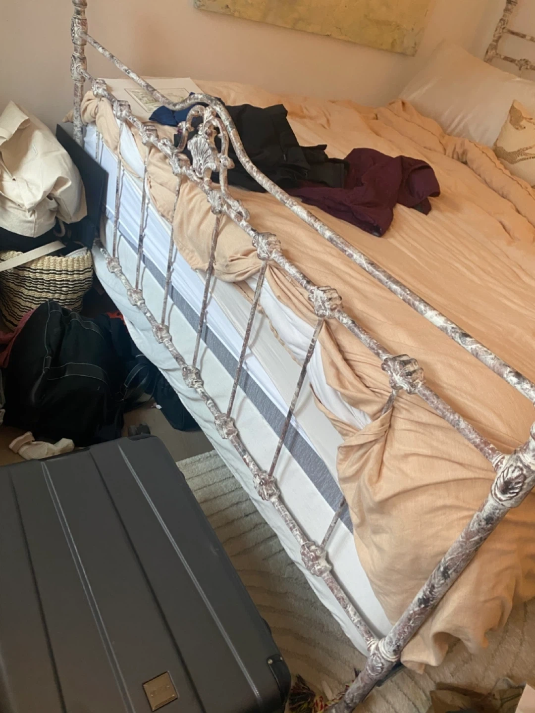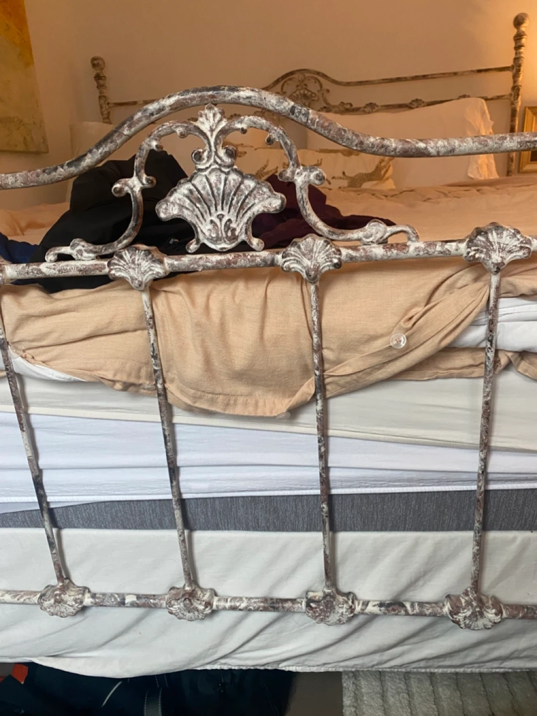 Selling a charming, distressed-style iron bed frame. It has a lovely, ornate design and would add a touch of elegance to any bedroom. It looks like it's in excellent condition and ready for a new home! Bed Size: King