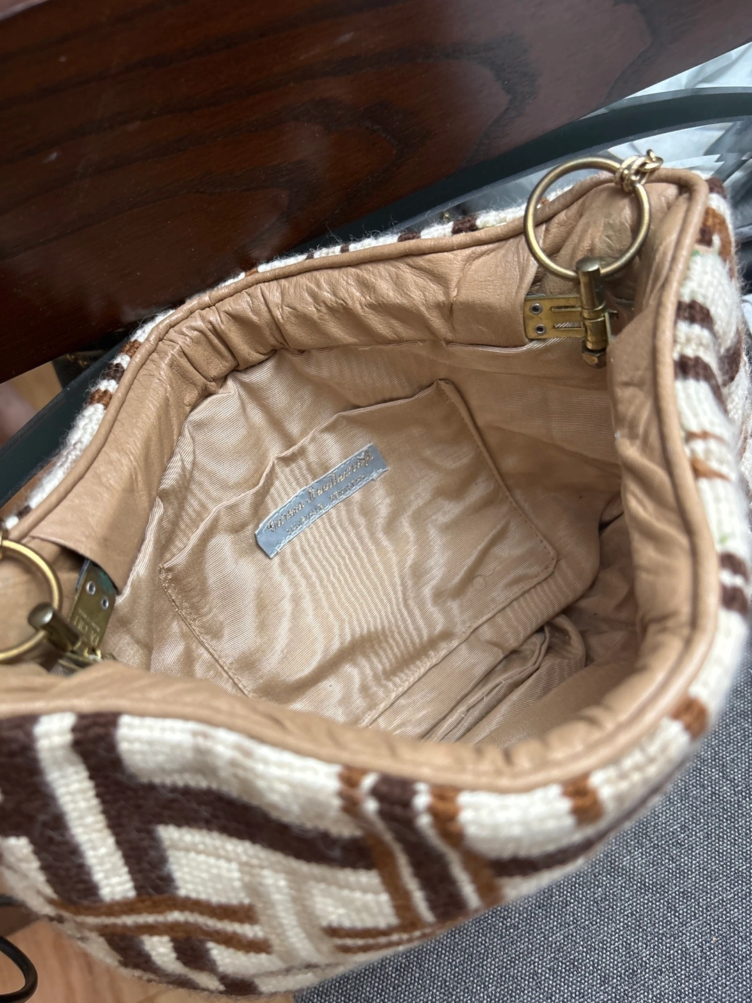 Selling a shoulder bag with a unique vintage-inspired pattern! It features a gold-tone chain strap and a neutral color palette of brown, white, and beige. The interior is lined with a soft, light brown fabric. Perfect for adding a touch of retro charm to any outfit