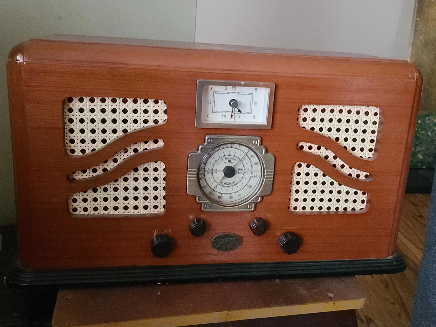 Selling a charming vintage-style radio! It features a classic design with a built-in clock and tuning dials. The radio has volume and tuning knobs, as well as broadcast indicators in MHz and KHz. Perfect for adding a retro touch to any room. Has a casset player too. fully work