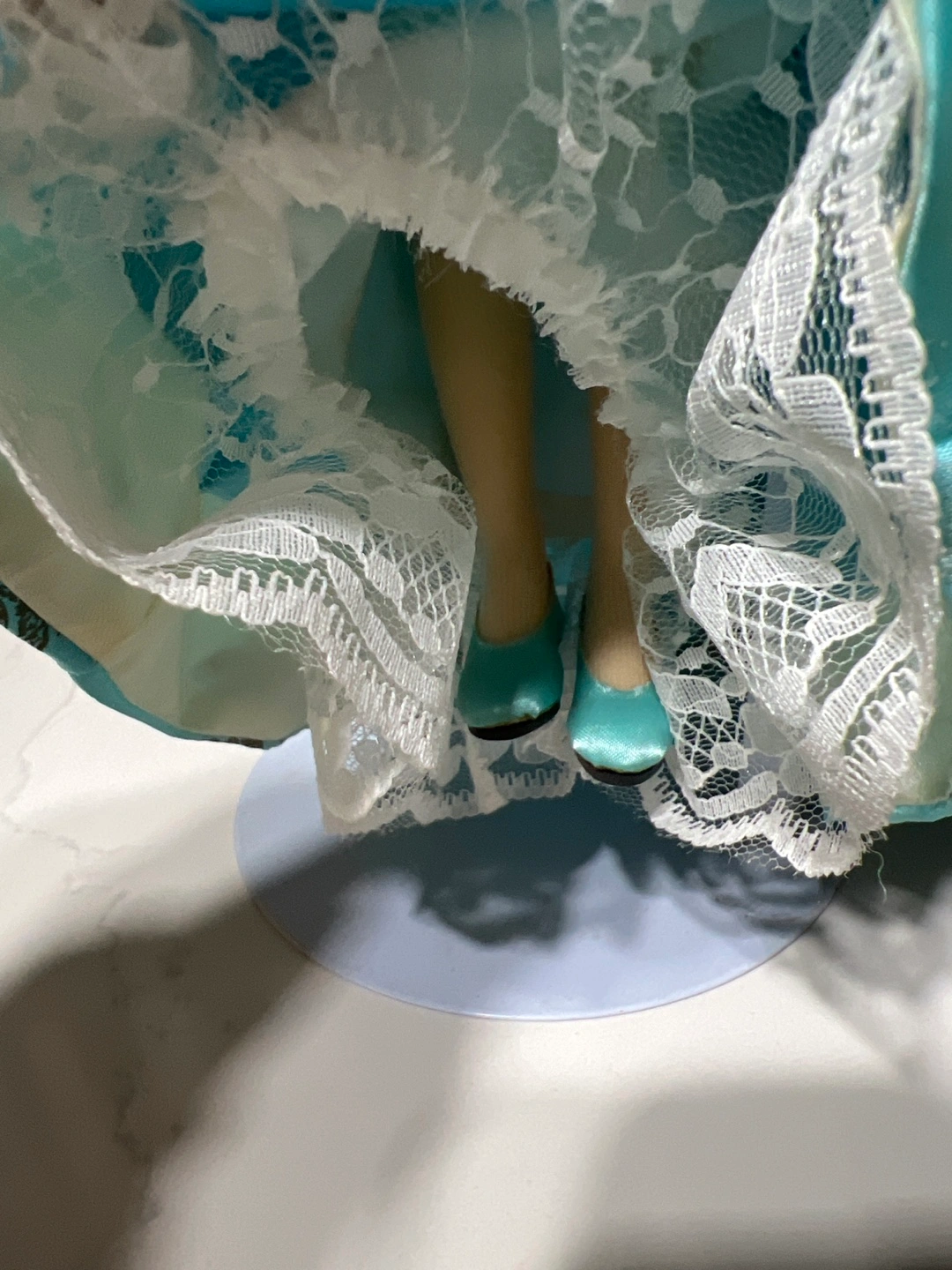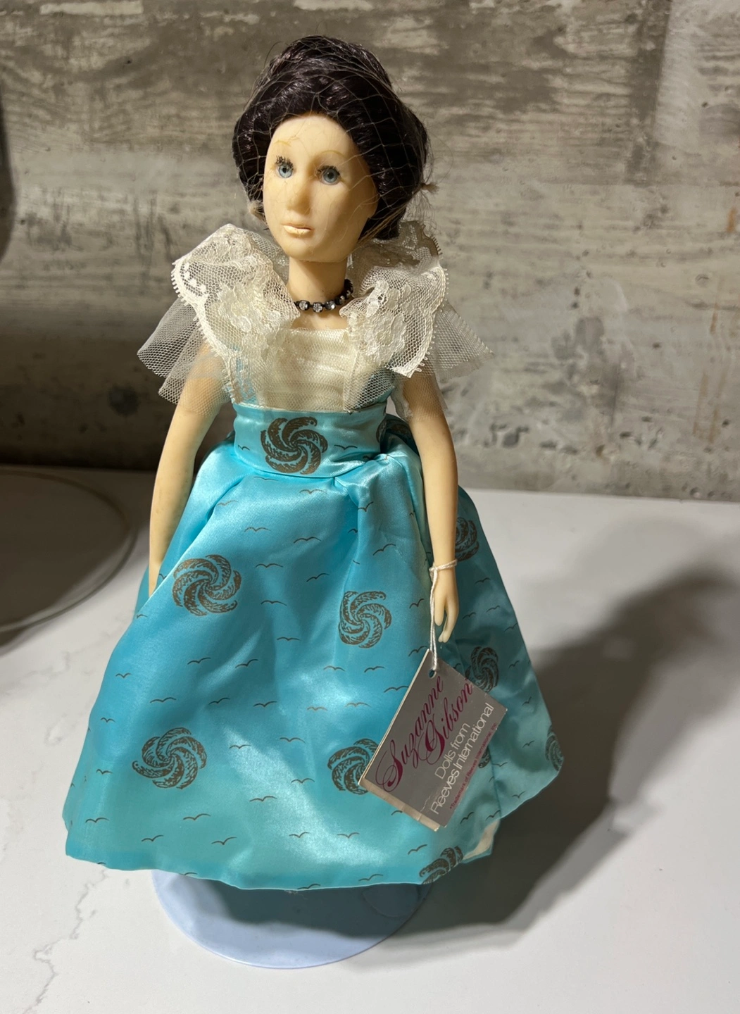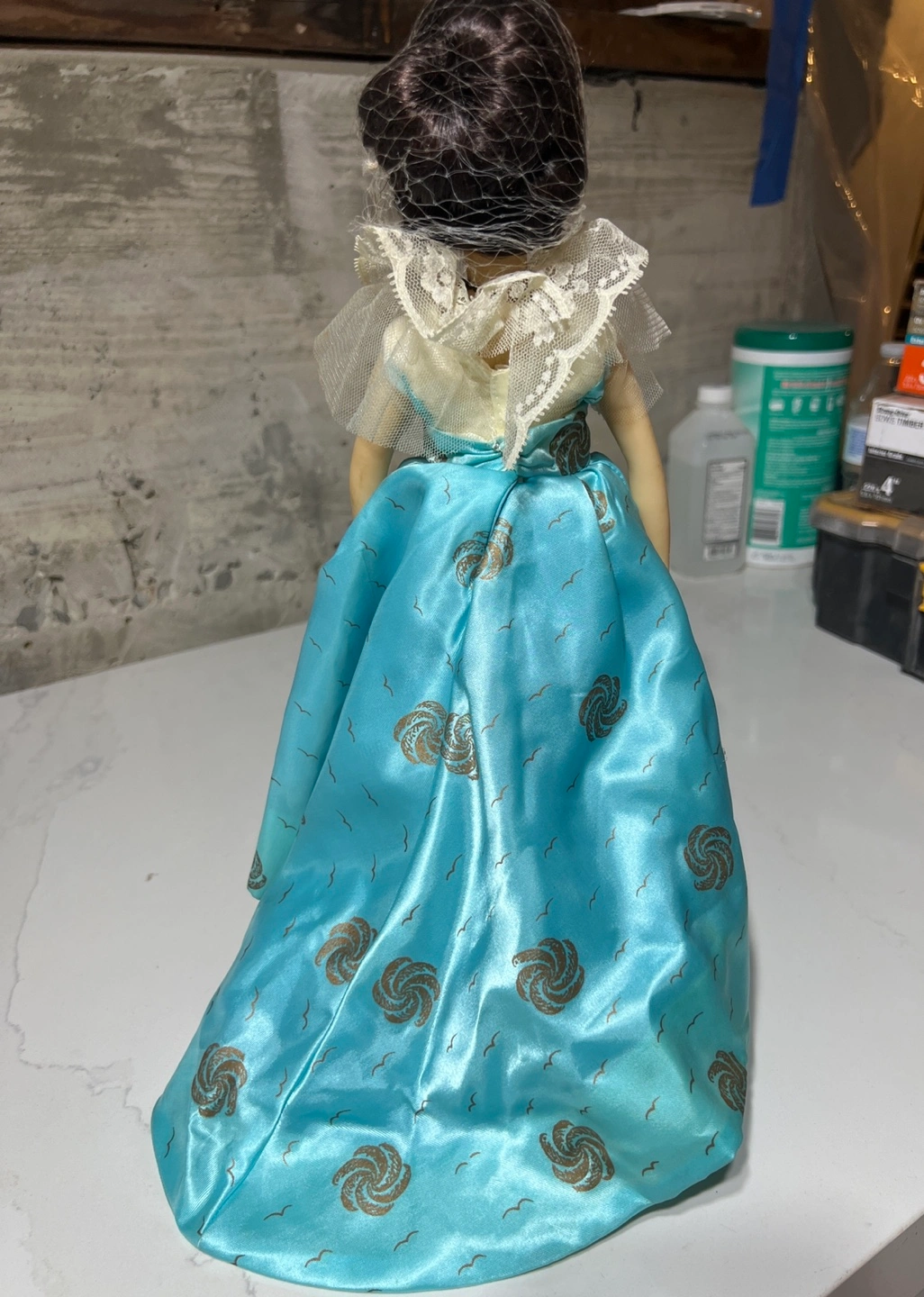 Collectible plastic doll. Teal gown, lace collar. Original tag included. Display stand.