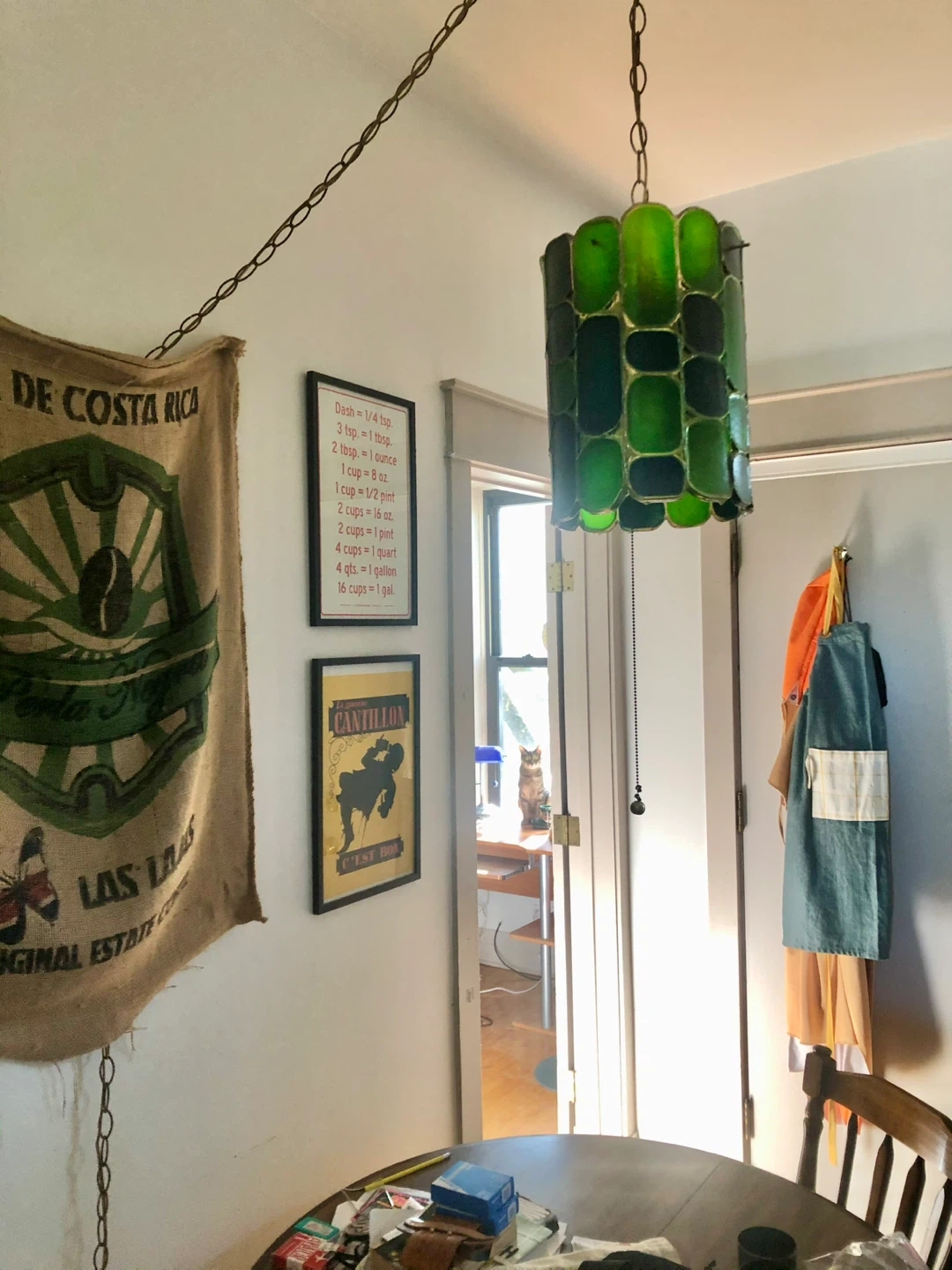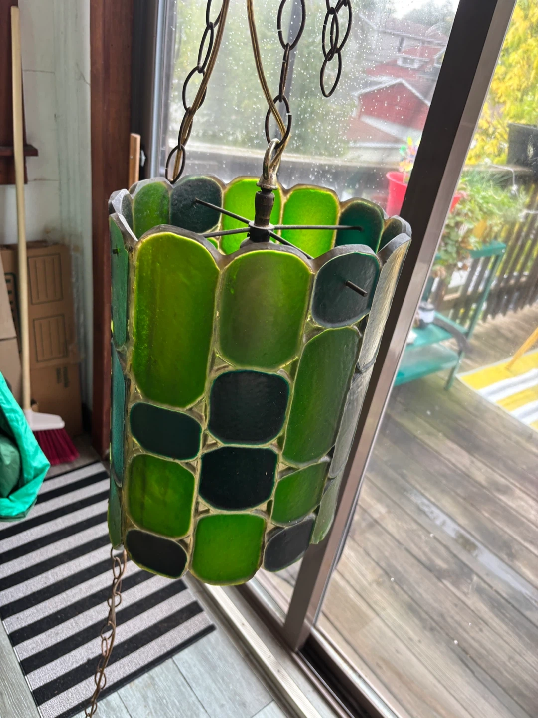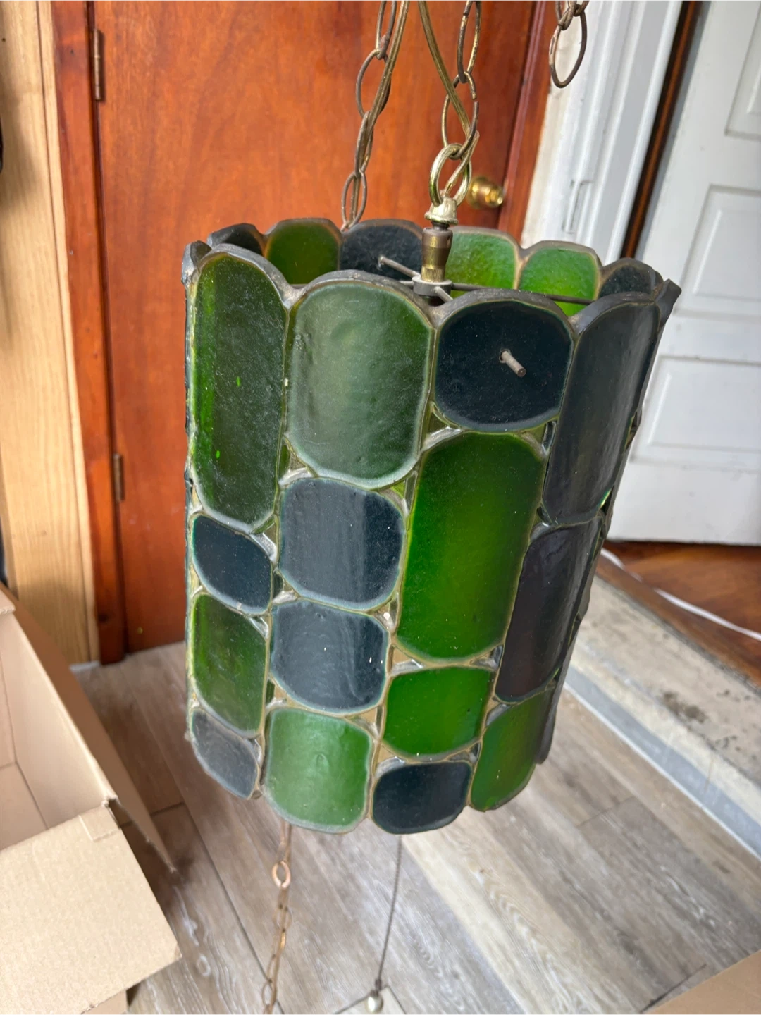 65MCM and works great! Super cool, unique hanging pendant light. I've always gotten a lot of compliments on this, but moved and no longer have a place for it. Green stained glass, hangs from an extra long brass chain with power cord woven through. Pull chain operation. Light bulb included. Multiple outlets in power cord and in the bulb socket so you can plug other things into it too. Typical cosmetic wear and tear for a vintage item. Approx Lamp dimensions: 14"H x 11"W x 10"D Power cable w/ hanging chain: Roughly 15 feet long