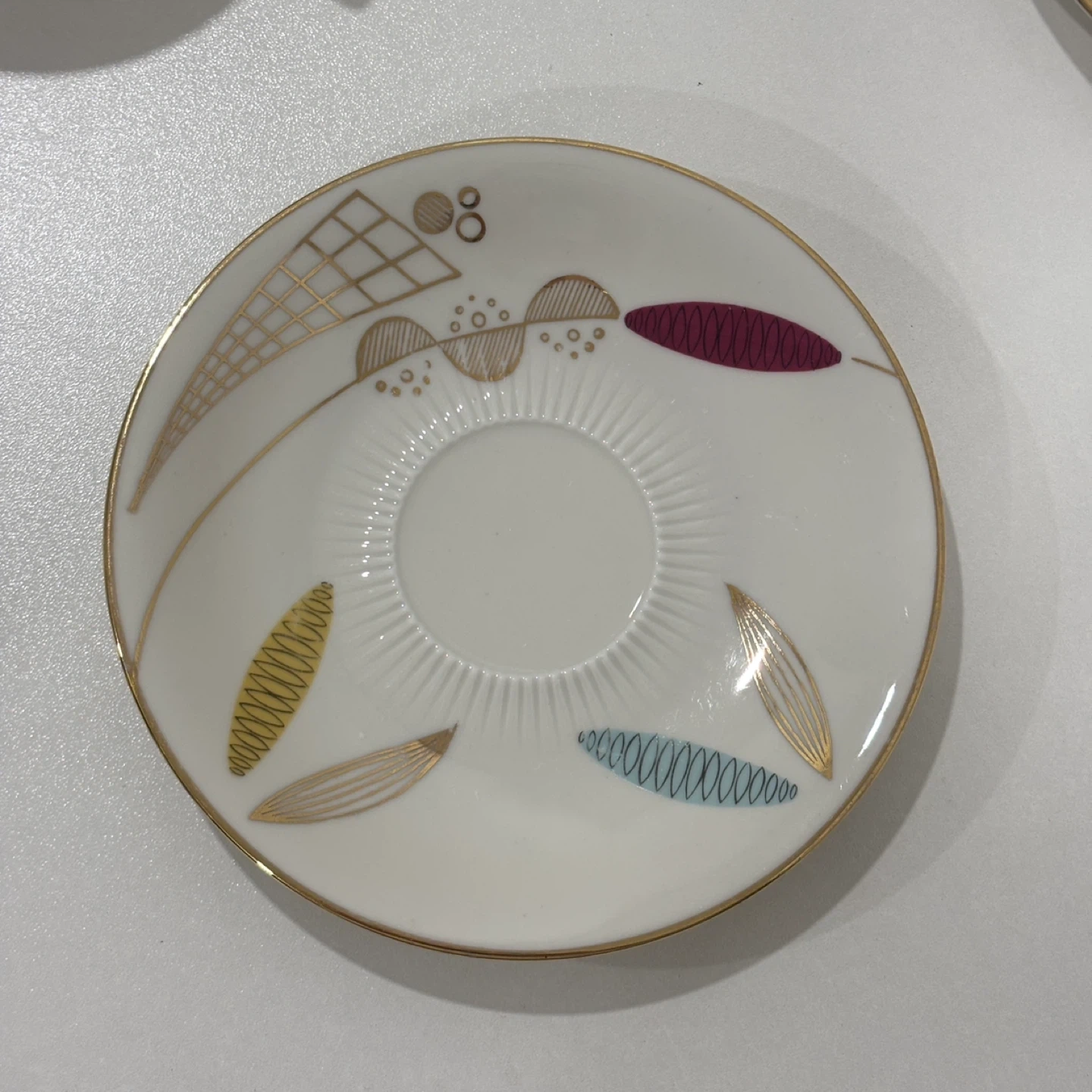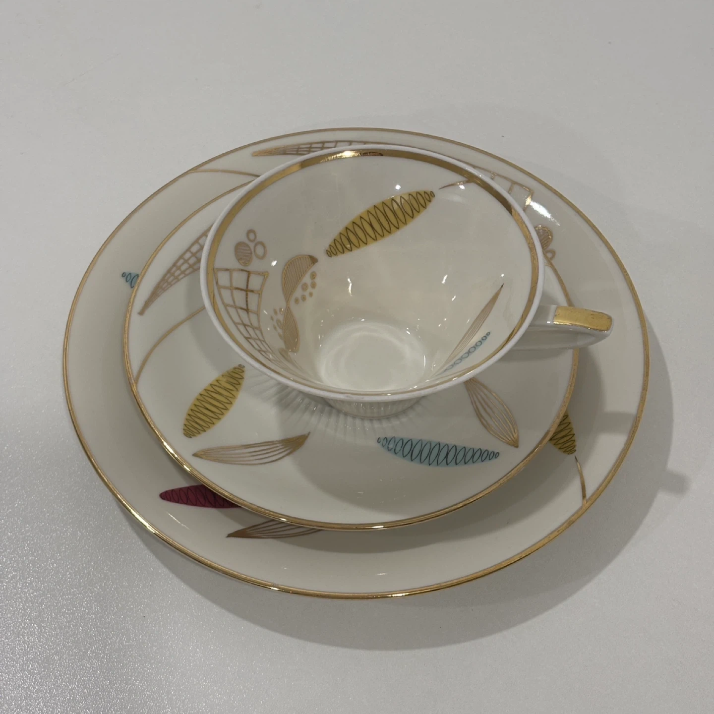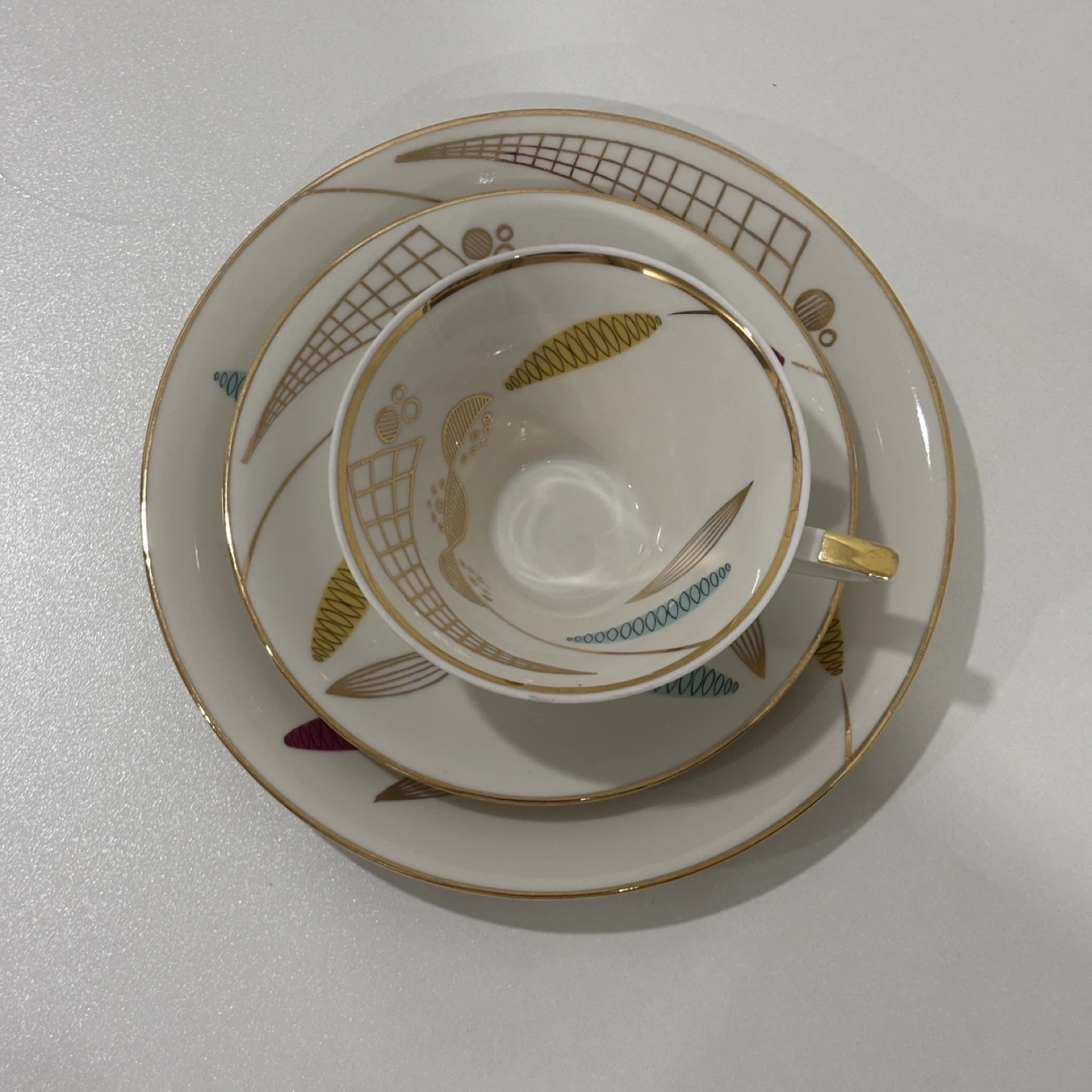 98I have 5 sets. Message to buy more for discount. Here is a vintage tea cup set, complete with a saucer and plate. The set features a unique design with gold trim and colorful accents. It's a charming addition to any collection or a lovely way to enjoy your favorite tea
