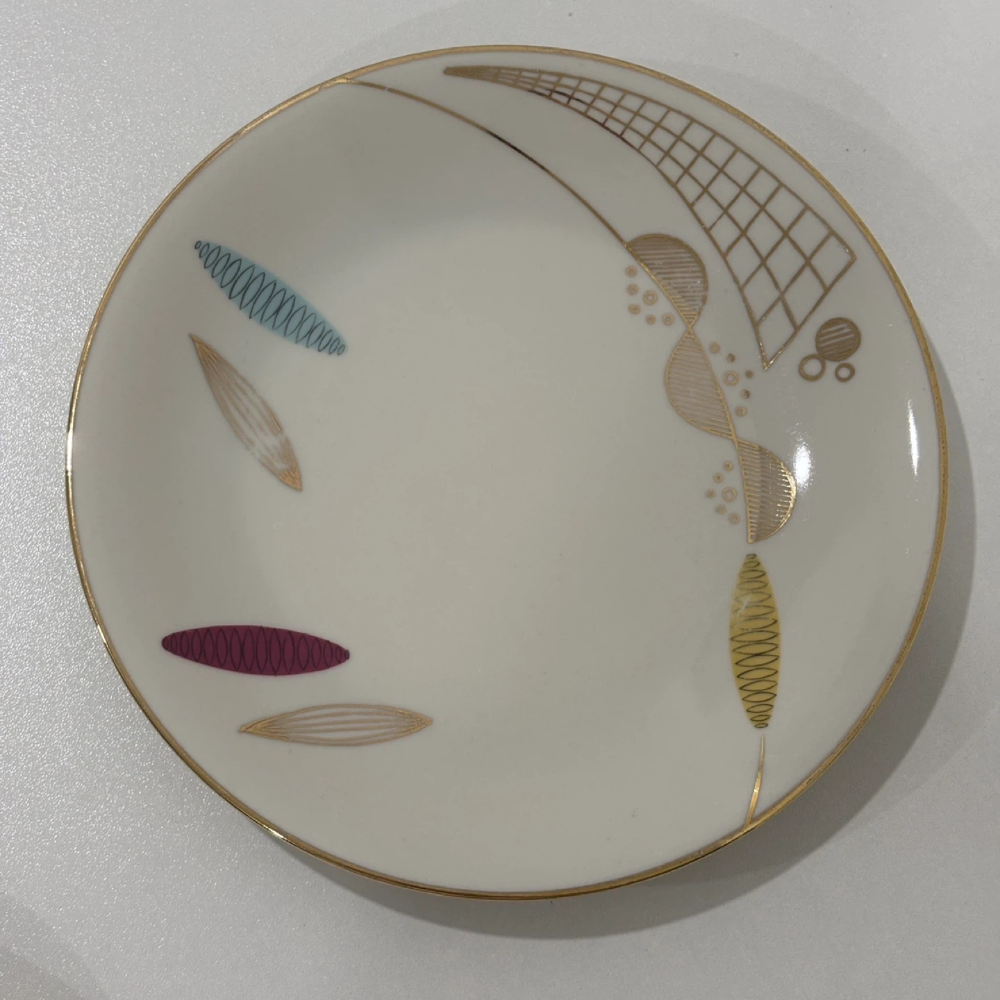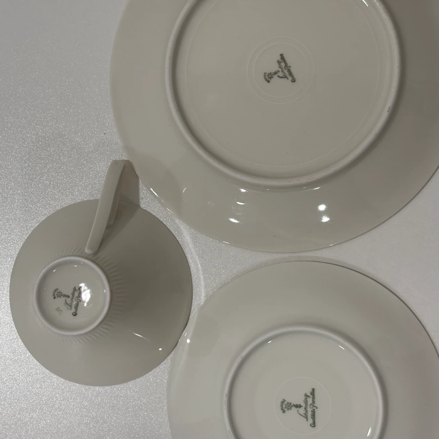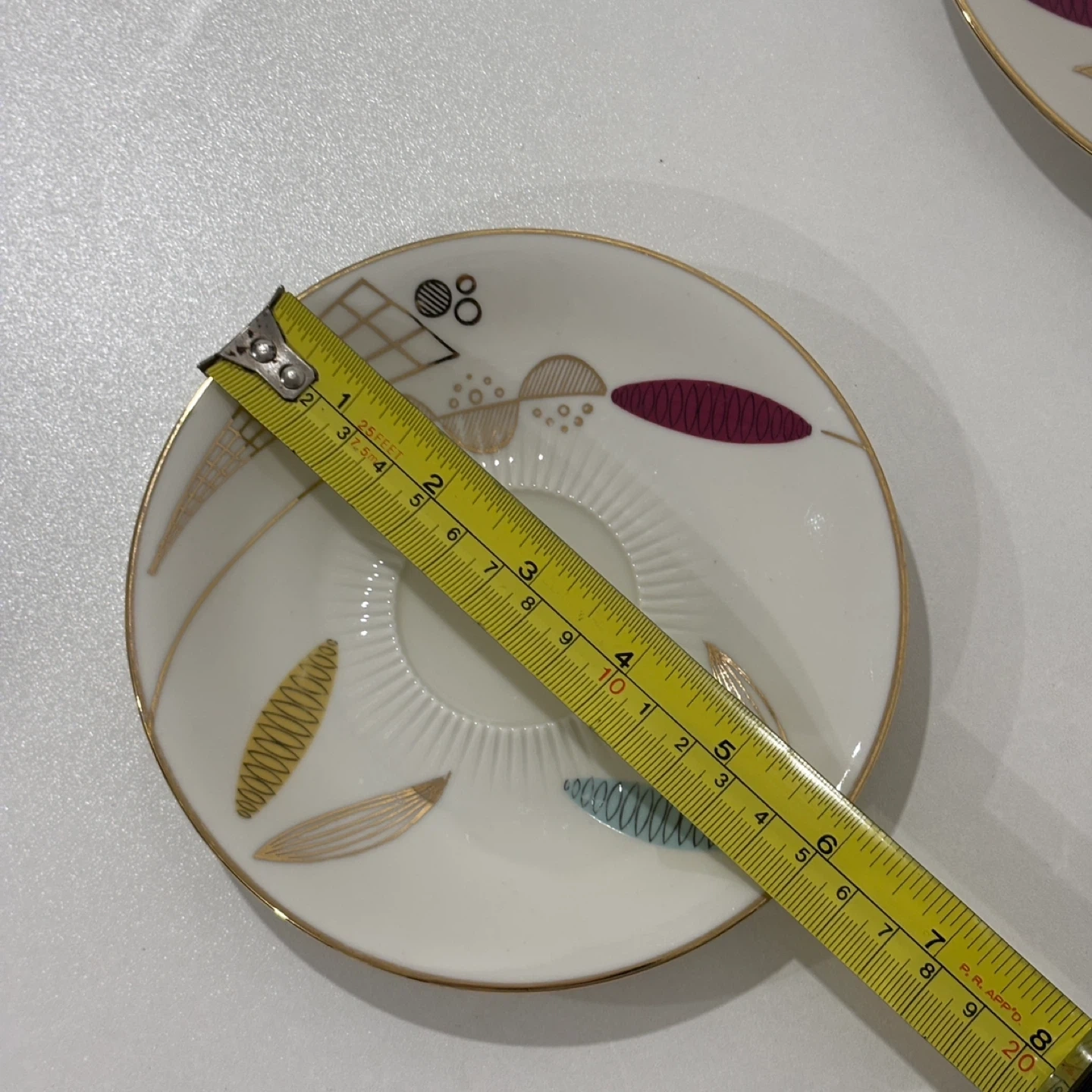 98I have 5 sets. Message to buy more for discount. Here is a vintage tea cup set, complete with a saucer and plate. The set features a unique design with gold trim and colorful accents. It's a charming addition to any collection or a lovely way to enjoy your favorite tea