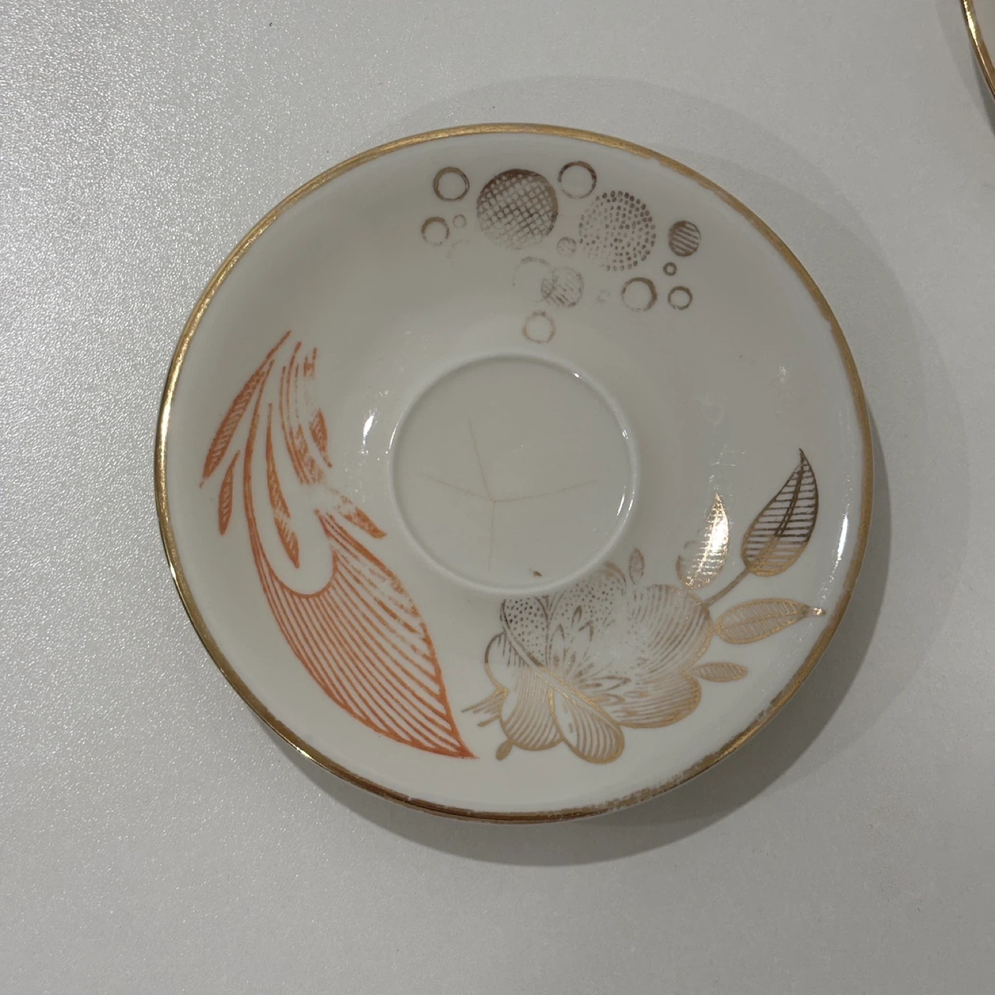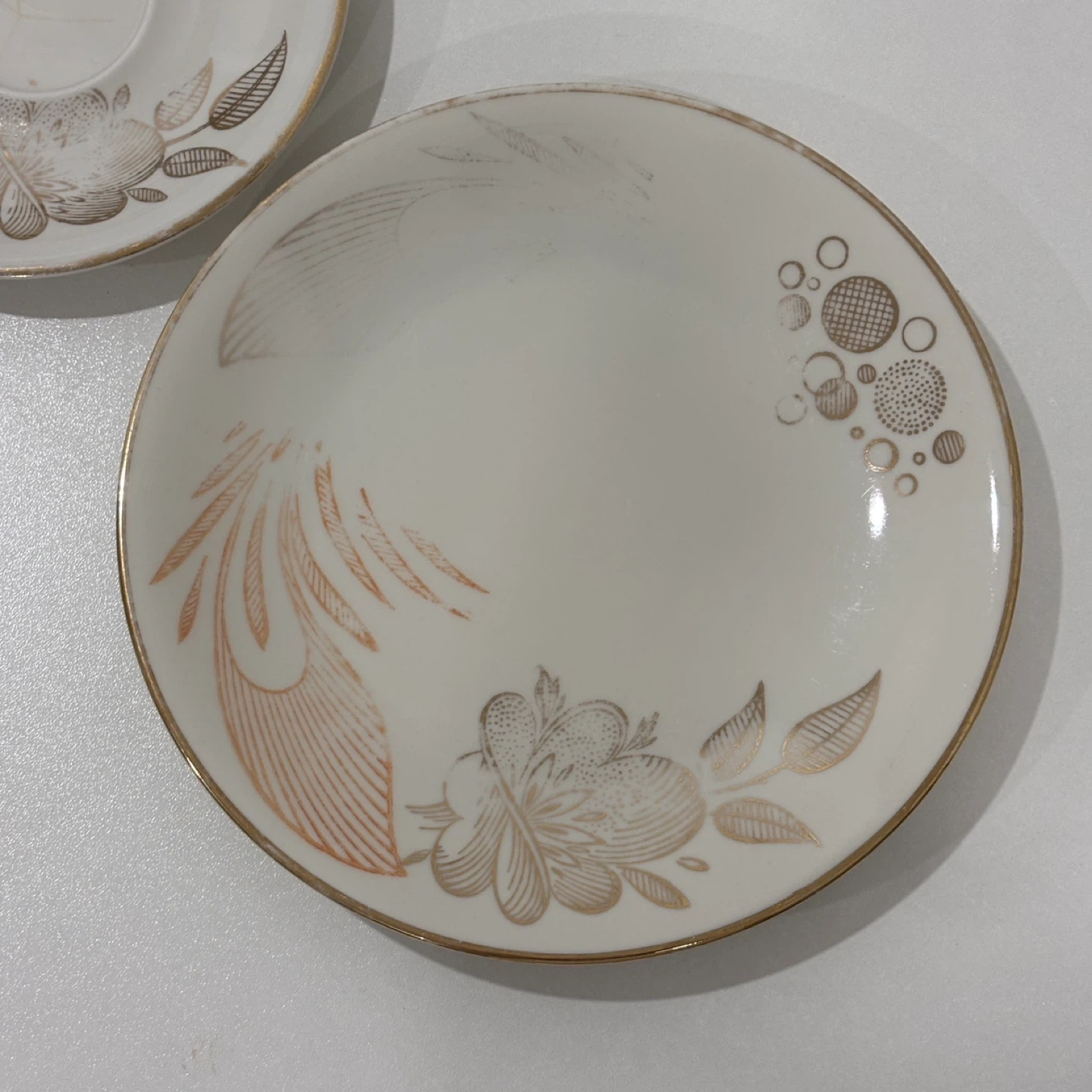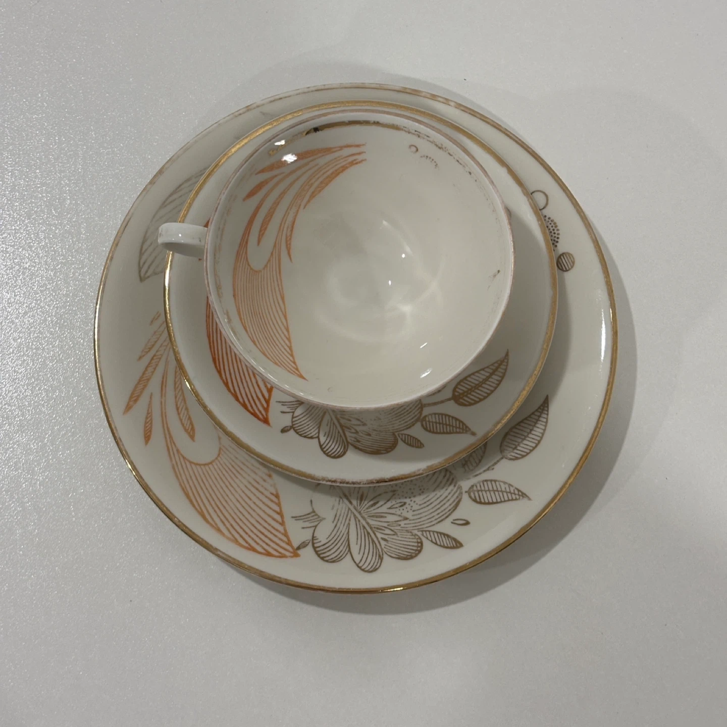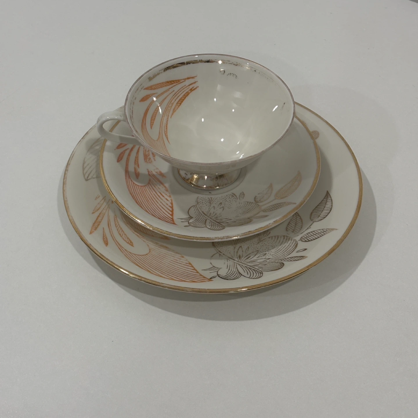 98I have 4 sets. Message to buy more for discount. Selling a vintage tea cup set with a delicate floral design in gold and white. This set includes a cup, saucer, and small plate. It's perfect for adding a touch of elegance to your tea time!
