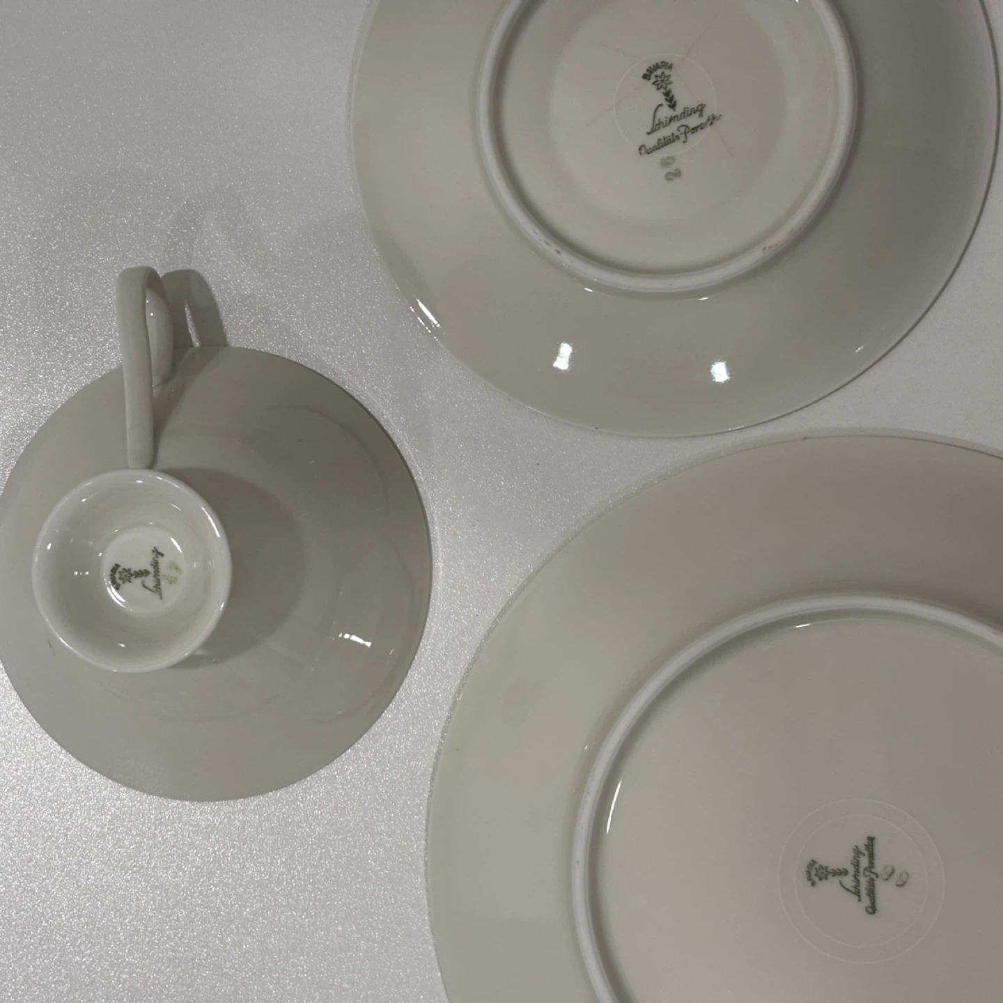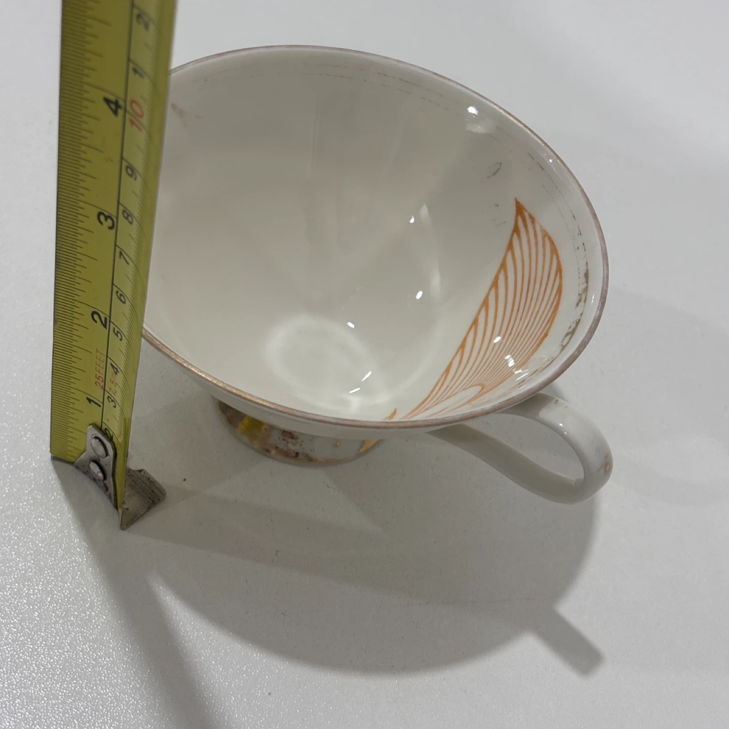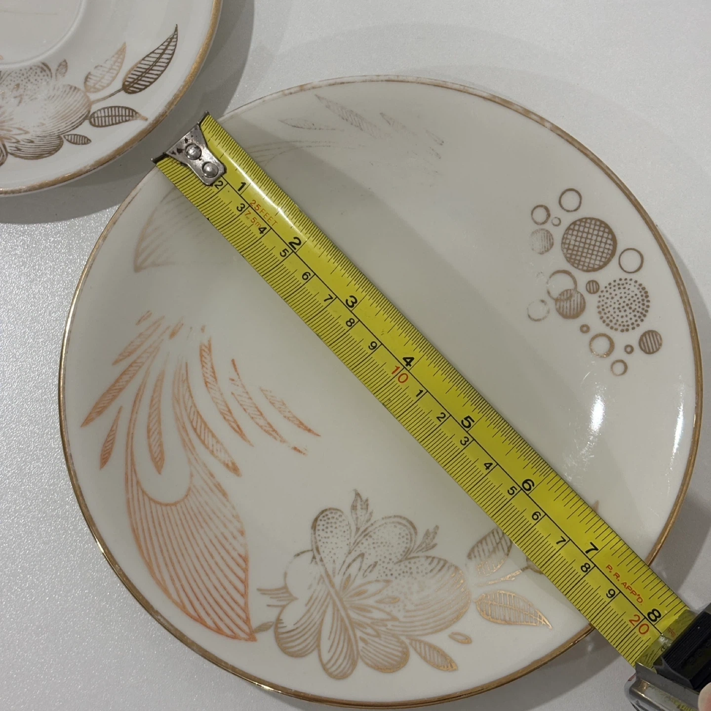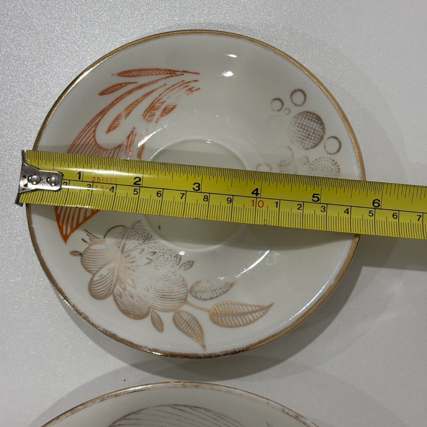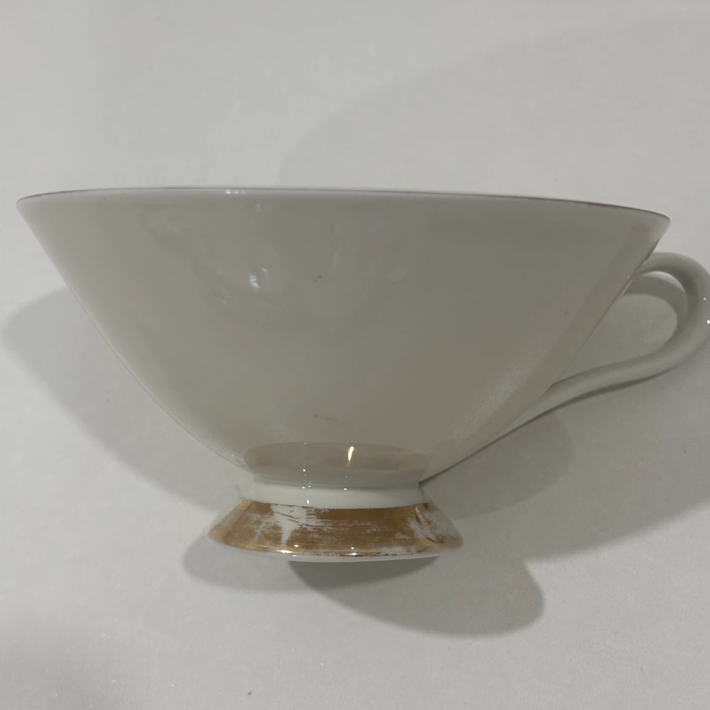 98I have 4 sets. Message to buy more for discount. Selling a vintage tea cup set with a delicate floral design in gold and white. This set includes a cup, saucer, and small plate. It's perfect for adding a touch of elegance to your tea time!