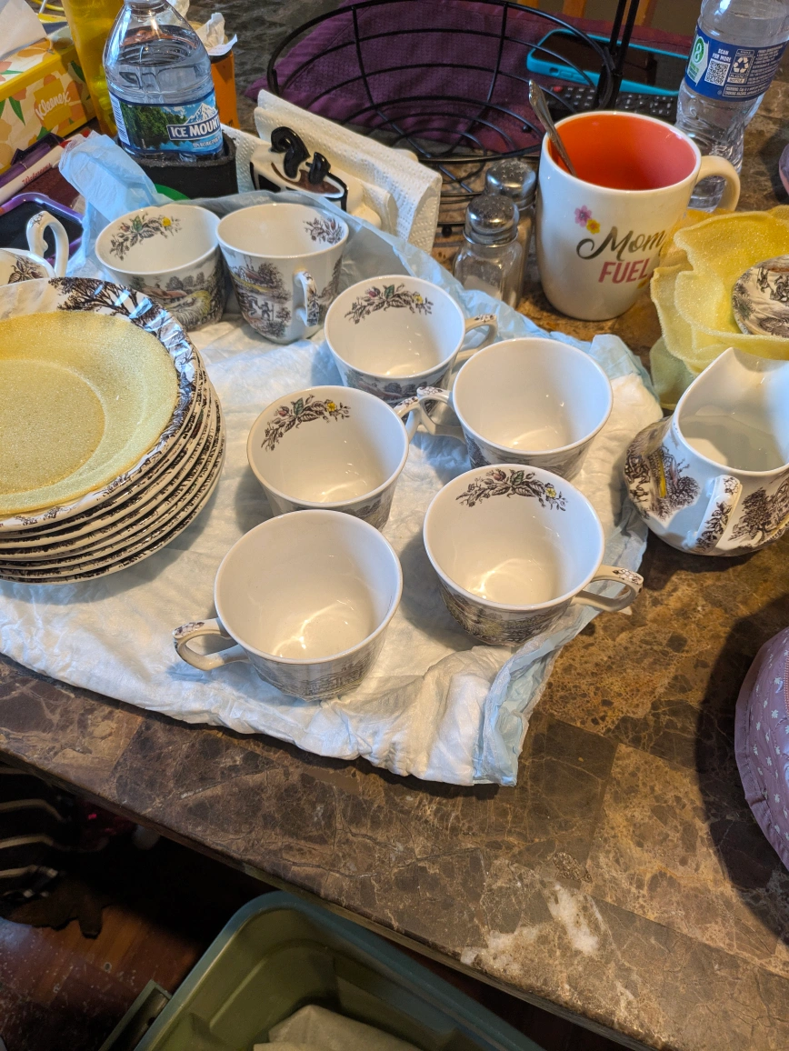 A delightful collection of vintage dishware. Includes several teacups, saucers, and a creamer. A perfect set to enjoy a peaceful afternoon tea.