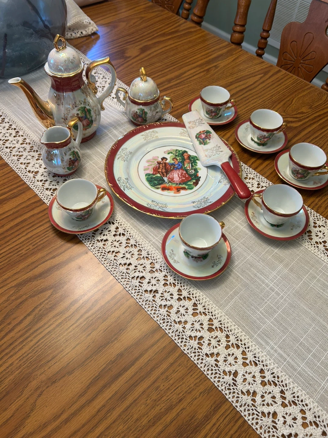 Selling a beautiful vintage tea set! It includes a teapot, creamer, sugar bowl, several cups and saucers, a plate, and a serving utensil. The set has a delicate design with red and gold accents