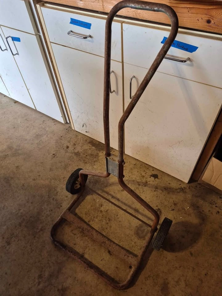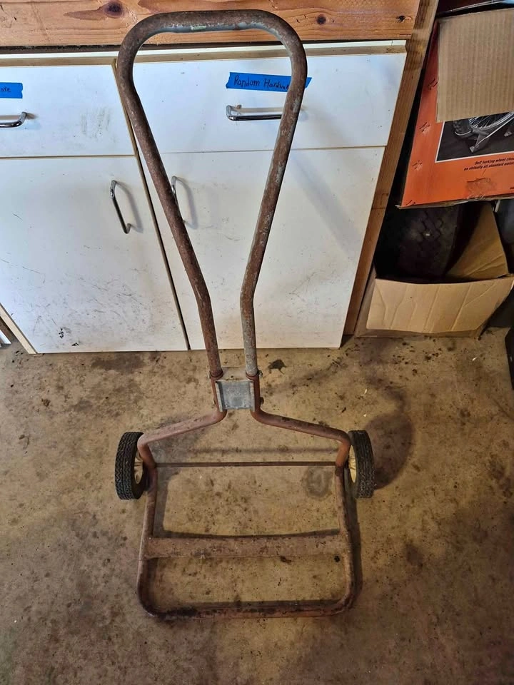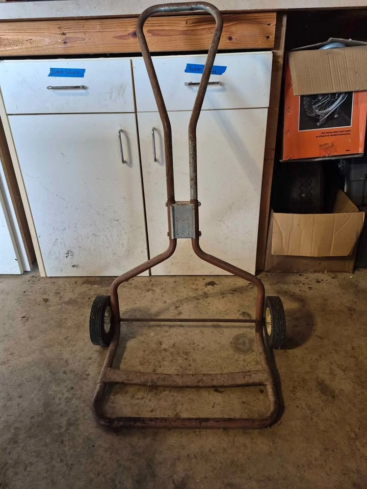 Sturdy metal carrying cart for easily maneuvering trash cans. Garage front pickup Waterman IL