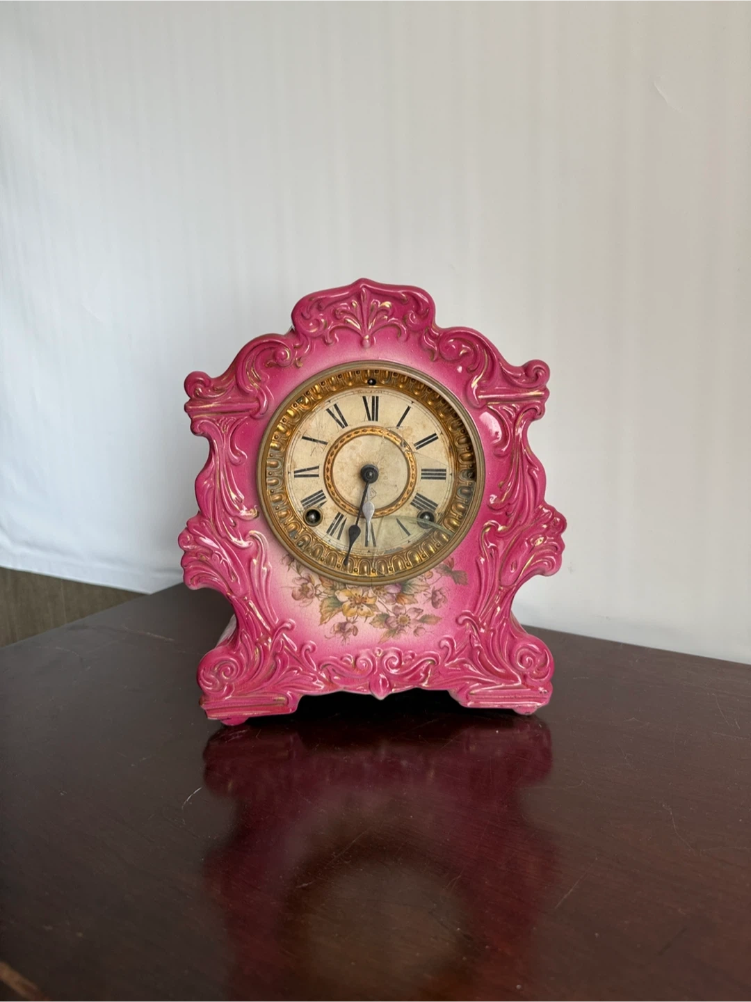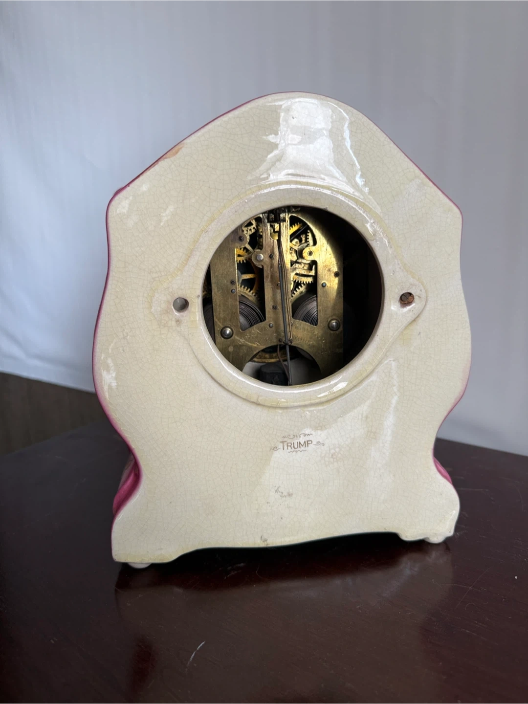 Selling a vintage Trump mantel clock in a unique pink color. The clock has a beautiful floral design and gold accents. Please note that the glass is cracked. It would be a great decorative piece!