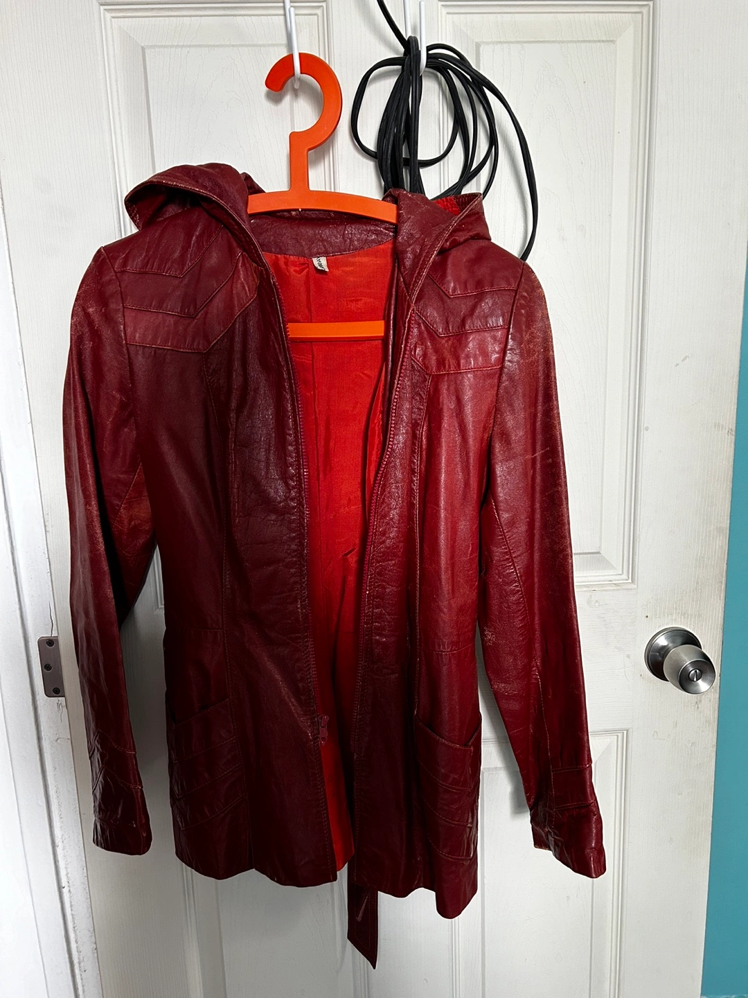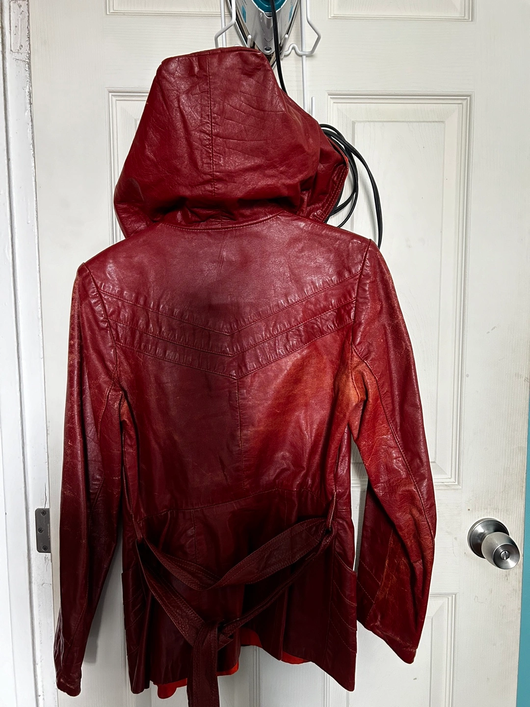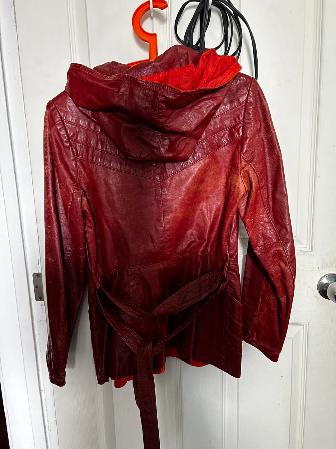 Burgundy leather jacket. Features a hood and a self-tie belt. Long sleeves. Pockets. Shows some wear.
