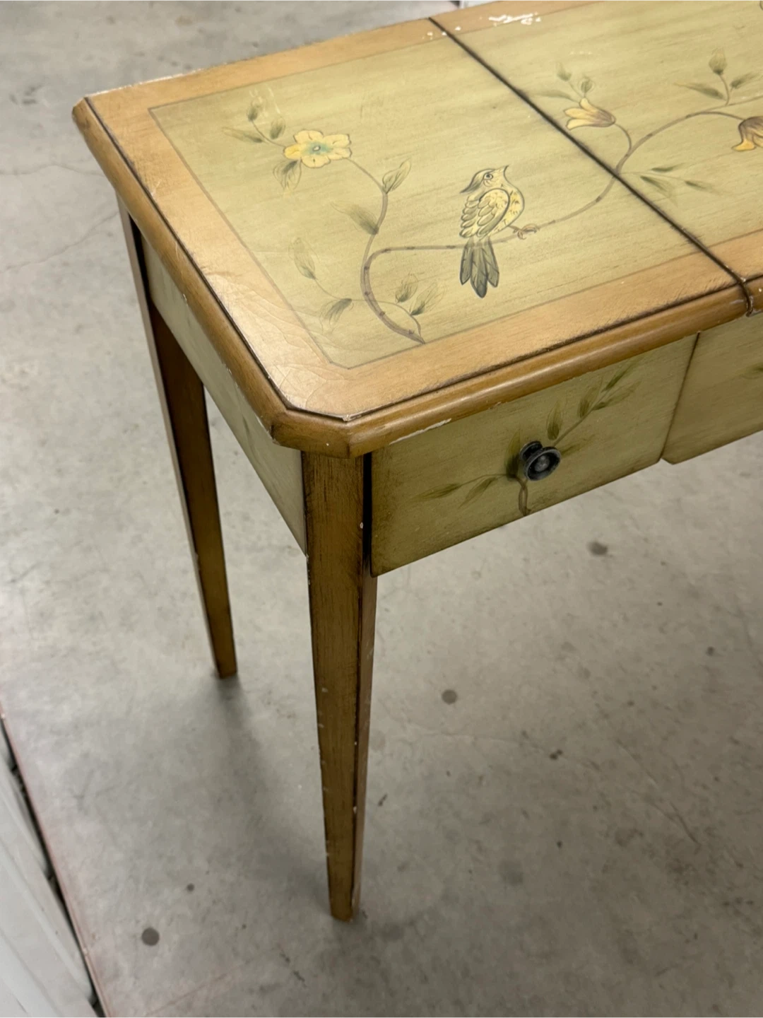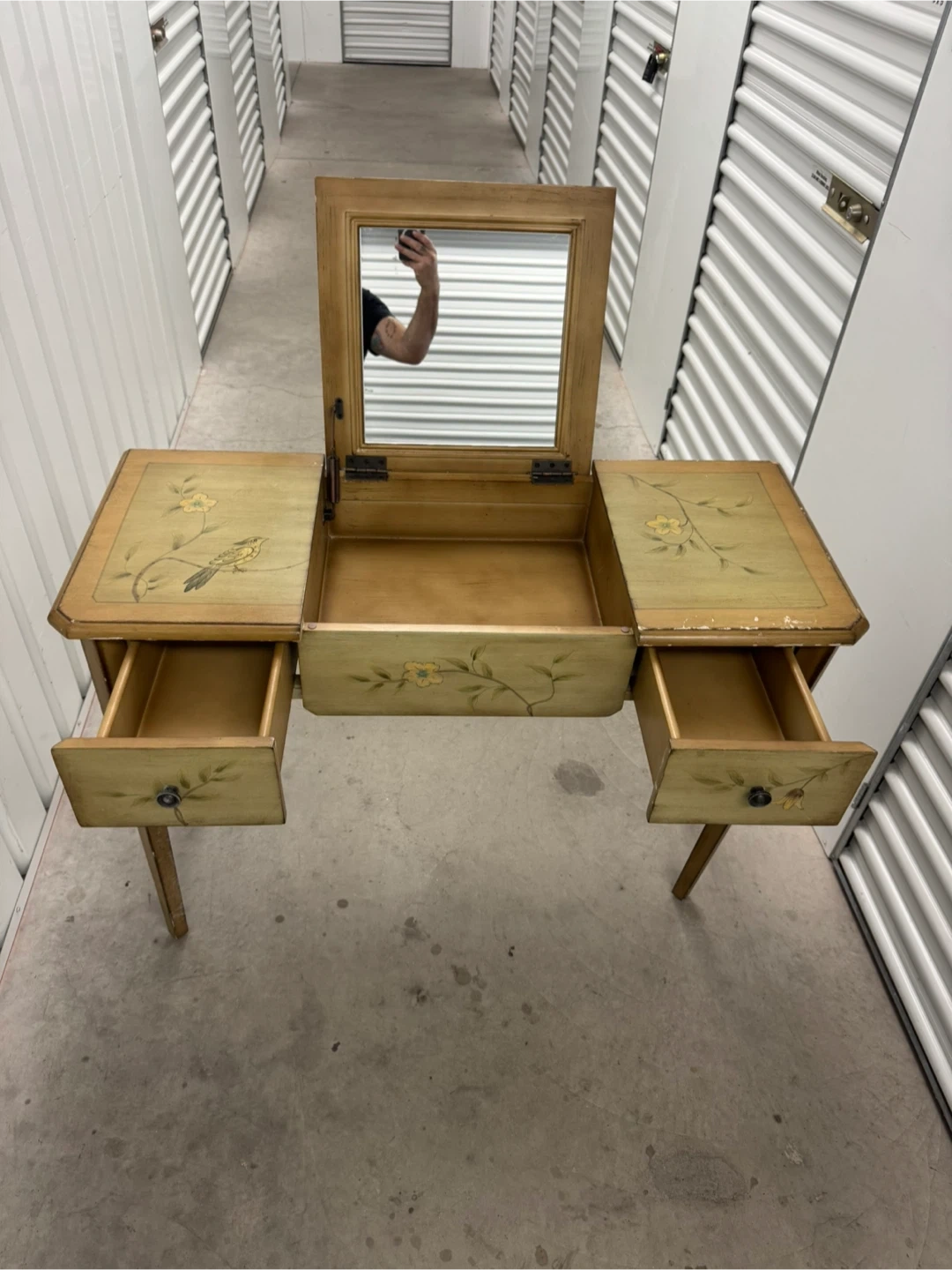 89Selling a cute vintage vanity desk! It features a unique bird and floral design on a light green background. The desk has a flip-up mirror and drawers for storage. It's a charming piece for any room! 40” x 16” x 30.5” **Willing to Deliver**