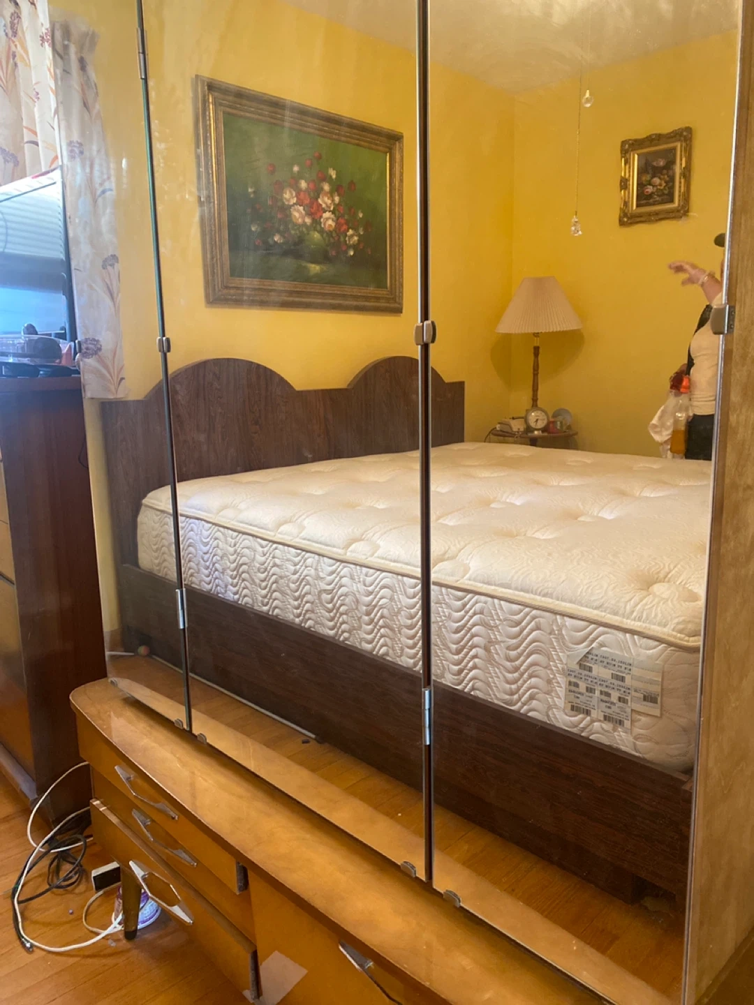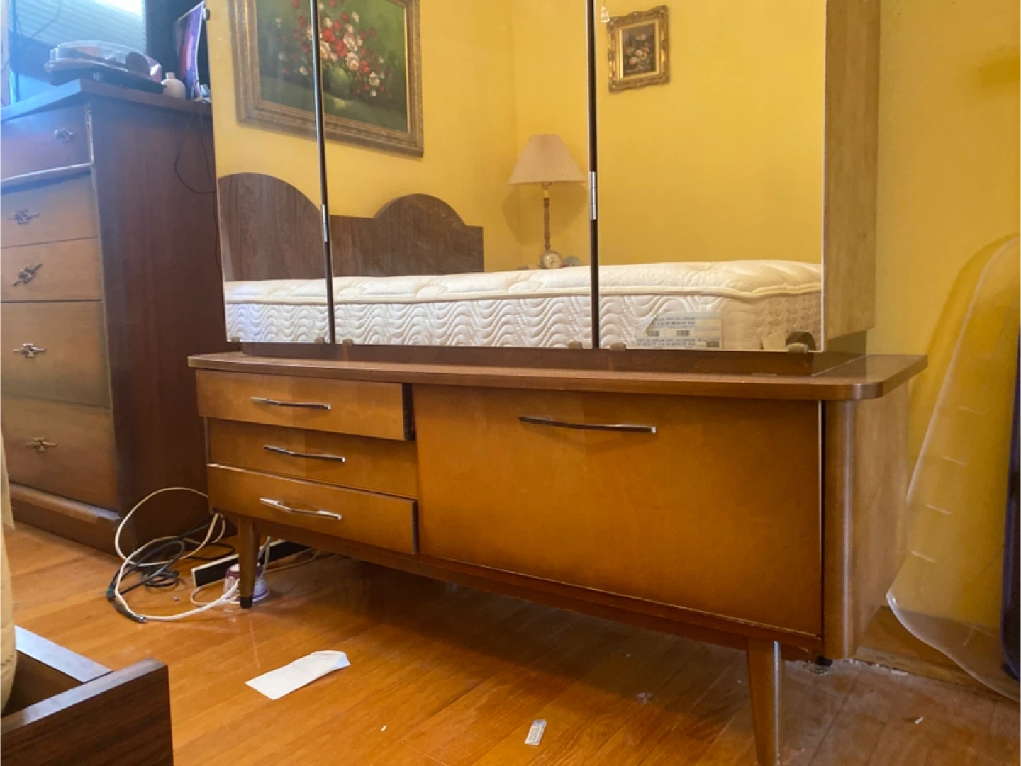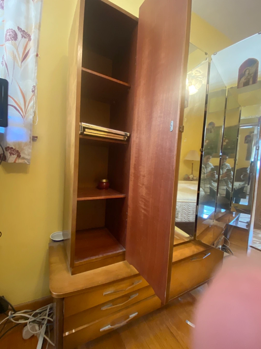 Selling a vintage vanity with a mirror and drawers. It's a unique piece that could add some charm to your space. It features a wooden frame and a set of drawers for storage. The mirror is a nice touch for getting ready in the morning