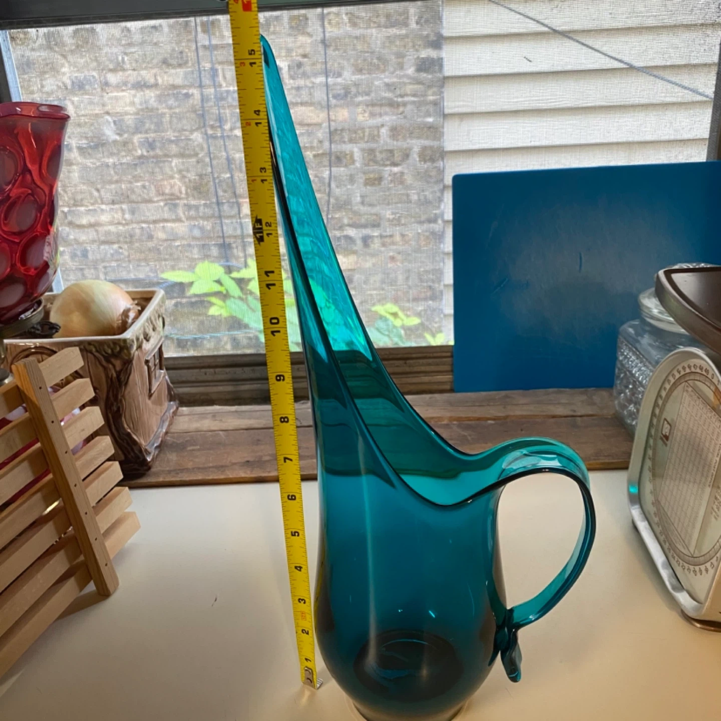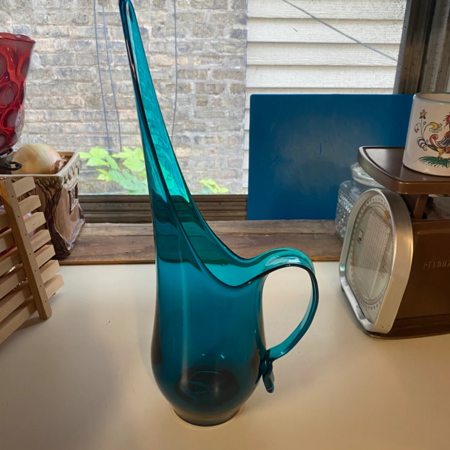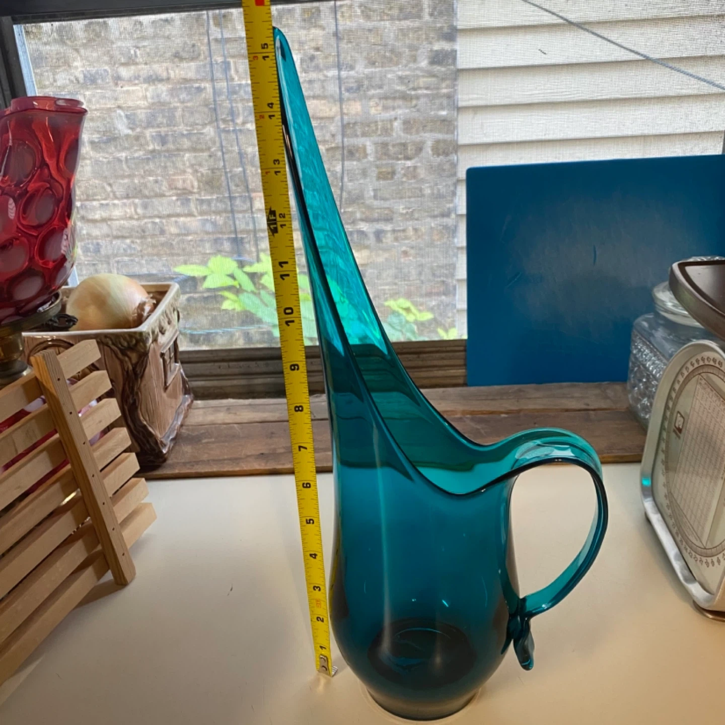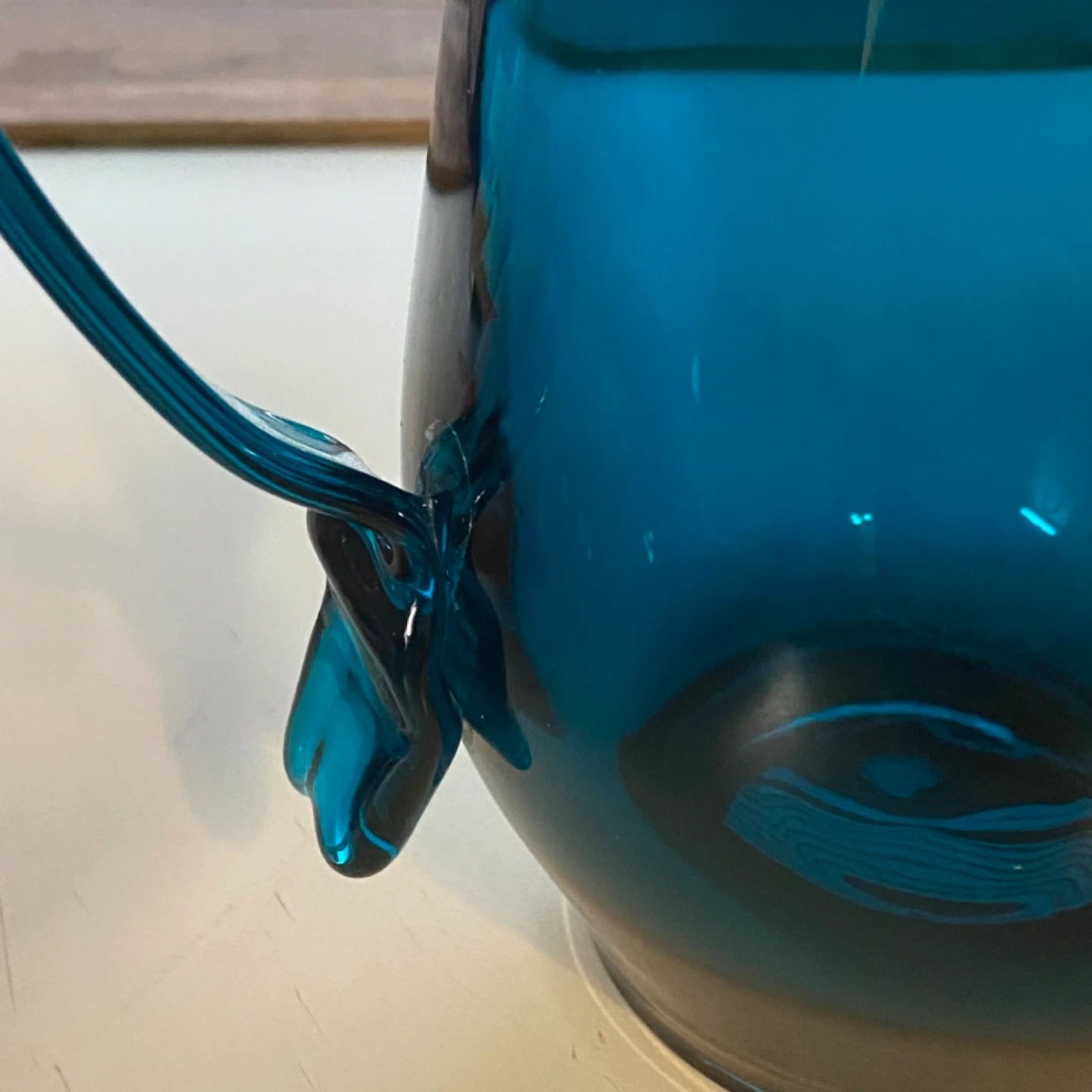 Selling a vintage Viking Glass Bluenique stretch swung pitcher vase. measures approximately 15 inches tall. No chips or cracks. The base of the handle did separate from the picture itself, but it is not cracked. I highly recommend not picking it up by the handle. In great condition otherwise. Pick up at Oakley and Addison.