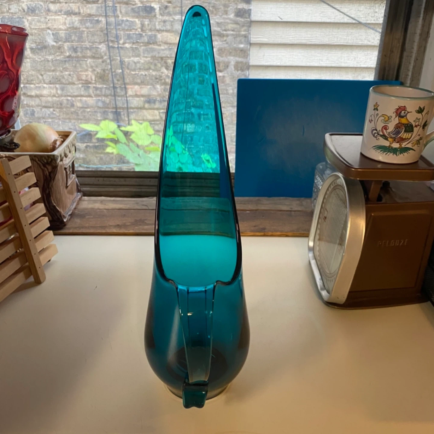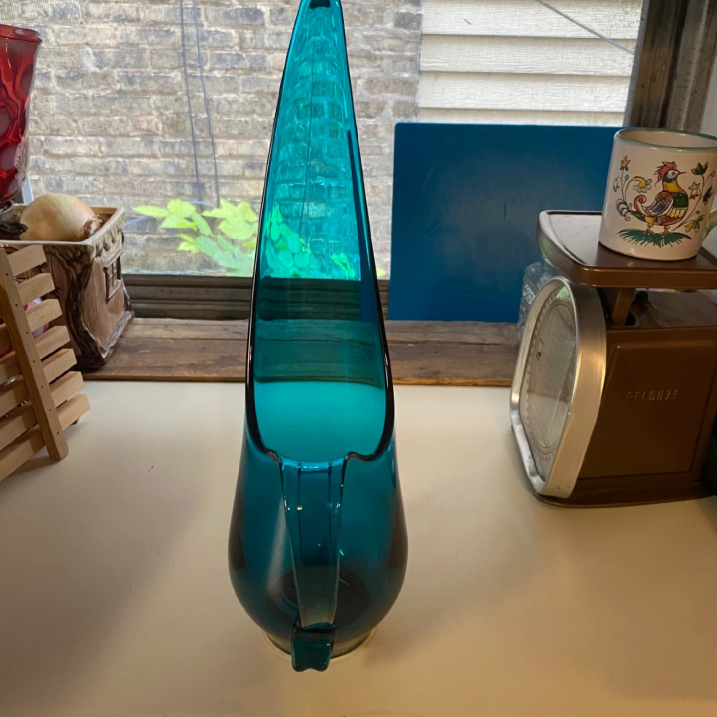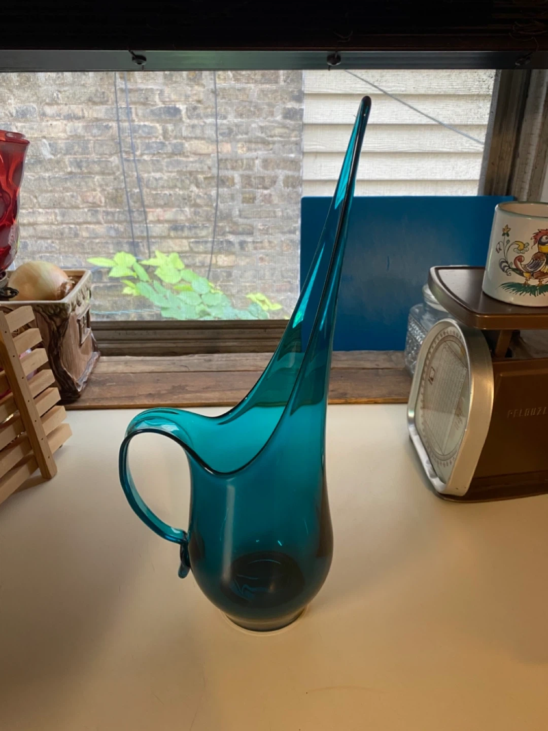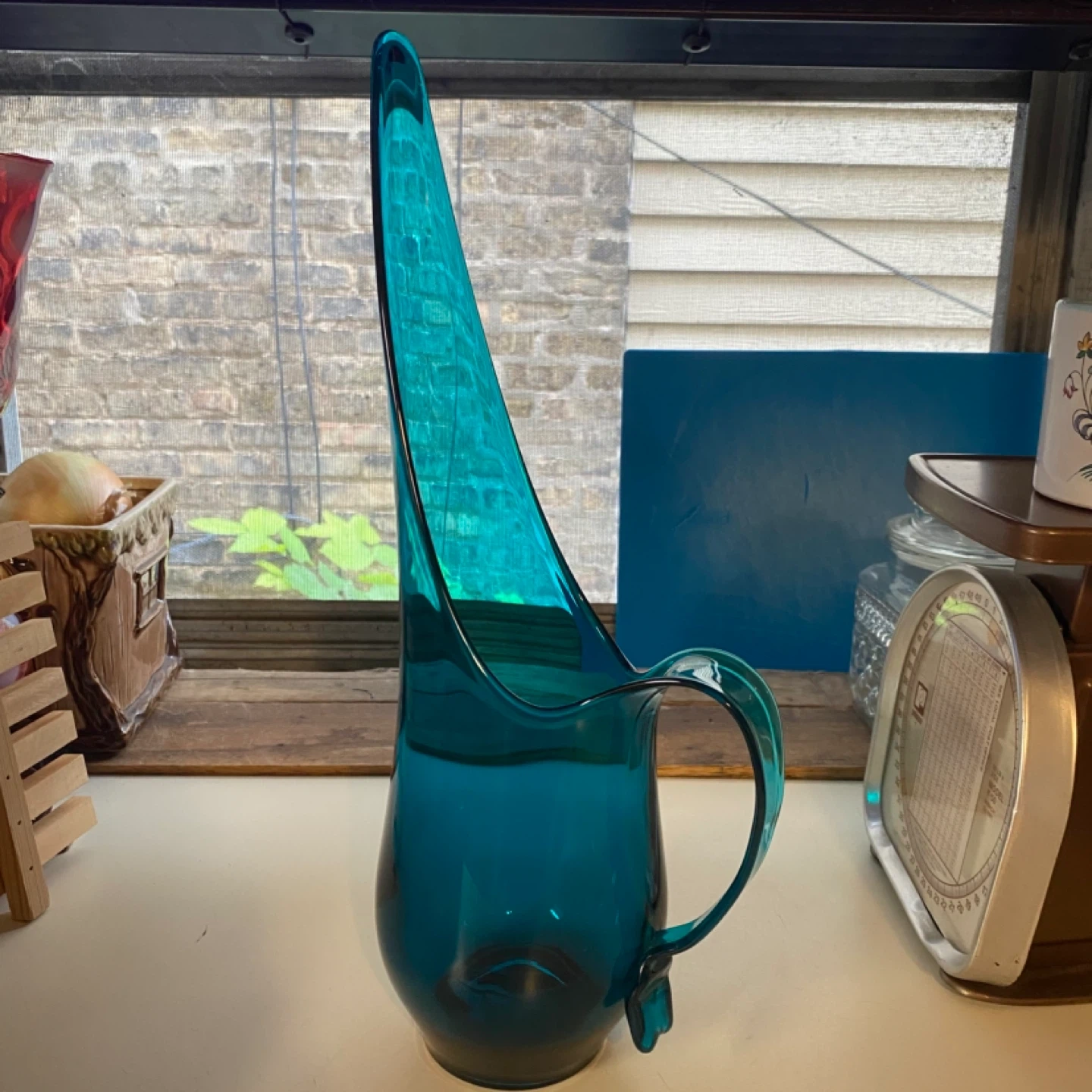 Selling a vintage Viking Glass Bluenique stretch swung pitcher vase. measures approximately 15 inches tall. No chips or cracks. The base of the handle did separate from the picture itself, but it is not cracked. I highly recommend not picking it up by the handle. In great condition otherwise. Pick up at Oakley and Addison.