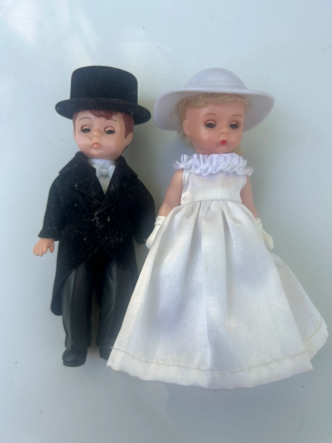 Selling a pair of vintage wedding dolls! They're dressed in traditional wedding attire: a bride in a white dress and veil, and a groom in a black suit and top hat. Perfect for collectors or as a charming decorative piece