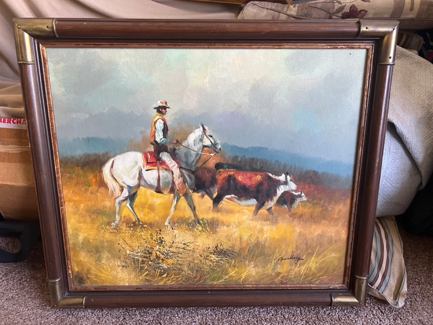 Oil painting on canvas. Depicts a cowboy on horseback with cattle in a field. Framed in dark wood. Beautiful colors and details. Make offer!
