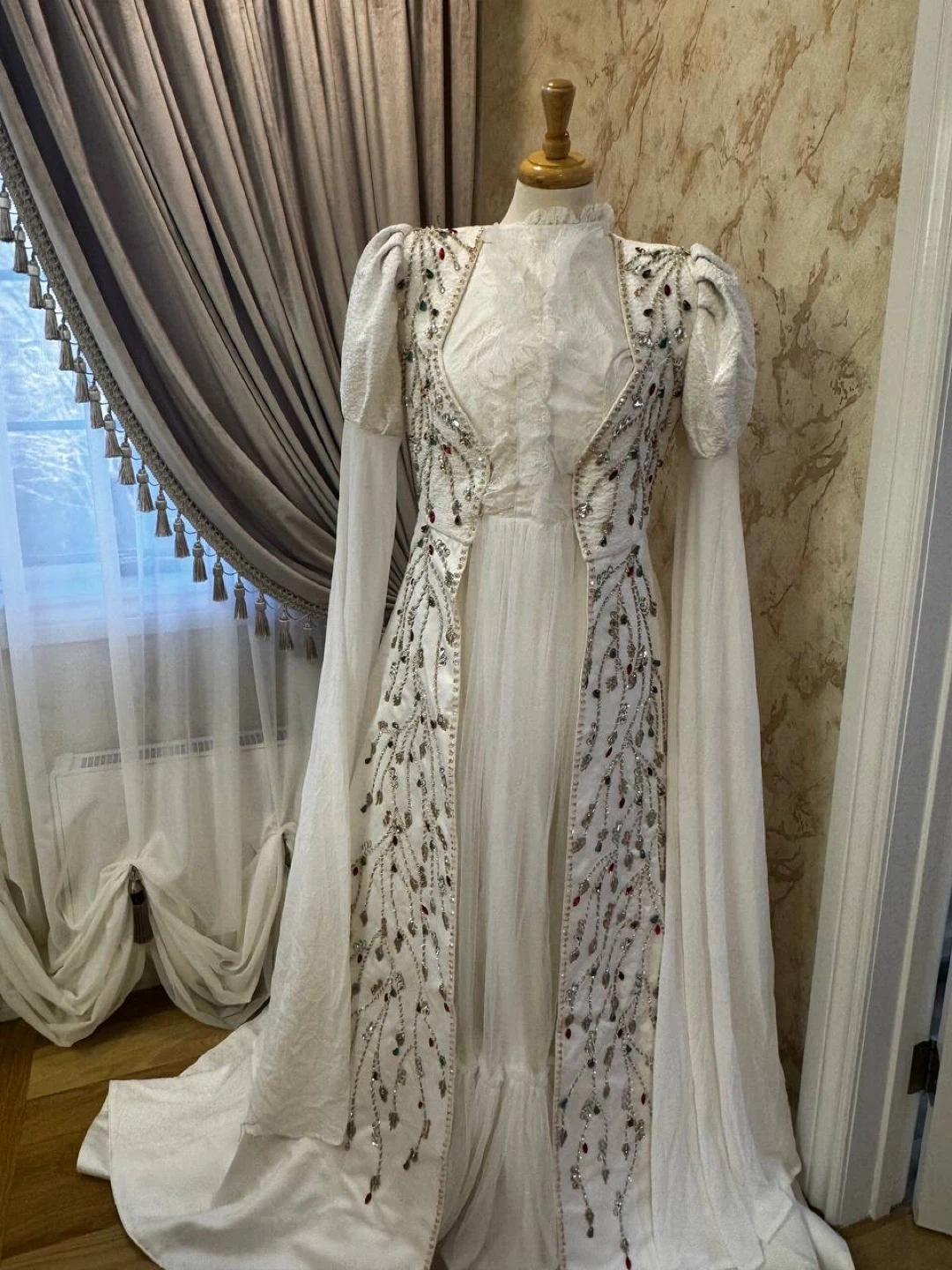 5This is a beautiful vintage white dress with delicate lace and embellishments. It has a unique and elegant design. Perfect for a special occasion or a vintage-inspired look!