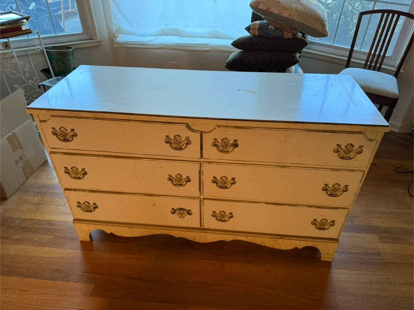 70Selling a vintage white dresser with six drawers. It has a classic design with ornate gold-colored drawer pulls. It shows some signs of wear, but is still a charming piece of furniture