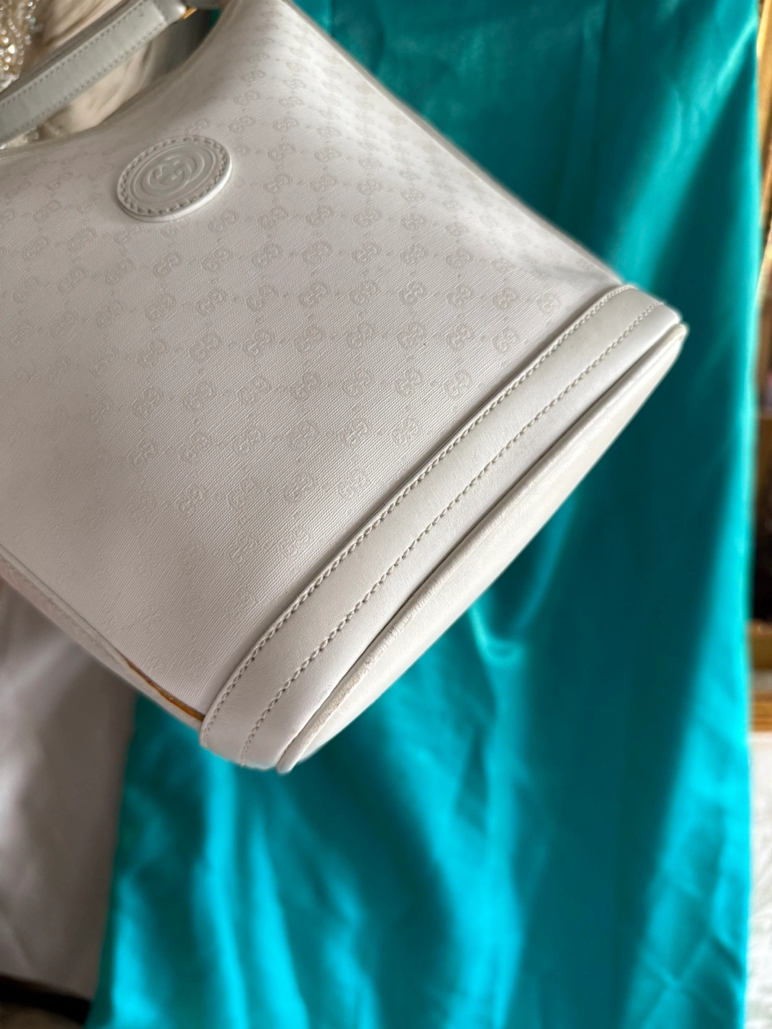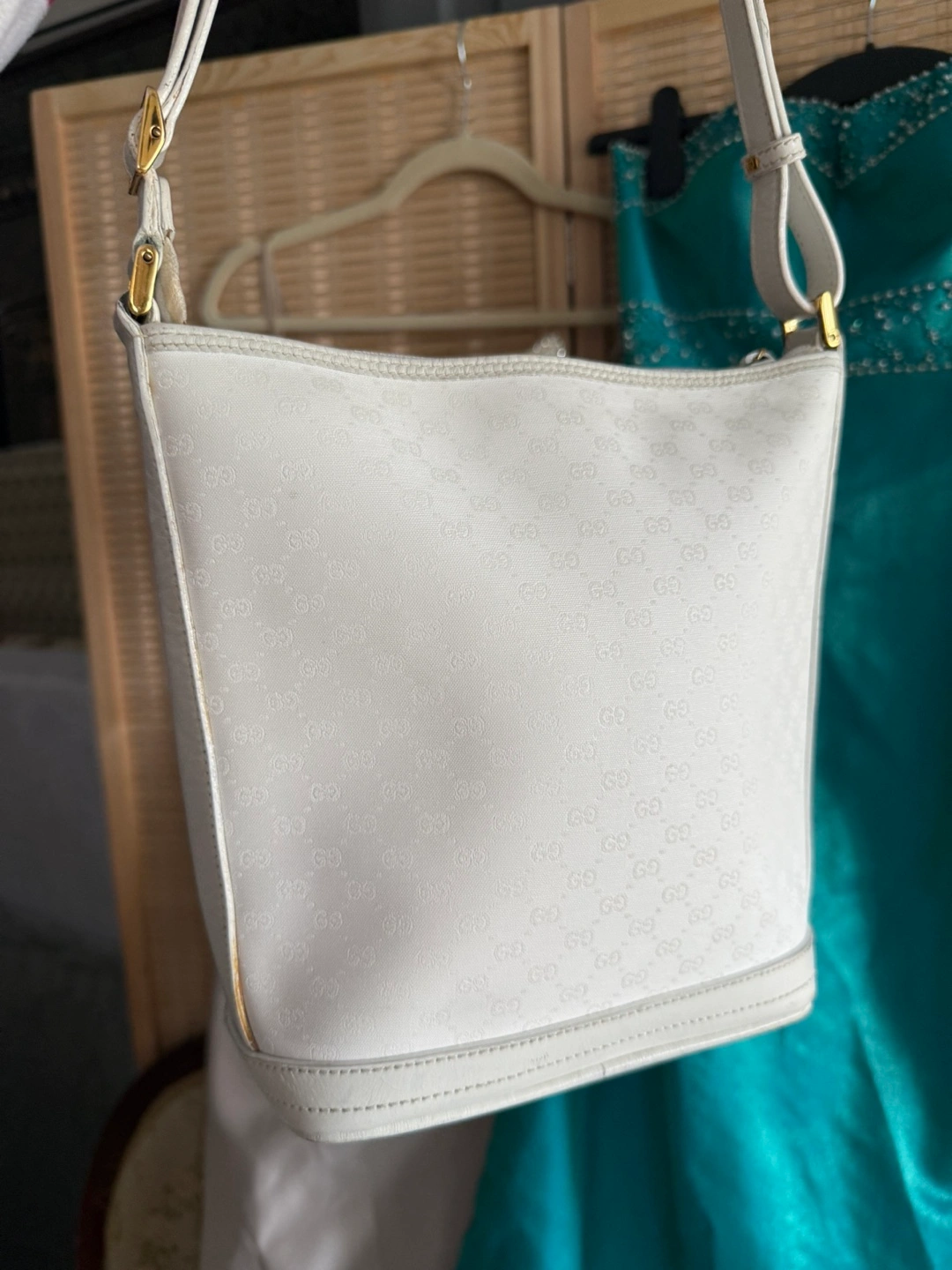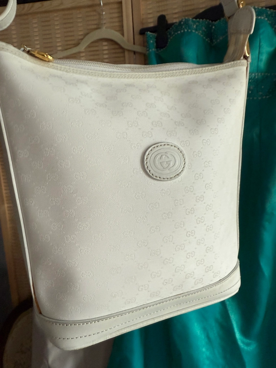 Vintage White Gucci bag.Monogram all over Includes a shoulder strap and zipper closure. Has some flaws due to its age, some of the flaws are show in the pictures.ill try my best to clean it up as much as I can but I don’t want to damage it because it is vintage.peeling on the inside as show in pictures. But still looks super beautiful.i seen them getting sold for $450 - $550.Message me for additional pictures.It also comes with its authentication information, which will be provided when it gets picked up. Cash only and no meeting up,you must pick it up.