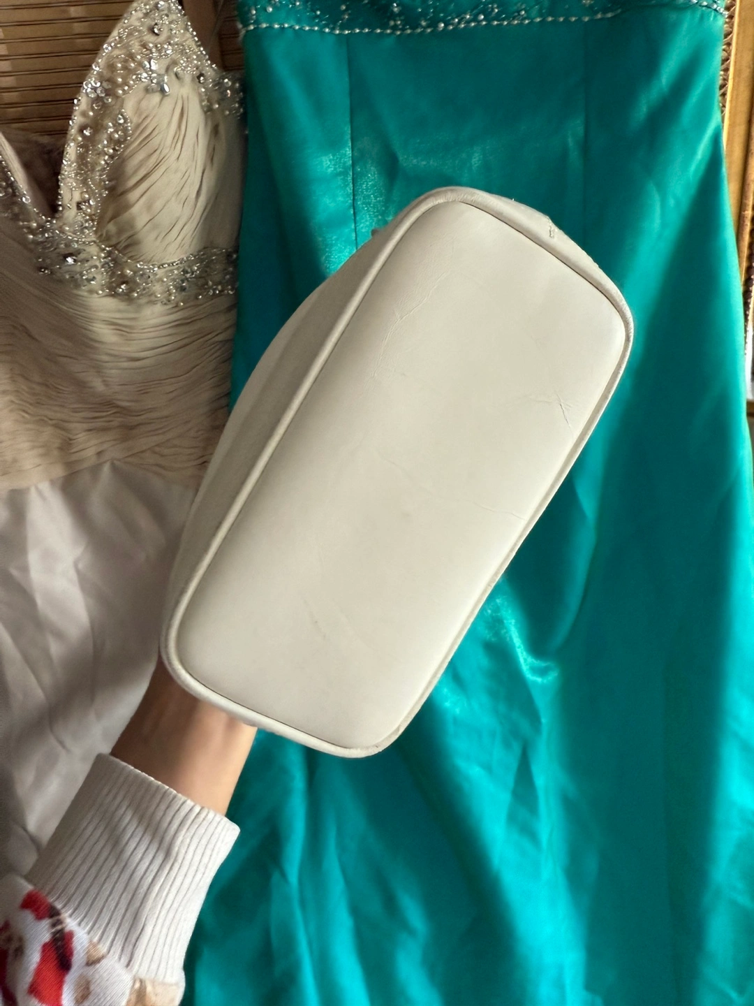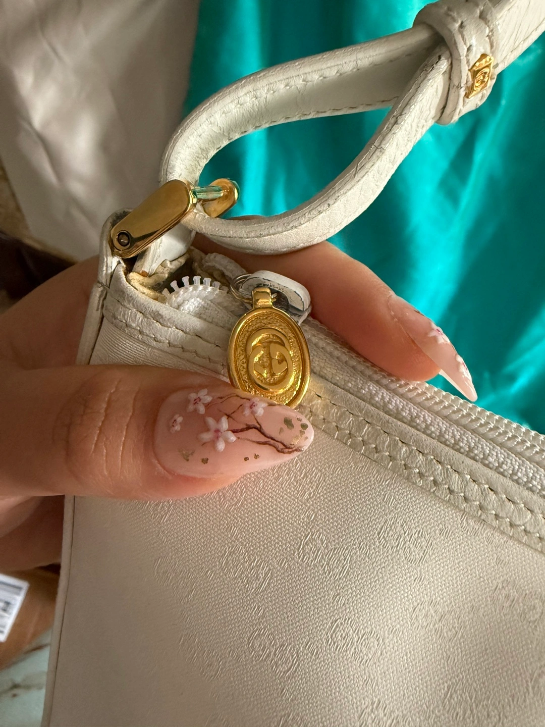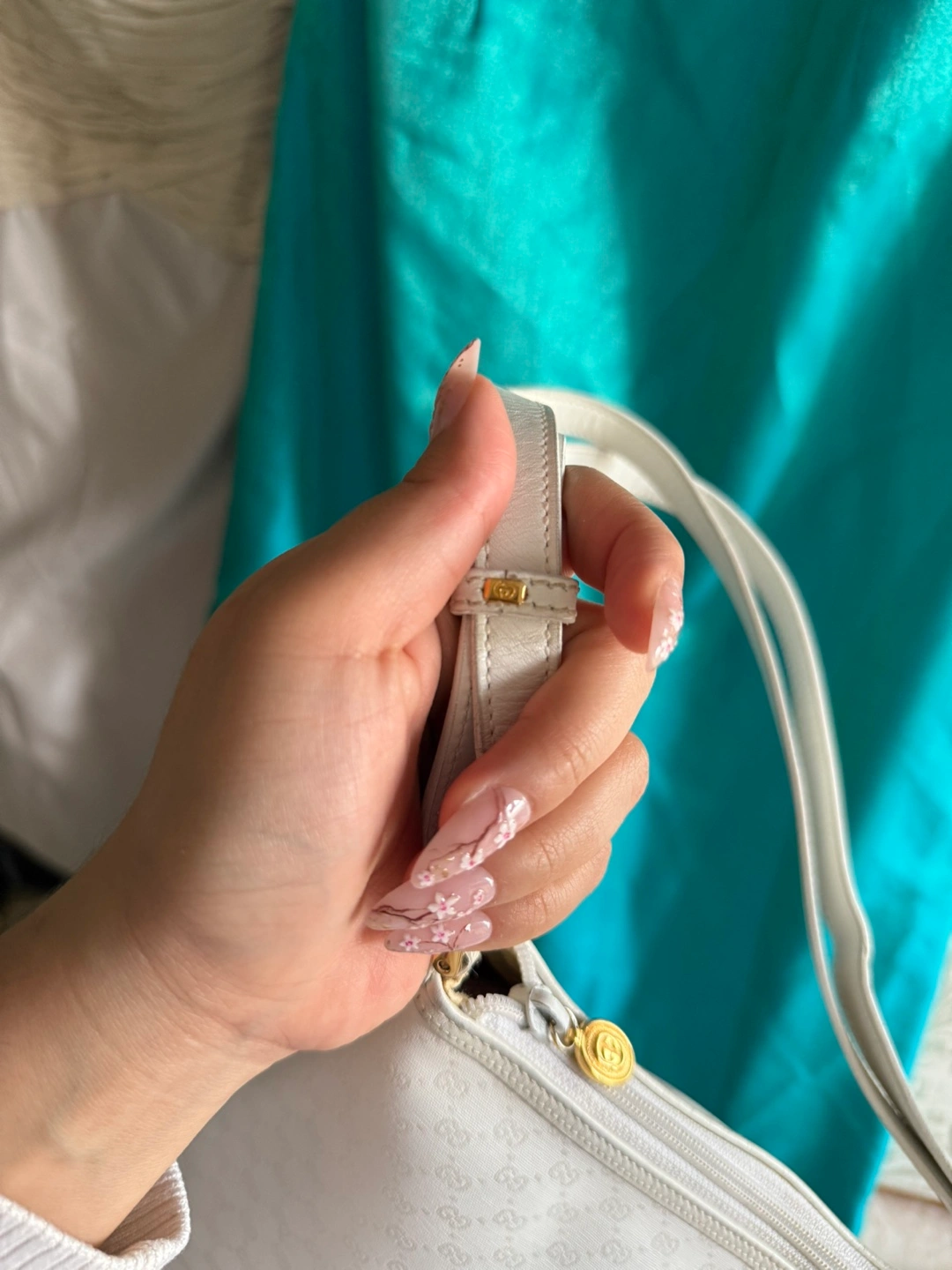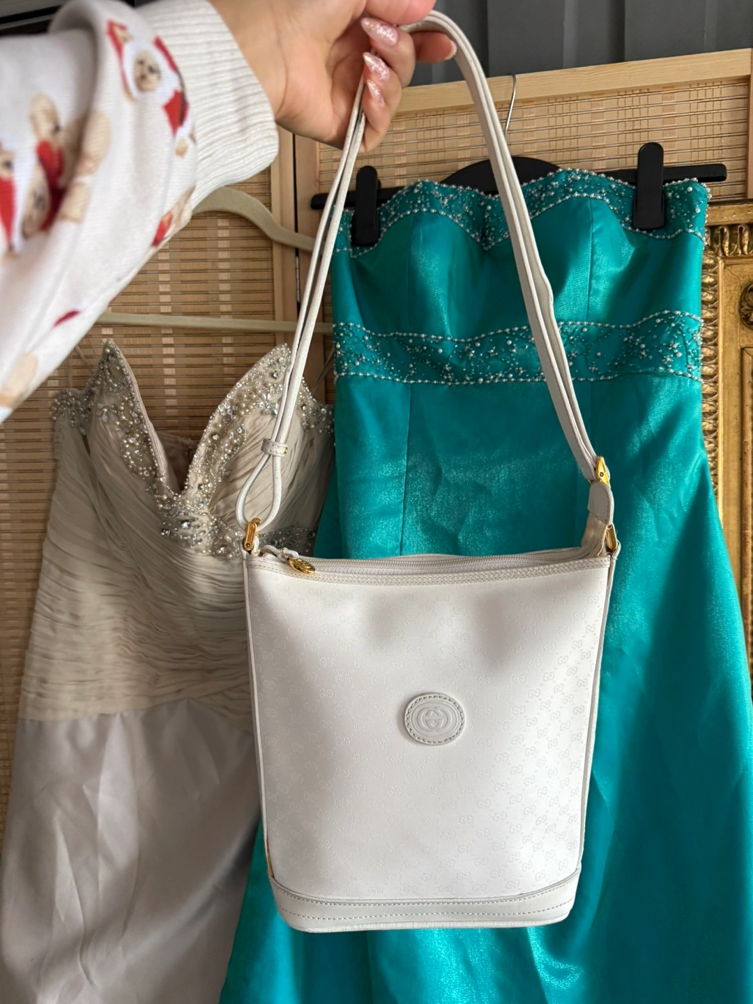 Vintage White Gucci bag.Monogram all over Includes a shoulder strap and zipper closure. Has some flaws due to its age, some of the flaws are show in the pictures.ill try my best to clean it up as much as I can but I don’t want to damage it because it is vintage.peeling on the inside as show in pictures. But still looks super beautiful.i seen them getting sold for $450 - $550.Message me for additional pictures.It also comes with its authentication information, which will be provided when it gets picked up. Cash only and no meeting up,you must pick it up.