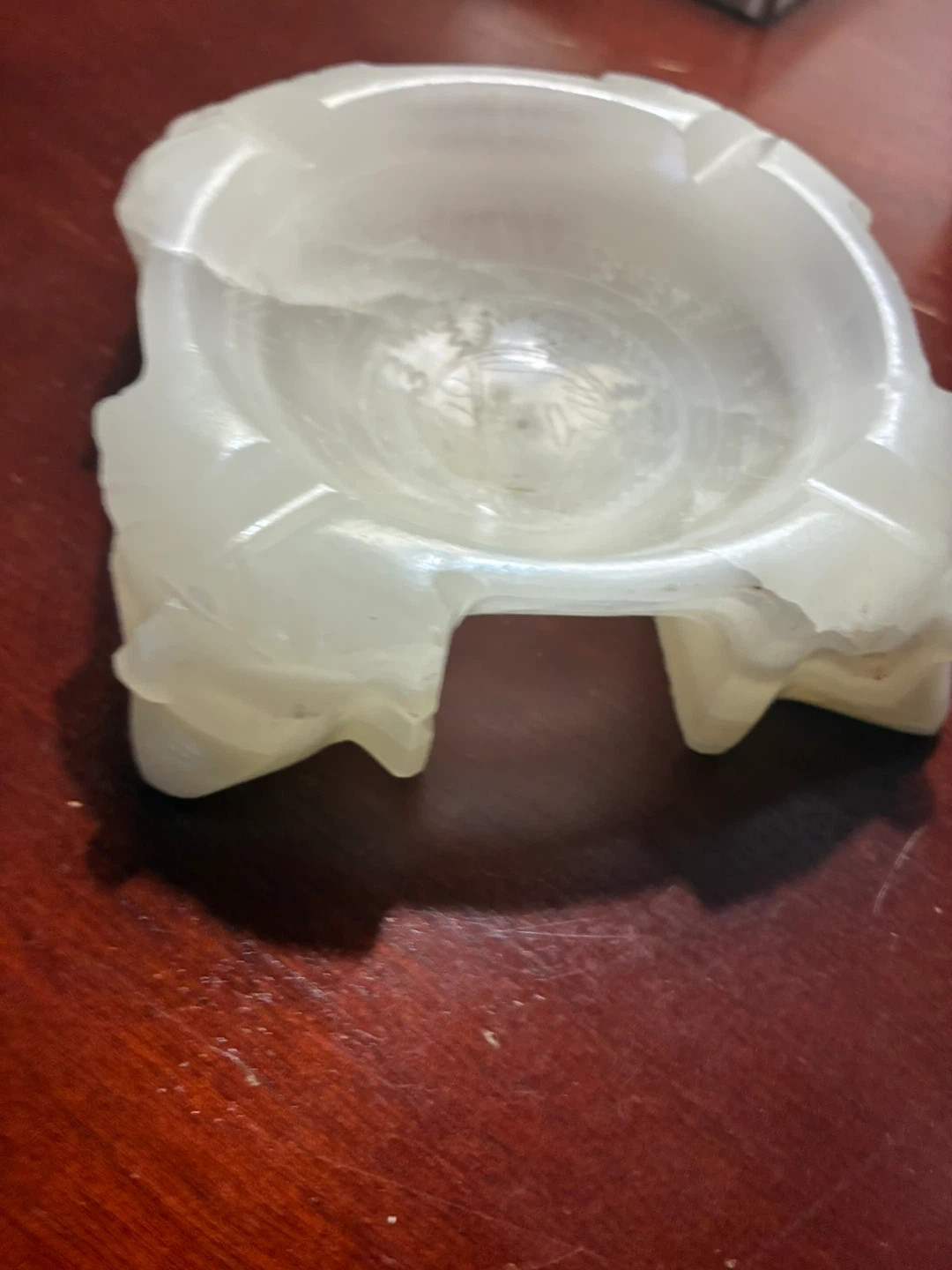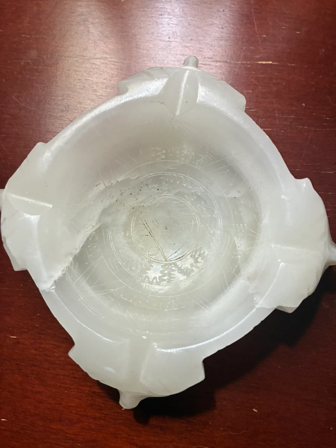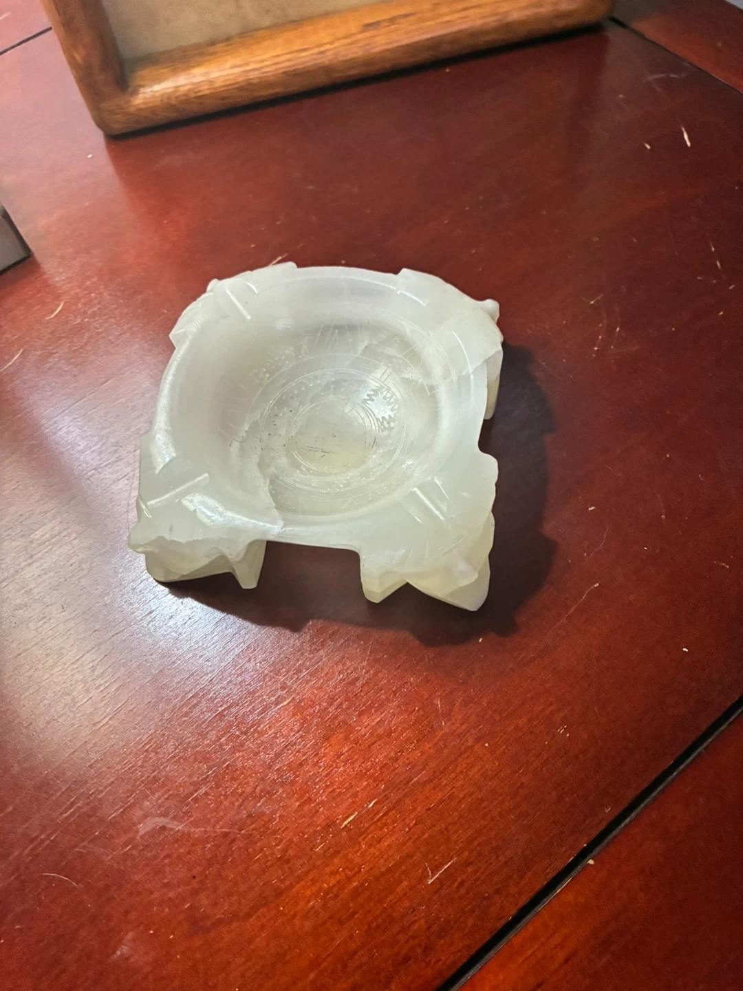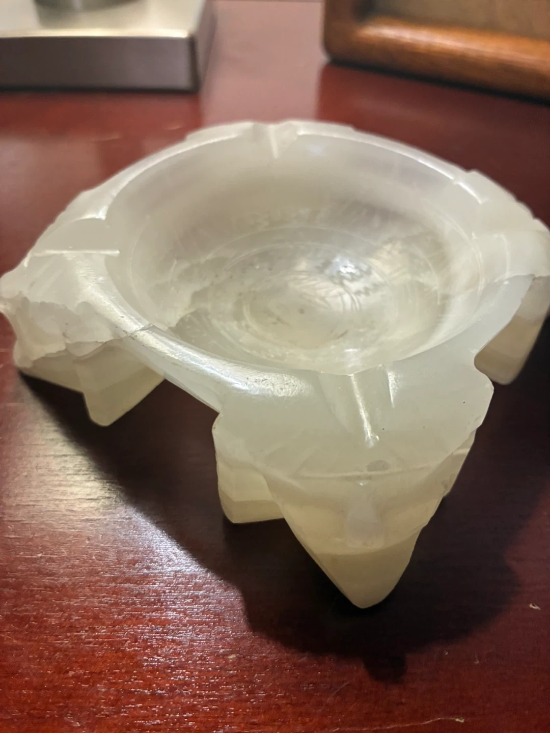 60Selling a vintage white marble ashtray with subtle engraving. It has some wear and tear but is still in good condition for use or display!