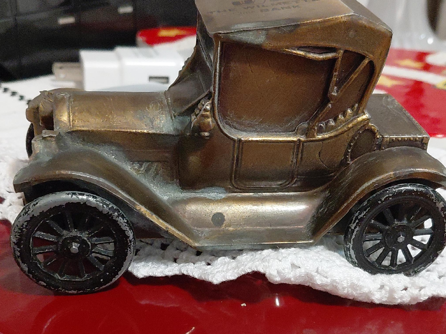 Here's a vintage brass car from The Wilmette Bank. It shows some signs of wear and age, but it's still a unique piece!