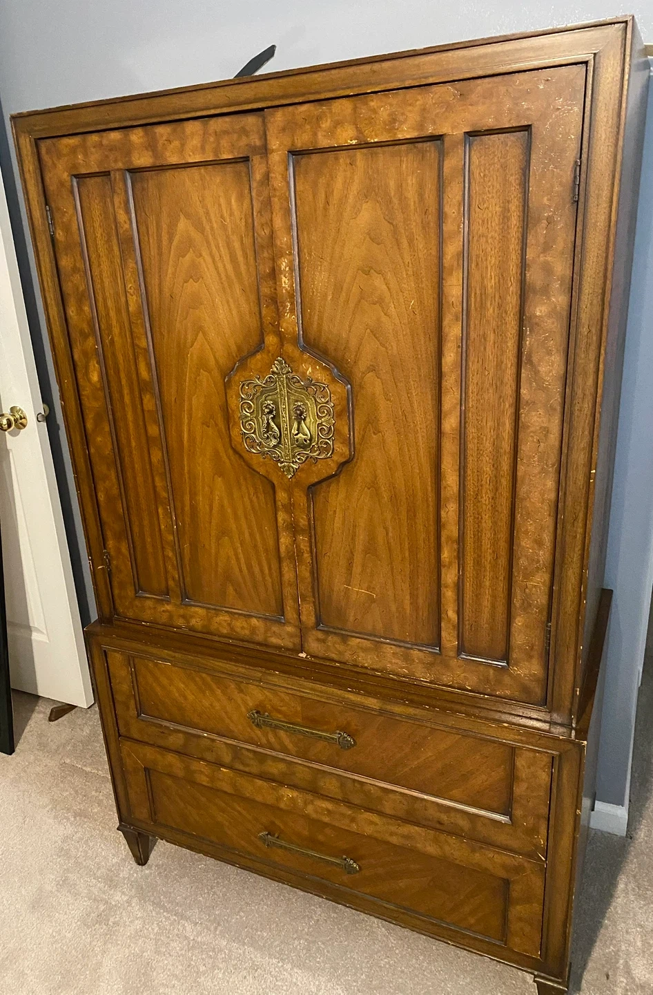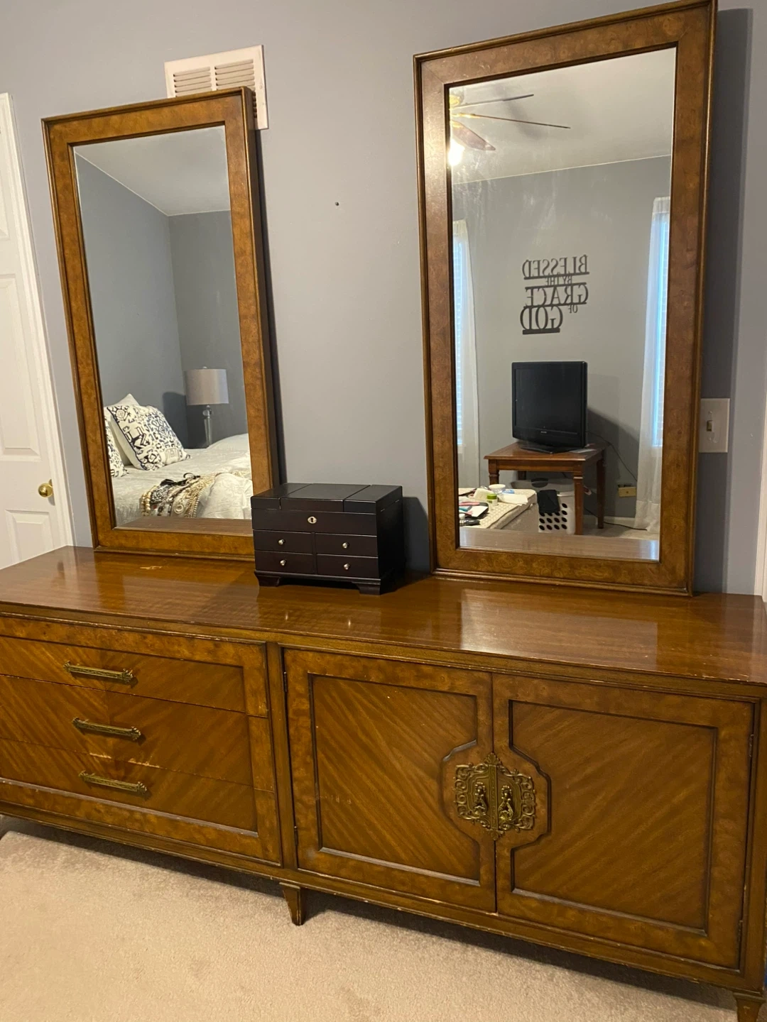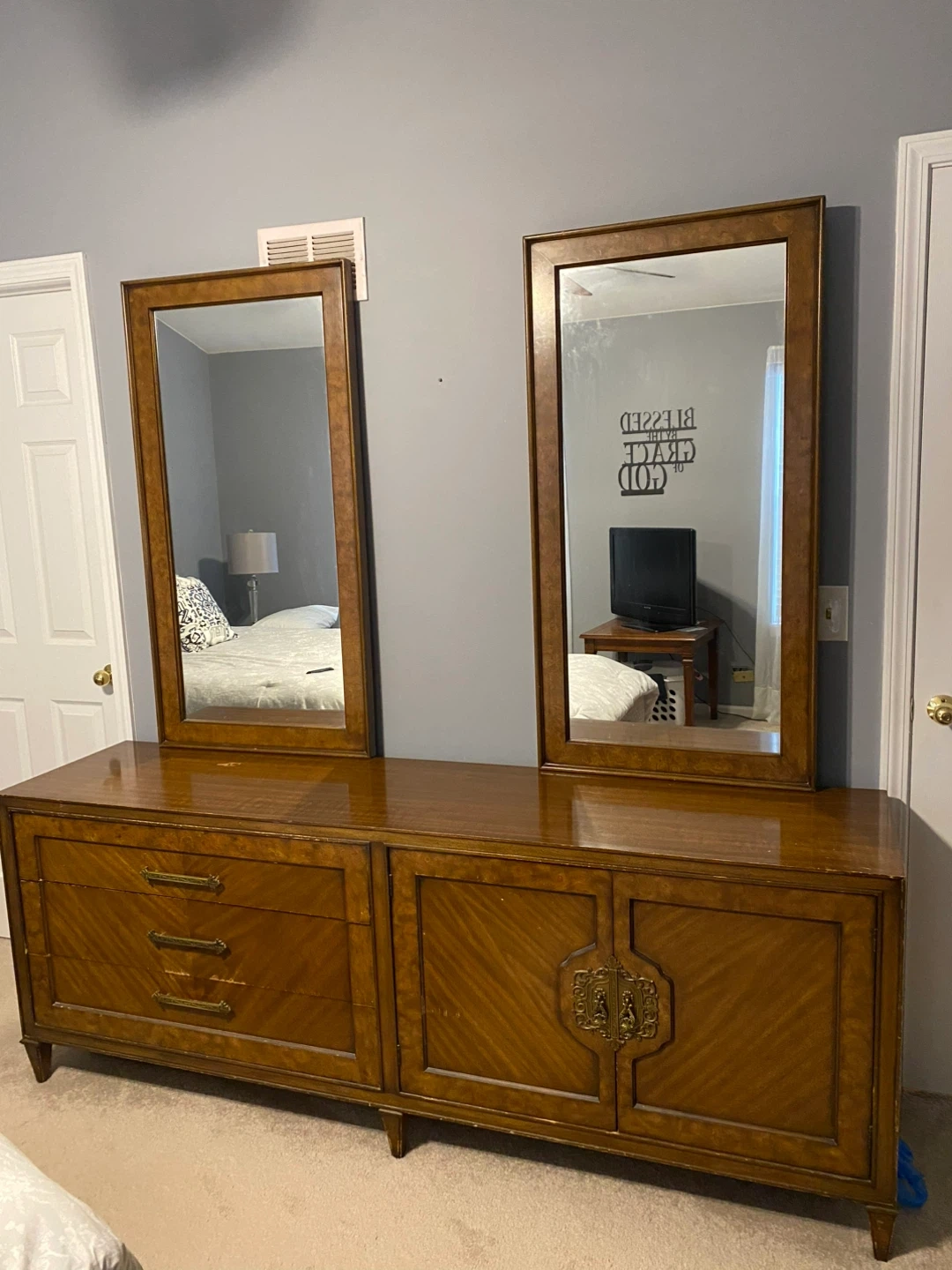 Vintage wood dresser with 2 mirrors, and armoire. It has a unique design and classic style. There are some signs of wear, but overall it's in good condition and ready for a new home! Dresser is 74 x 19 x 30“. Armoire is 36.5 x 19 x 62.5“.