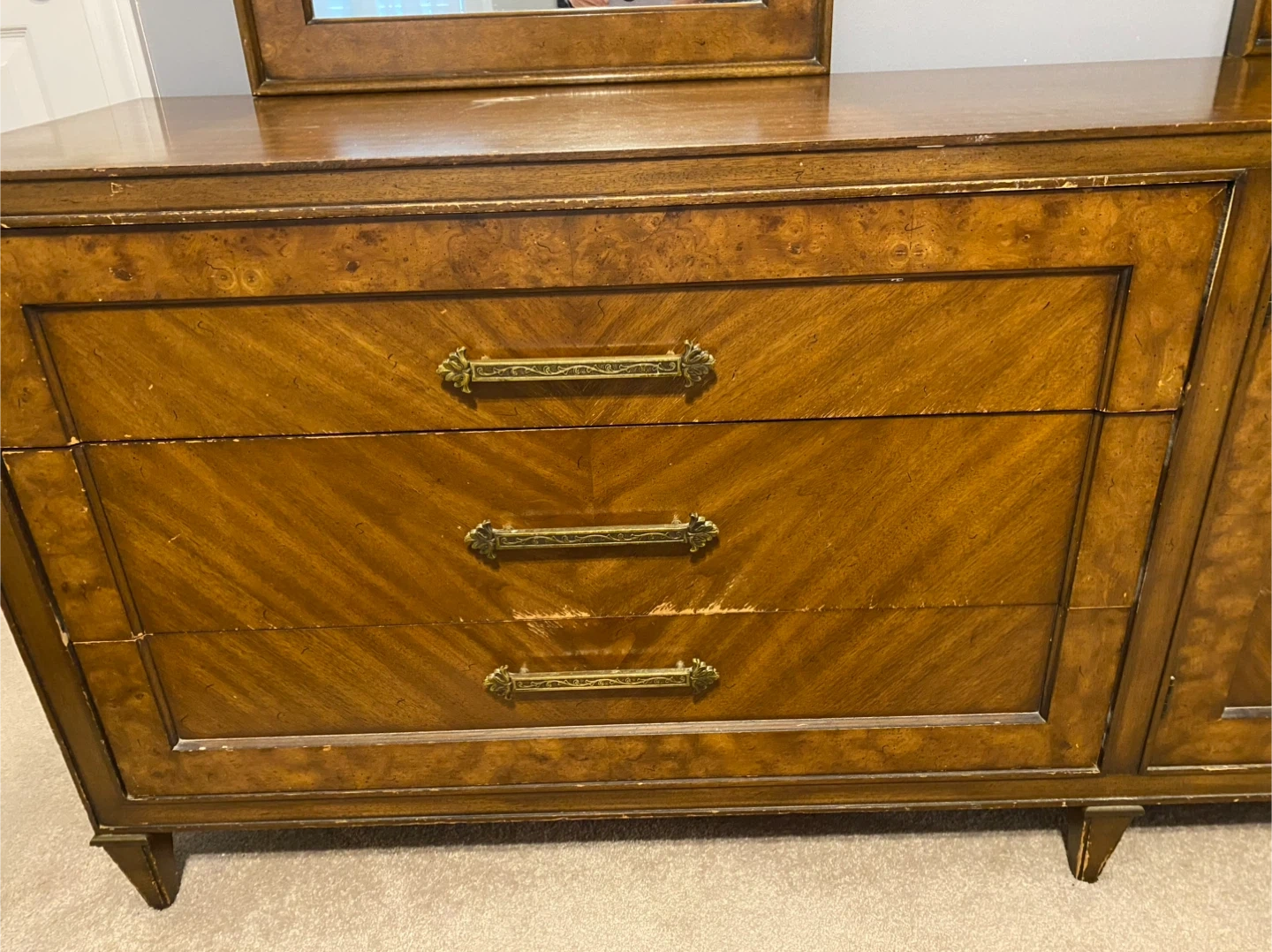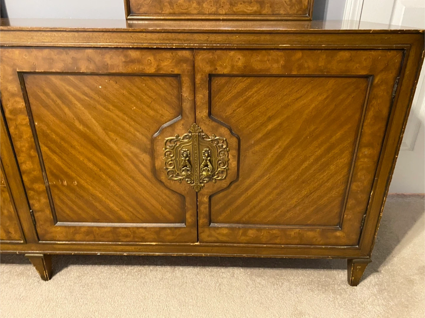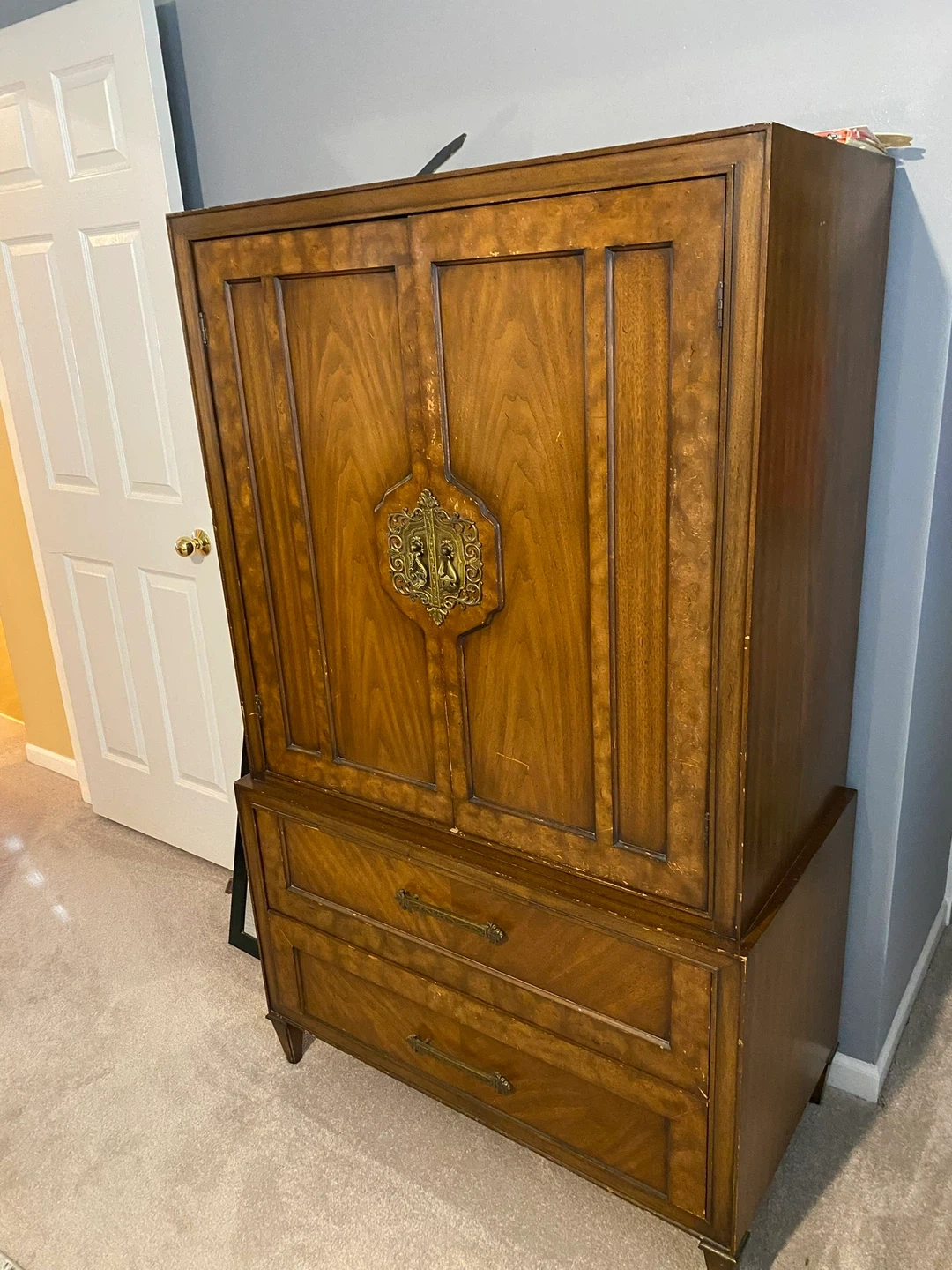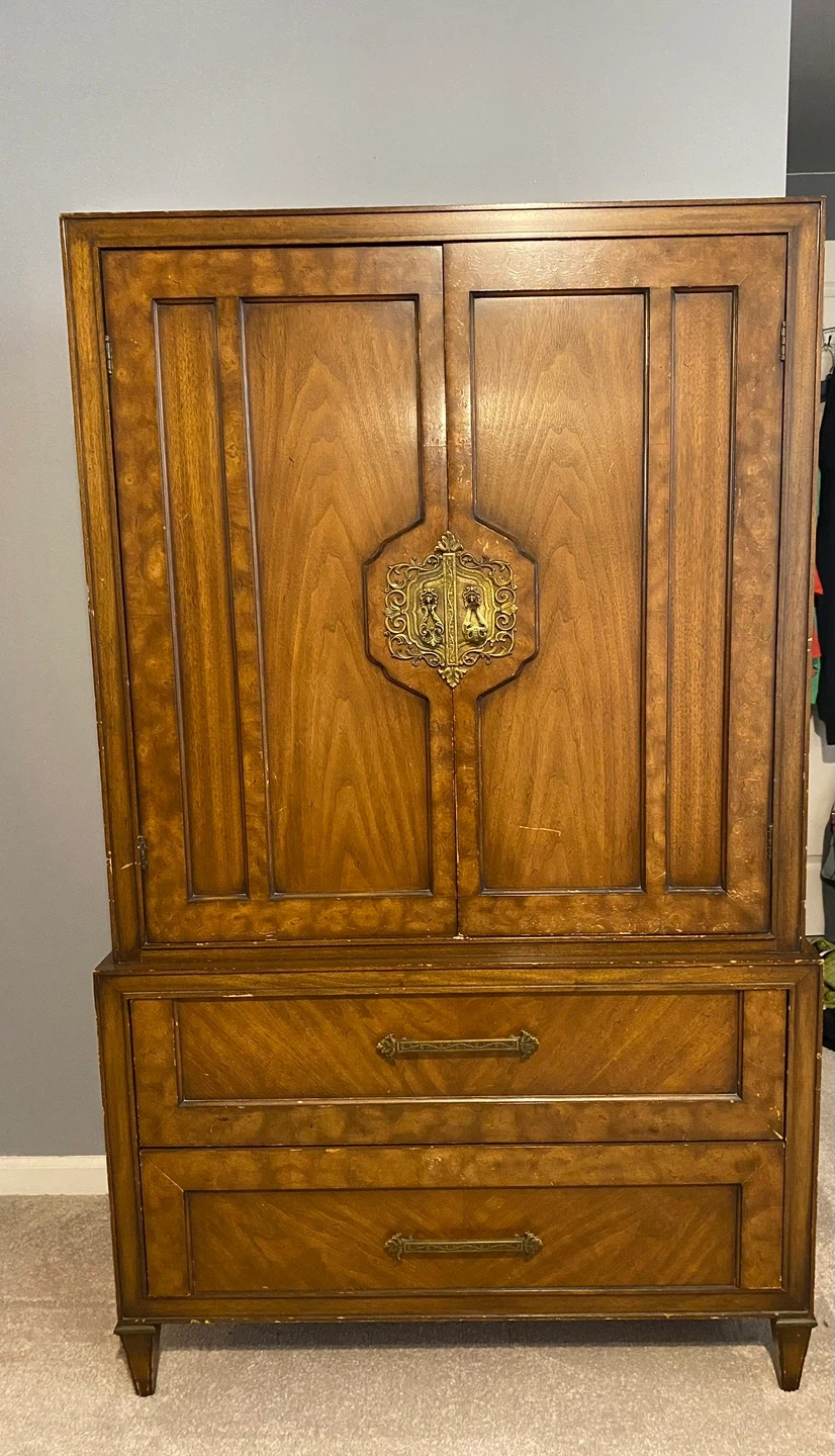 Vintage wood dresser with 2 mirrors, and armoire. It has a unique design and classic style. There are some signs of wear, but overall it's in good condition and ready for a new home! Dresser is 74 x 19 x 30“. Armoire is 36.5 x 19 x 62.5“.